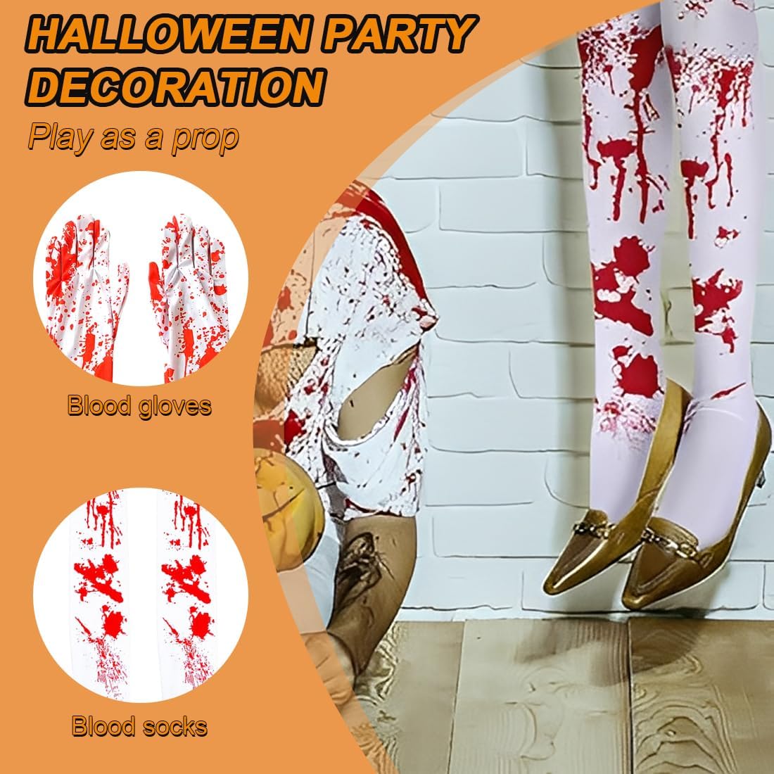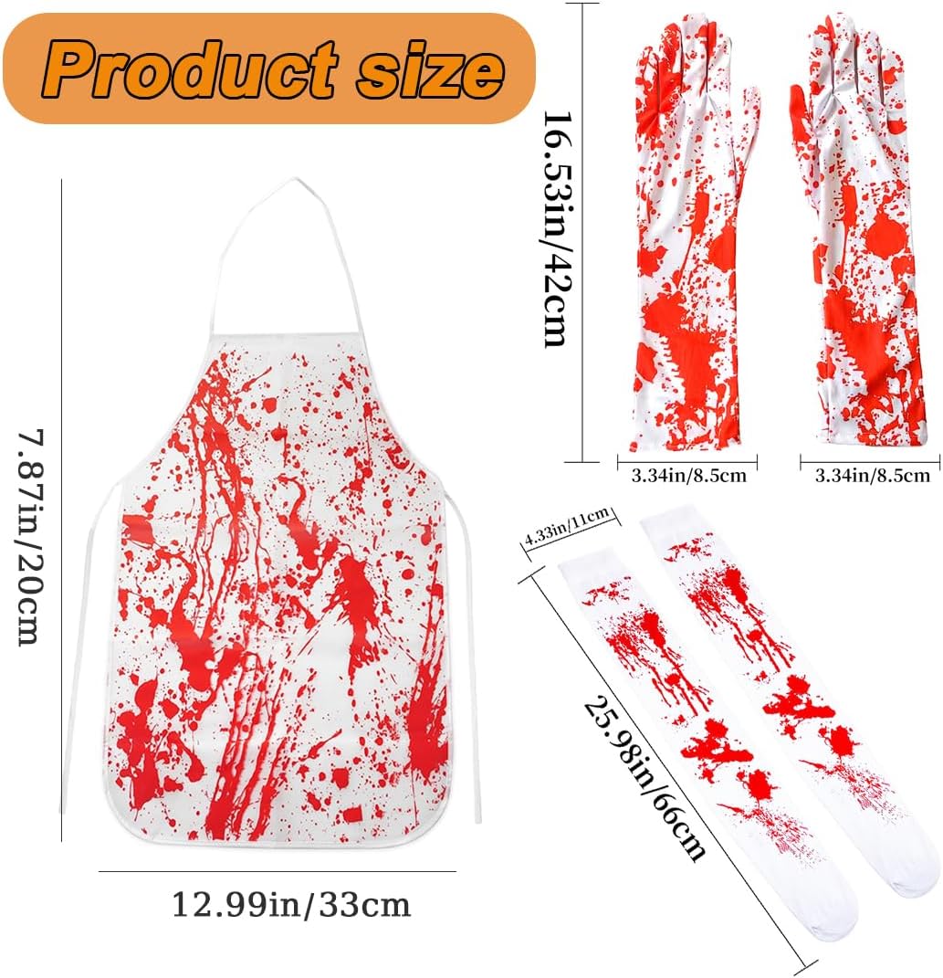 Set di costumi di Halloween: include calze, guanti e grembiule macchiato di sangue. Queste calze di Halloween macchiate di sangue sono morbide e comode, con uno spessore medio che impedisce il surriscaldamento durante l'uso. L'eccellente elasticità garantisce il mantenimento della forma. Questo completo macchiato di sangue è ideale per feste di Halloween, eventi in maschera o da indossare tutti i giorni per completare il tuo stile preferito. Materiale di alta qualità: realizzate in poliestere di alta qualità, queste calze di sangue di Halloween offrono comfort, resistenza, morbidezza e ottima elasticità. Morbide e comode da indossare. Moderatamente spesse ma traspiranti, prevengono il surriscaldamento. Grazie alla loro elasticità, si indossano e si tolgono senza sforzo. Delicate sulla pelle, sono perfette per le feste di Halloween. Design speciali: questi guanti macchiati di sangue, calzini al ginocchio di Halloween e grembiuli presentano motivi a schizzi di sangue, sfondi bianchi e disegni intricati, aggiungendo ulteriore divertimento e stile alle feste a tema Halloween. I calzini al ginocchio si abbinano facilmente a vari outfit. I calzini di Halloween completano non solo i costumi di Halloween, ma anche abiti, pantaloncini o abbigliamento quotidiano. Vestibilità universale: questi guanti presentano macchie di sangue sorprendenti per un aspetto terrificante e realistico. Le calze sopra il ginocchio offrono diverse opzioni di costume, con calze al ginocchio appositamente progettate per Halloween che si adattano a varie forme di gambe. Una volta indossate, le fantasie rivelano un effetto 3D, esaltando l'atmosfera spettrale e aggiungendo un tocco creativo alle decorazioni di Halloween. Uso versatile: guanti (42*8,5 cm), calze (66*11 cm), grembiule (70*50 cm). Il set è caratterizzato da un colore bianco di base con accenti rossi macchiati di sangue. Le calze sono adatte a varie occasioni come Halloween, case stregate, giochi di ruolo, spettacoli teatrali o altri eventi in maschera, e sono anche perfette come accessori fotografici.