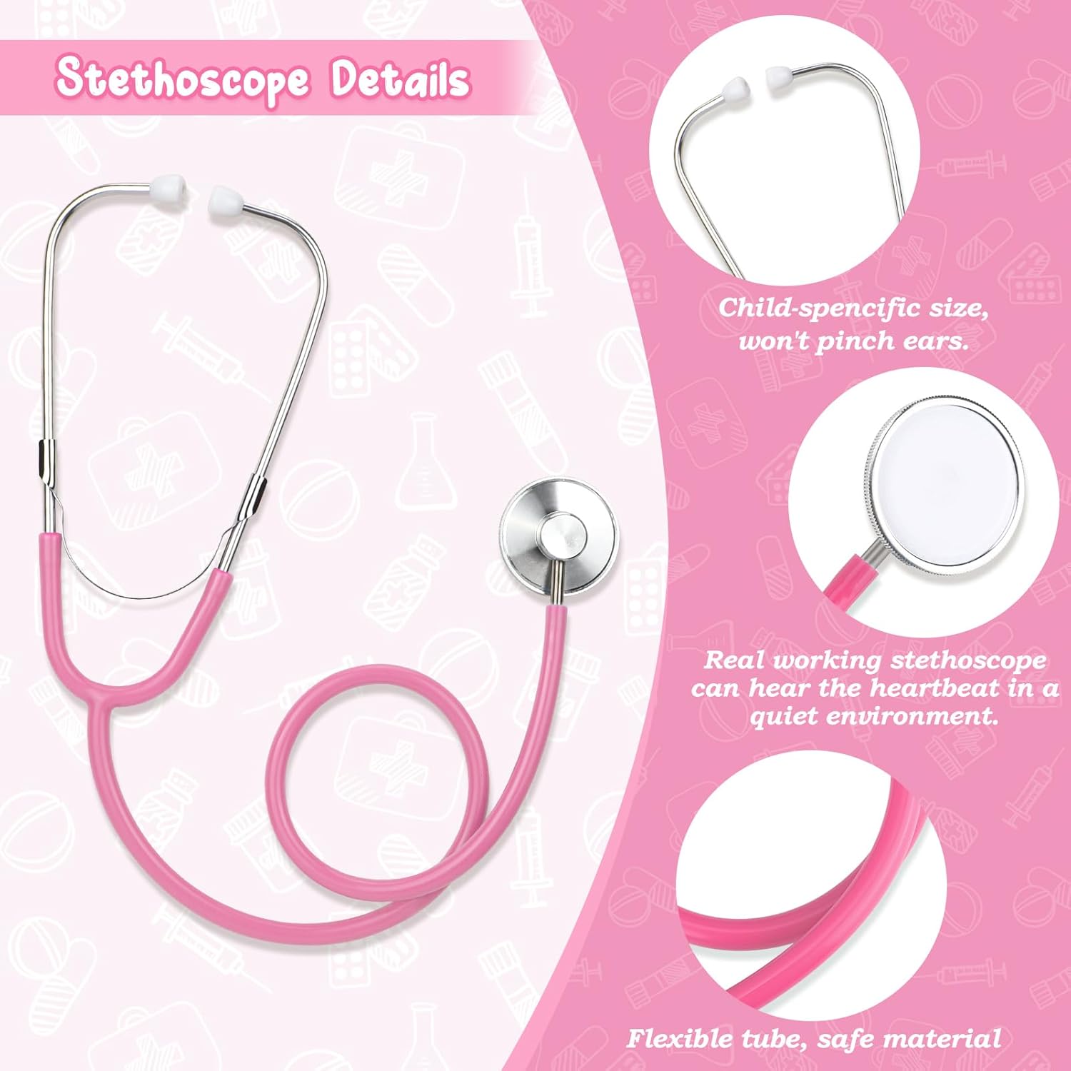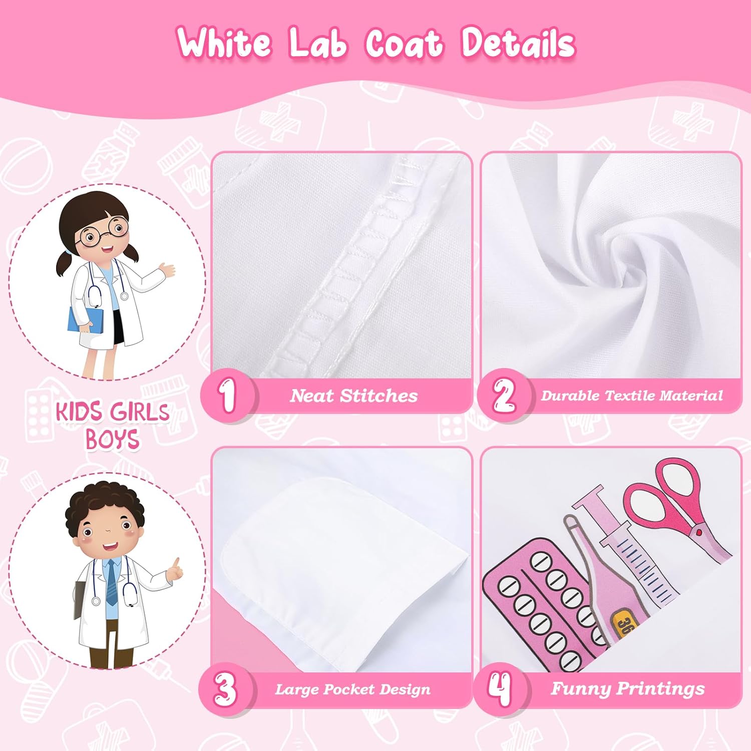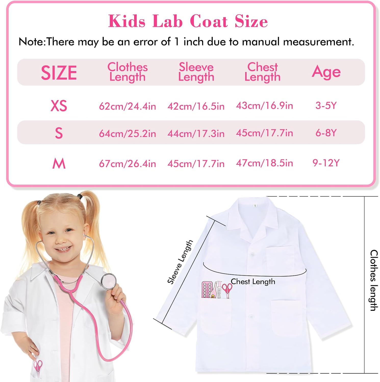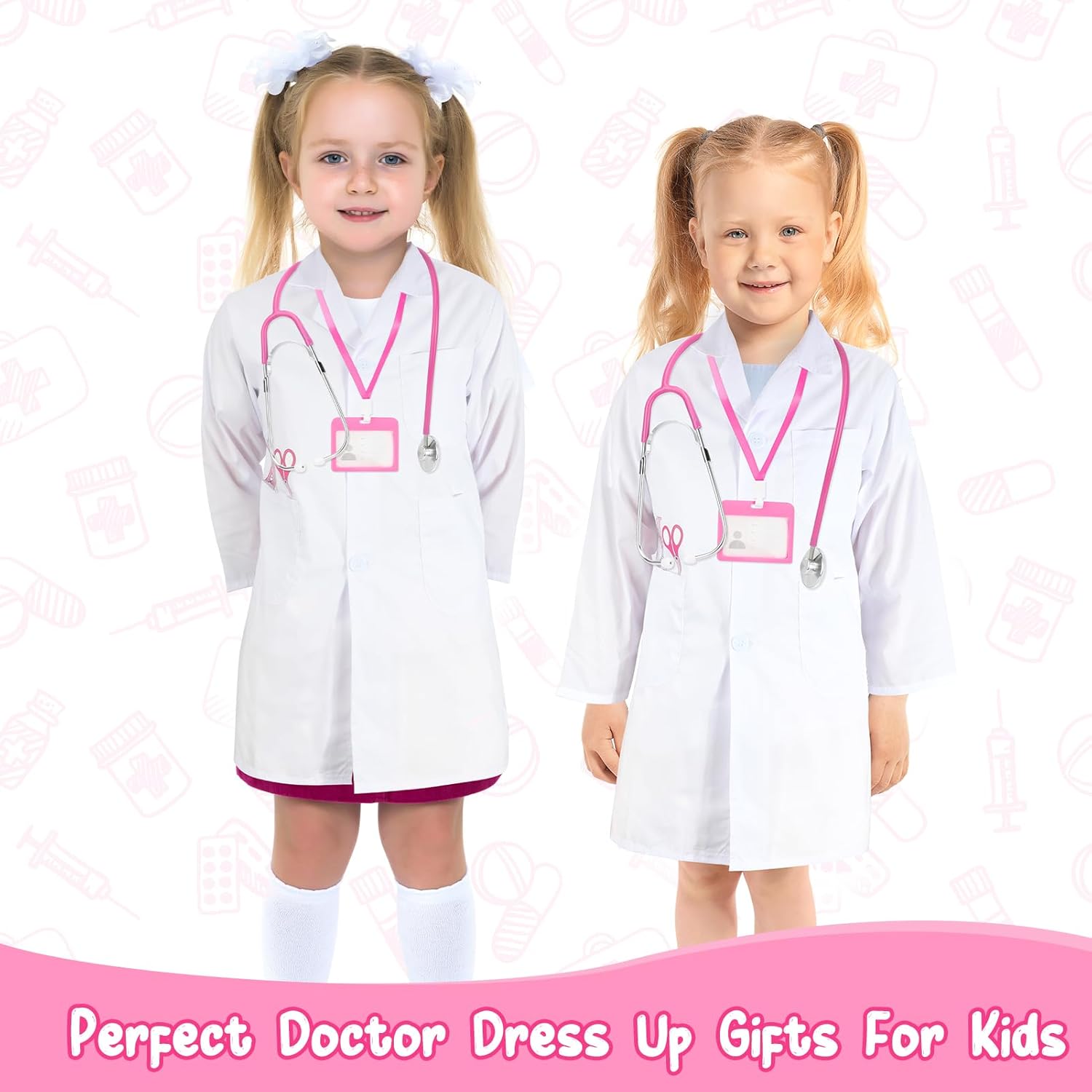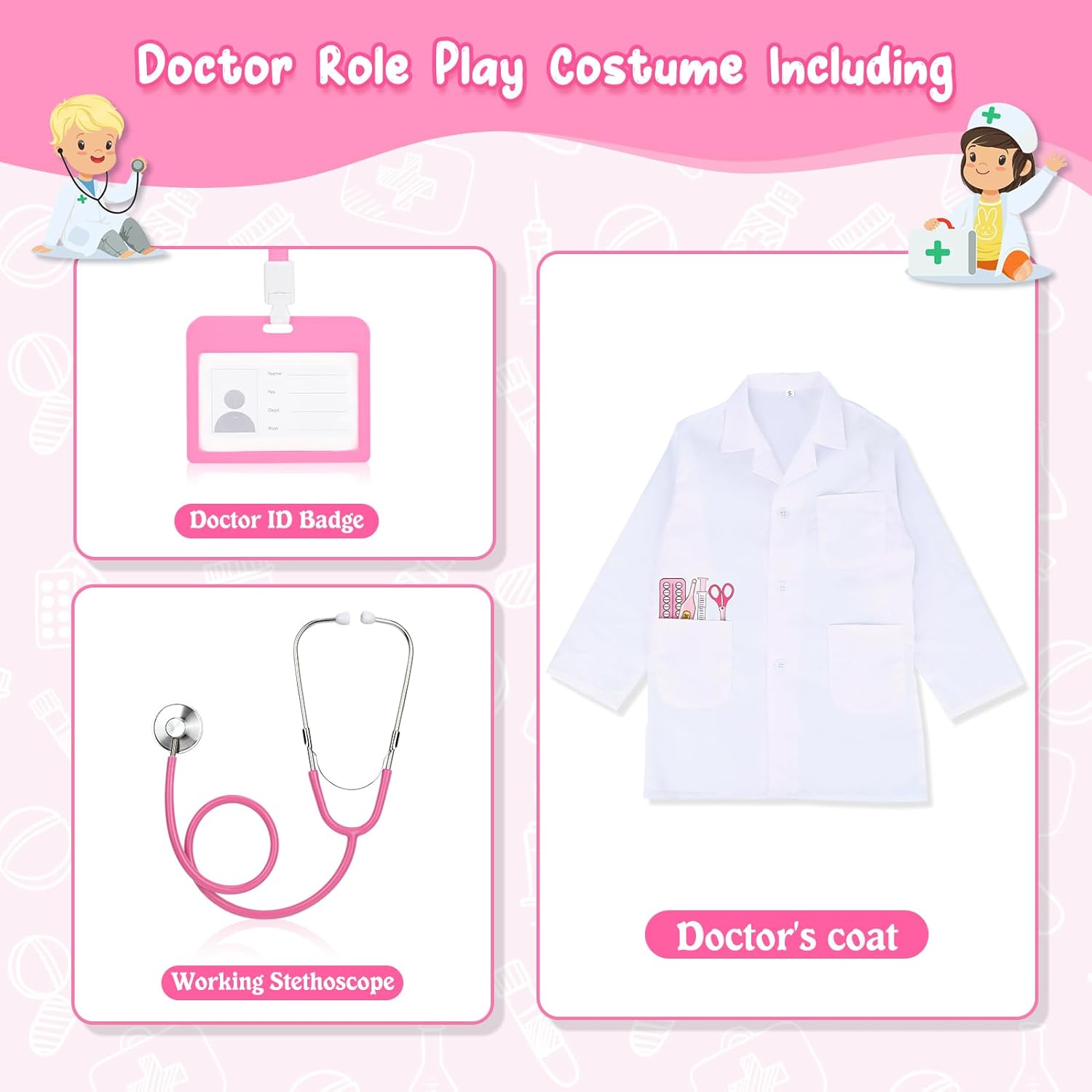 Doctor Role Play Costume - Questo è un buon set per vestire i bambini. La caratteristica della targhetta del nome ha fatto sentire i bambini come un vero dottore. Questo kit di costumi include un camice da dottore, uno stetoscopio, un porta carte di lavoro. Costume educativo e divertente: non solo questo kit di costumi è ottimo per l'immaginazione e la creatività, ma è anche un giocattolo educativo. Il tuo bambino può conoscere il corpo umano e come prendersi cura degli altri, il tutto divertendosi. Giocattolo educativo - Aiutando i bambini a superare la paura di andare dal dottore, i giochi di ruolo del medico pre-visita possono aiutare i bambini a comprendere gli esami fisici di routine, che possono anche sviluppare le loro capacità comunicative. Doctor Dress up di qualità affidabile: questo kit di costumi presenta un camice da dottore di alta qualità e resistente, realizzato con materiali morbidi e confortevoli. Gli accessori sono realizzati con materiali robusti e sicuri, assicurando che il tuo bambino possa giocare con loro per ore senza preoccupazioni.