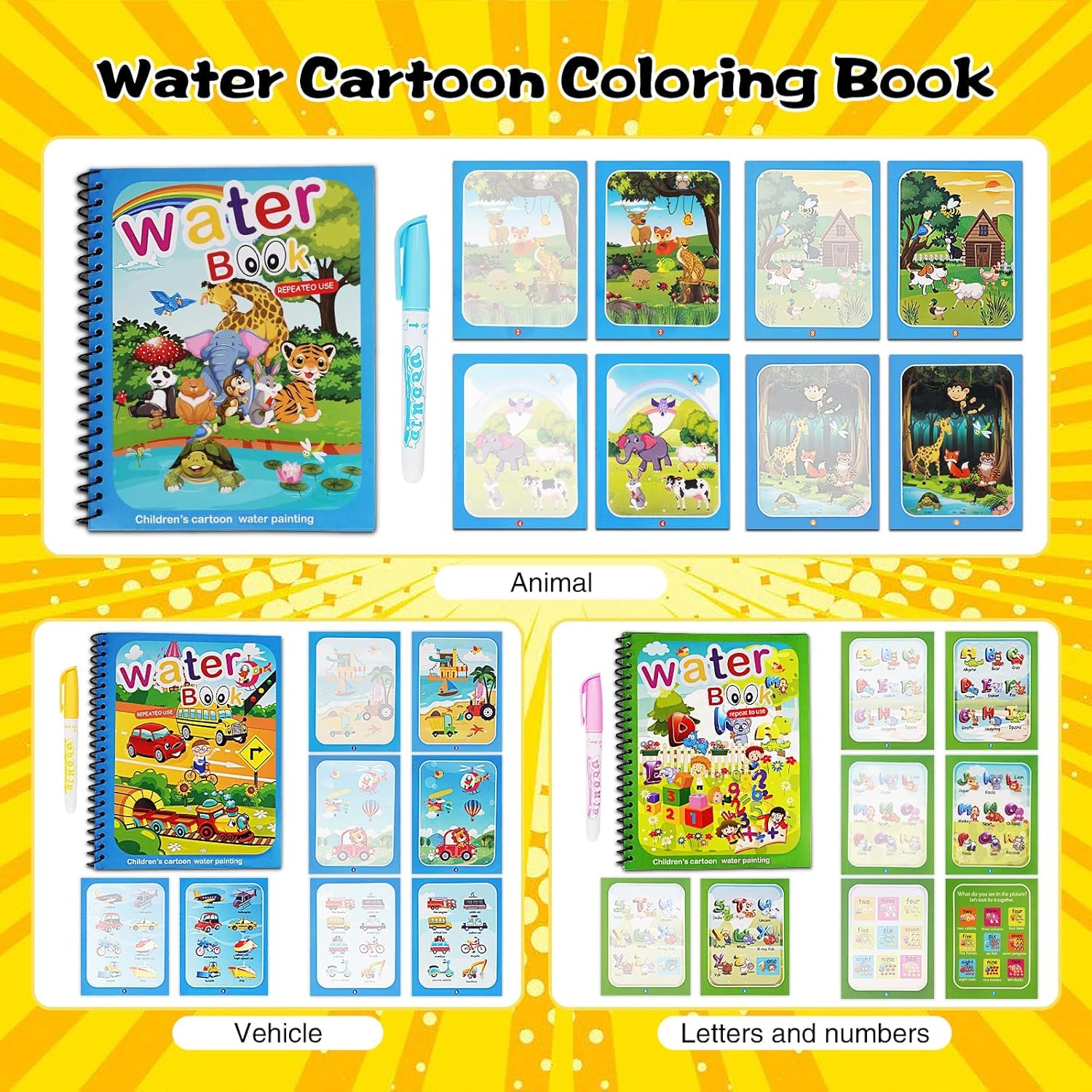 【Riutilizzabile & Eco‑friendly】: Questo libro magico ad acqua ha pagine che diventano colorate al contatto con l’acqua e, una volta asciutte, i colori spariscono in circa 5‑10 minuti. I bambini possono disegnare più volte senza sprechi di carta – un’attività sostenibile. 【Giocattolo da viaggio compatto】: Il set comprende 3 libri ad acqua compatti a tema animali, veicoli e lettere & numeri – perfetto per viaggi, in auto o nelle attese. Si inserisce facilmente in zaini piccoli. 【12 pagine di divertimento + penna ad acqua inclusa】: Ogni libro a spirale contiene 4 pagine riutilizzabili e una penna ad acqua ricaricabile, ergonomica e facile da usare – senza macchie, senza confusione. In totale 12 pagine per bambini dai 3 anni in su. 【Imparare giocando: colori & forme】: Motivi chiari e colori vivaci aiutano a riconoscere lettere, numeri e oggetti di uso quotidiano. Questo gioco educativo promuove la concentrazione, la motricità fine e la curiosità naturale. 【Regalo perfetto dai 3 anni】: Una bella sorpresa per compleanni, come idea regalo o per l’inizio della scuola – adatto a bambine e bambini dai 3 ai 5 anni che amano essere creativi e scoprire cose nuove.