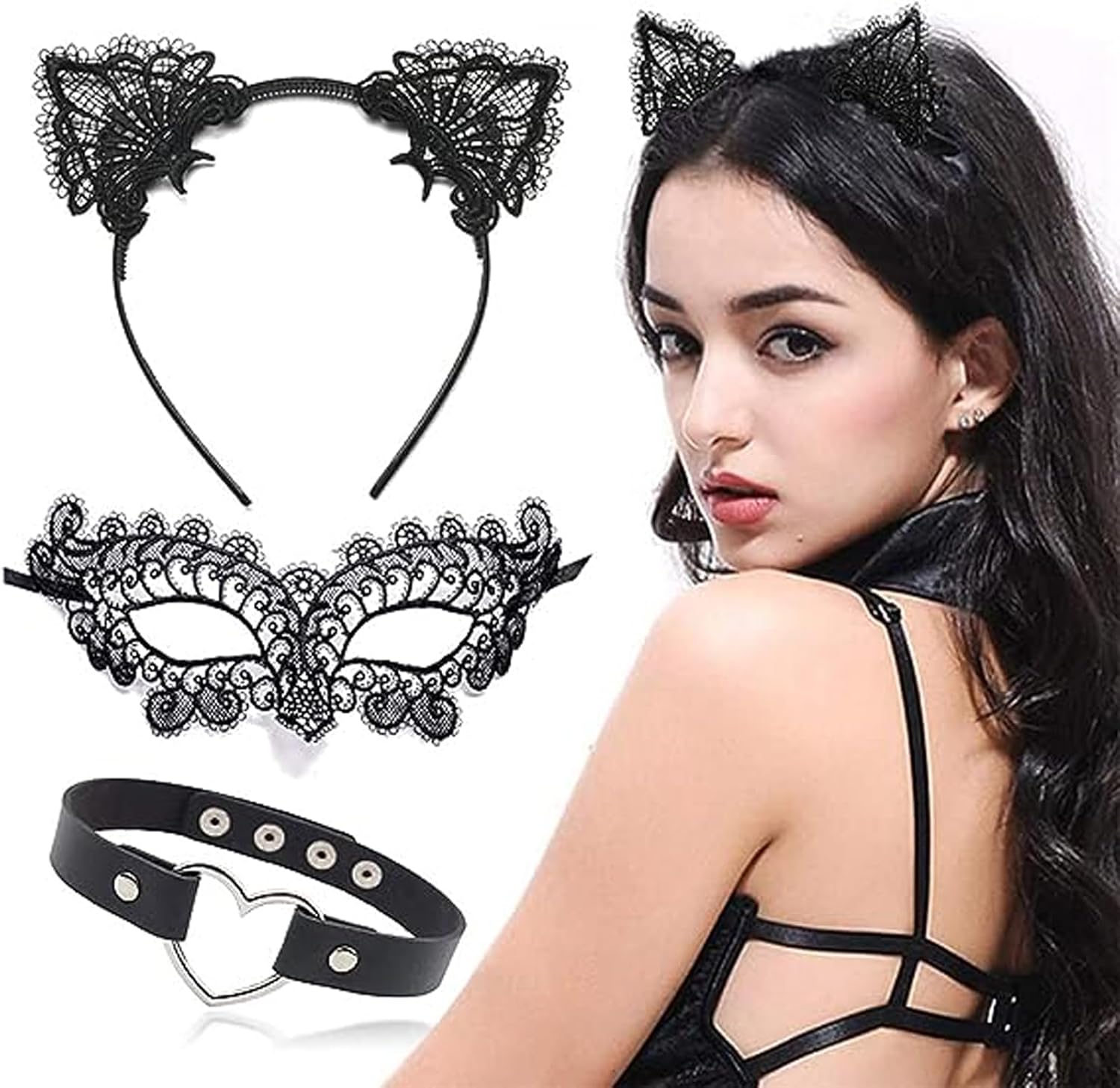 Signore e signori, siate l'anima della festa con questa splendida maschera in pizzo! - La maschera per travestimento alla moda e sexy è morbida, traspirante e comoda da indossare tutto il giorno, aggiungendo un elemento di eleganza e raffinatezza. - Le nostre fasce e maschere presentano squisiti disegni cavi, abbinati a una bellissima collana girocollo a forma di cuore, che ti rende più sexy e misteriosa e ti fa sembrare elegante e affascinante. - Decorazione perfetta per feste in maschera, feste di Halloween, feste di carnevale, eventi in maschera, feste di compleanno, cosplay, cocktail party e altro ancora. Specifica: Materiale: Pizzo, lega Colore: Nero Taglia: Taglia unica Il pacchetto include: 1 × Cerchietto Orecchie Gatto 1 × Maschera in pizzo 1 × Collana a forma di cuore