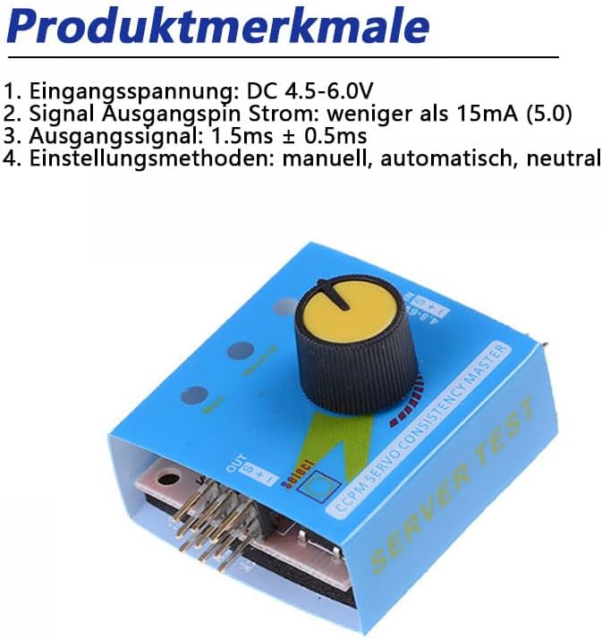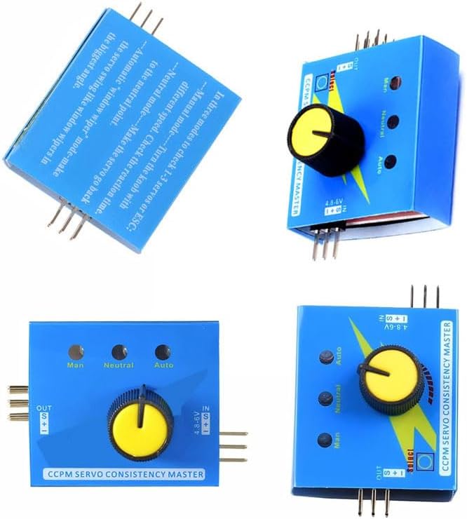 RC Motor Servo Tester per testare servo analogico e digitale e controllare il regolatore. Fornisce un modo semplice per testare i tuoi servo senza influenzare il resto della tua elettronica. Il solido servo tester con display a 3 modalità e 3 metodi di regolazione della tensione di ingresso manuale, automatica e neutra va da 4,8 a 6 V. Questo tester servo può essere utilizzato come generatore di segnale per il regolatore di velocità elettrico (ESC), quindi è possibile controllare il sistema di movimento senza trasmettitore e ricevitore. Può collegare servo di gruppo o regolatori elettronici di velocità, buon controllo del microcomputer a chip singolo, buona stabilità, alta precisione. Ruotare la manopola per rilevare il servo.