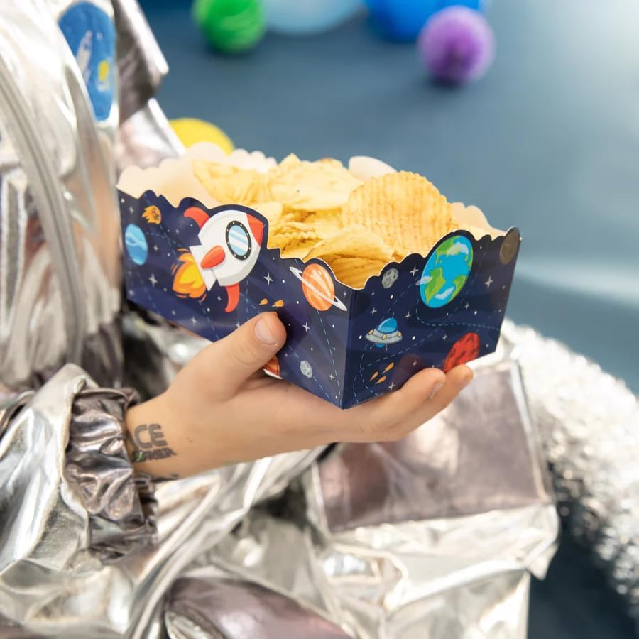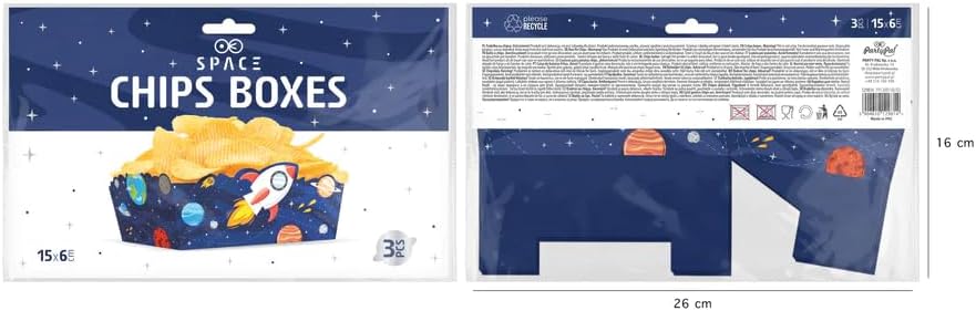 3 scatole *KOSMOS* per patatine fritte/patatine fritte e molto altro. perfetto per feste e compleanni dei bambini ✔ Dimensioni: ca. 15x6 cm; Materiale: cartone stampato colorato ✔ Spazio sufficiente per tanti piccoli regali, caramelle e regalini! ✔ Produttore: dall'UE ✔ Per questa serie sono disponibili altre decorazioni abbinate (piatti, tazze, tovaglioli e molto altro) ✔