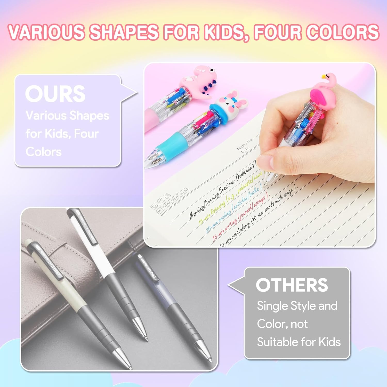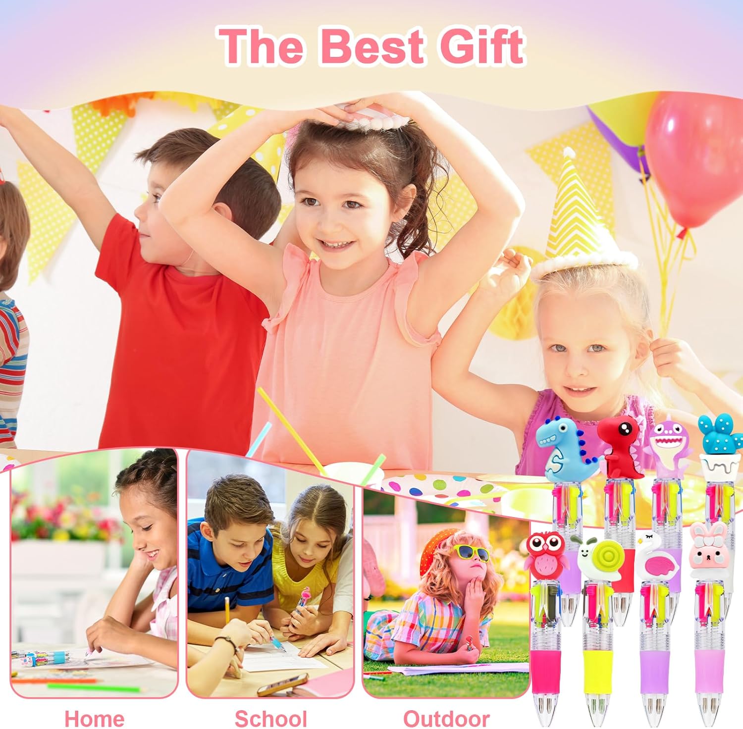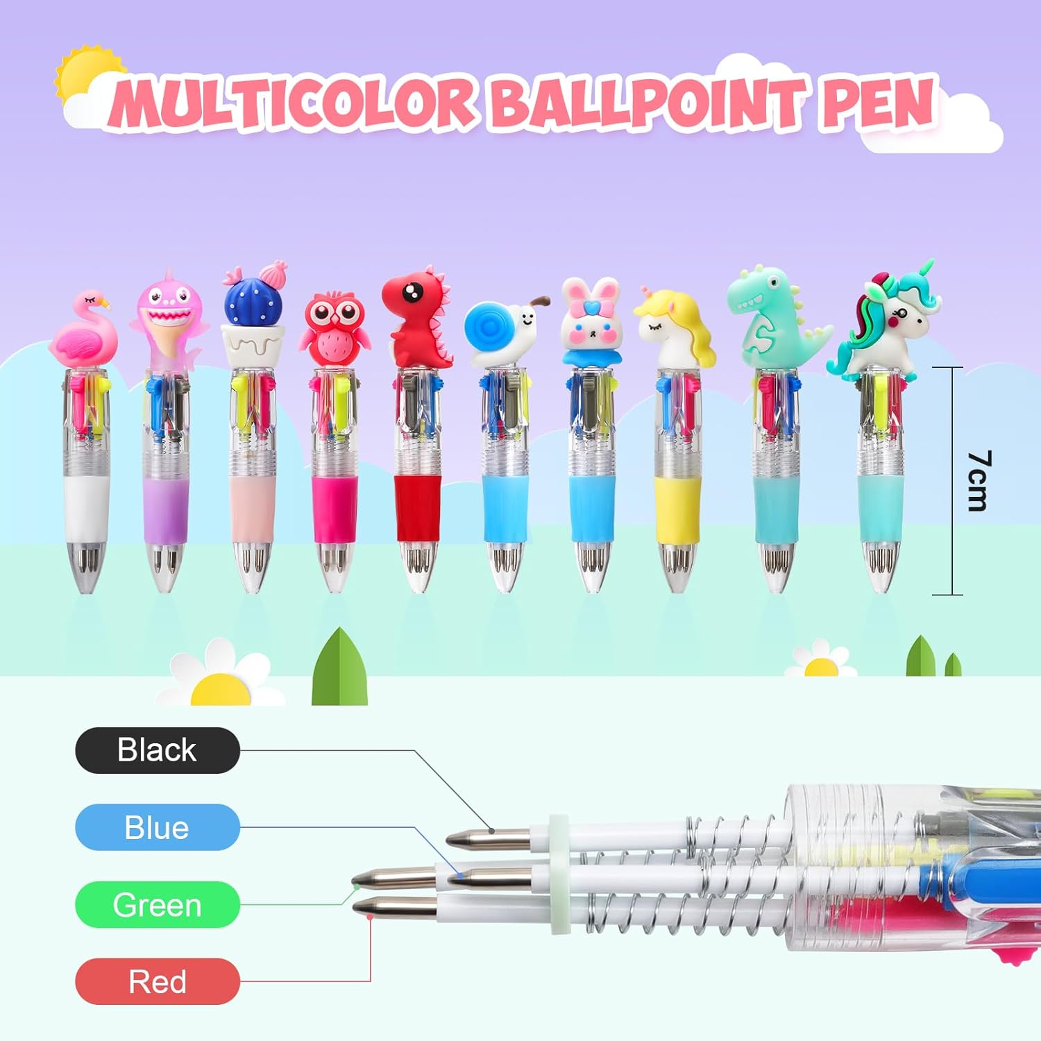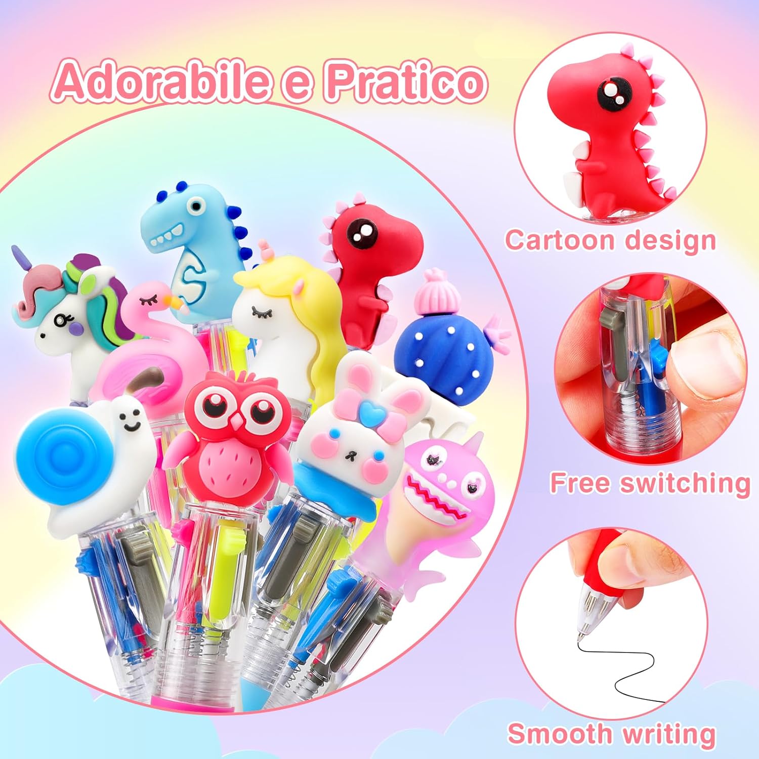 30 Mini Penne Bambini: 30PCS 4 colori penne in una scatola, un'aggiunta versatile e vivace alla tua collezione di articoli di cancelleria, che può essere un penne gadget compleanno bambini e possono soddisfare le preferenze di bambini diversi. È un perfetto regalino fine festa compleanno che farà brillare ogni giorno come fosse speciale. Penne Multicolore 4-in-1 Retrattileanimale: Con un esclusivo design 4 in 1, puoi cambiare il colore senza cambiare la penna. Passa tra rosso, giallo, blu, e grigio per stimolare la creatività e l'immaginazione dei bambini e il divertimento della scrittura colorata in qualsiasi momento e ovunque. Queste mini penne multicolore sono ideali per regali fine festa compleanno bambini. Design Adorabile: Ogni penne multicolore adotta un simpatico design da cartone animato, tra una serie di motivi diversi: unicorno, dinosauro, gufo, fenicottero, coniglio, lumaca, cactus, ecc., con colori vivaci, possono soddisfare le preferenze di bambini diversi, molto belle per regalini compleanno bambini invitati, piccole ma proprio graziose. Materiale di Qualità: Penna multicolore bambini realizzato con inchiostro di alta qualità, plastica inodore, senza piombo, non tossico, innocuo per il corpo umano, per un uso a lungo termine, sono il regalo perfetto per gadget festa compleanno bambini! Regalini Fine Festa Compleanno Bambini: Queste penne bambini sono adatte per feste regalo, festa compleanno per bambini, riempitivi per sacchetti di festa, battesimo, giorno di natale, festa in giardino, premi per la scuola, ideale per gadget compleanno bambini 3-10 anni e per regali fine compleanno bambini.