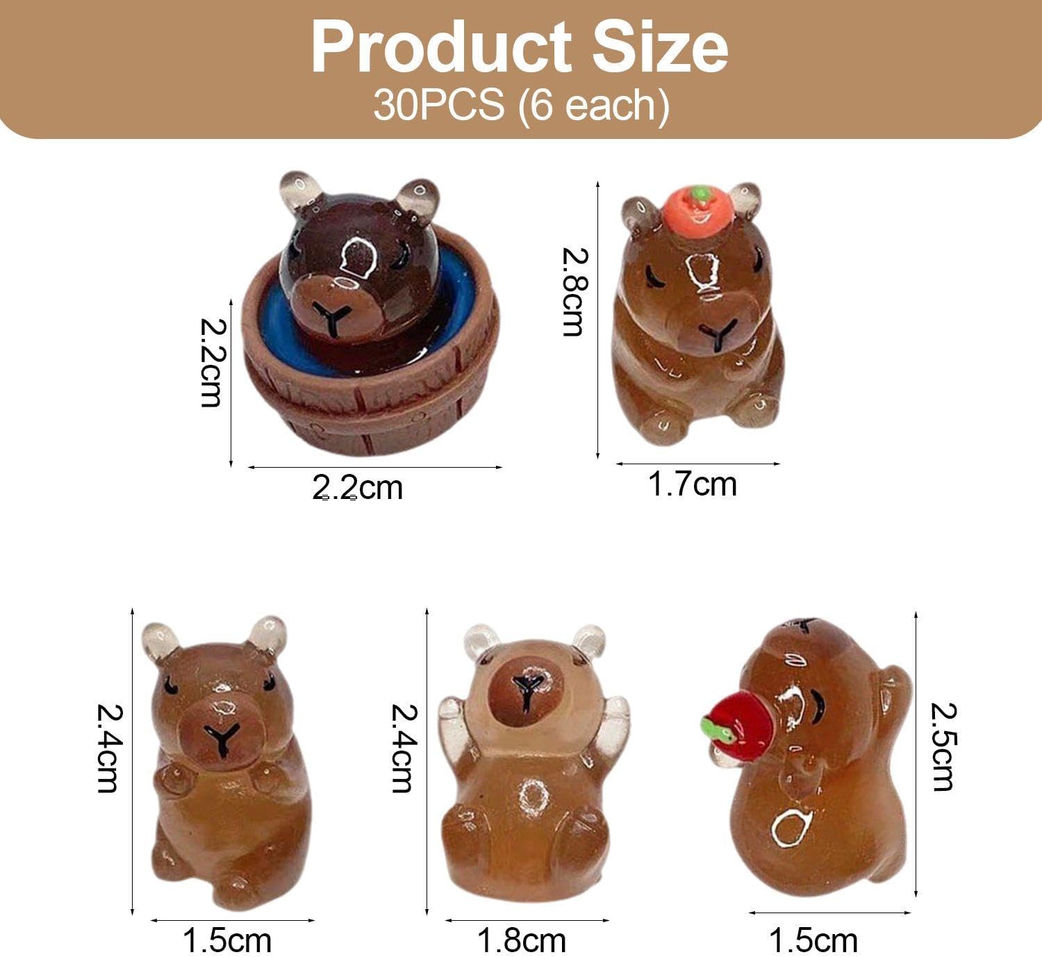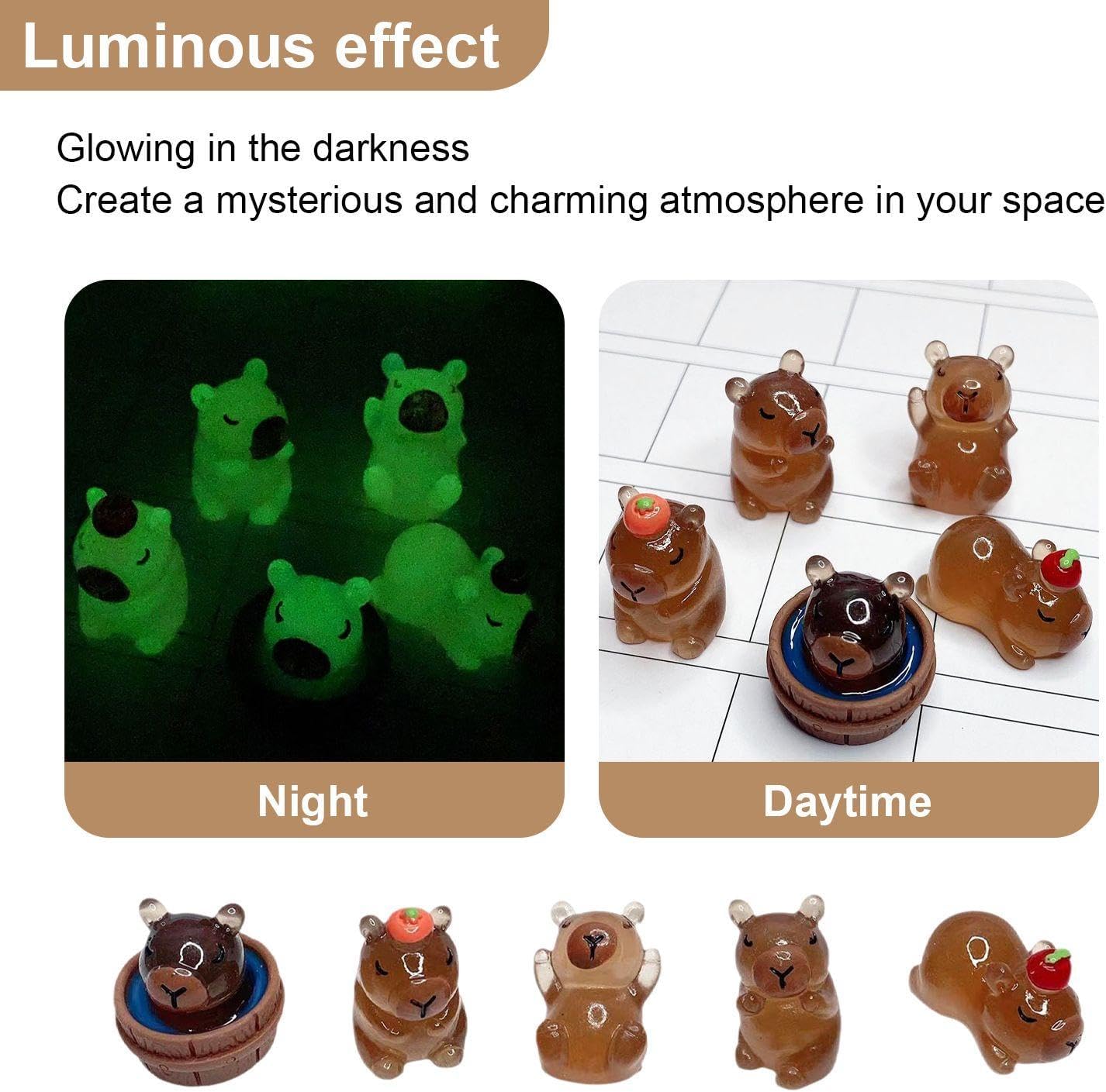 【Contenuto Del Prodotto】 Riceverai 30 Ornamenti Capybara Luminescenti. Ogni Pezzo Ha Dimensioni Di Circa 1, 5-2, 7 Cm, Di Colore Marrone, Resina Nel Materiale E Contiene 5 Stili (6 Pezzi Ciascuno). 【Materiale Del Prodotto】 Questo Prodotto È Realizzato In Resina, Che È Resistente E Rispettoso Dell'Ambiente. Il Materiale In Resina Rende L'Ornamento Leggero E Facile Da Mantenere, Pur Avendo Buoni Effetti Decorativi. 【Design Creativo】 Il Design Del Prodotto È Unico E Carino, La Forma Di Capybara È Vivida E L'Effetto Luminoso È Sorprendente. La Varietà Di Stili E Mini Dimensioni Lo Rendono Una Decorazione Ideale Per Giardini, Tavoli E Varie Occasioni. 【Facile Da Posizionare】 Questo Prodotto È Compatto E Facile Da Posizionare E Muoversi. Puoi Metterlo In Giardino, Desktop O Altrove In Base Alle Tue Preferenze E Cambiare Il Layout In Qualsiasi Momento. 【Ampiamente Utilizzato】 Questo Prodotto È Ideale Per La Decorazione Domestica, La Decorazione Del Giardino O La Decorazione Del Desktop. Non Solo Aggiungono Al Divertimento Dell'Ambiente, Ma Sono Anche Adatti Come Regali Per Amici E Familiari.