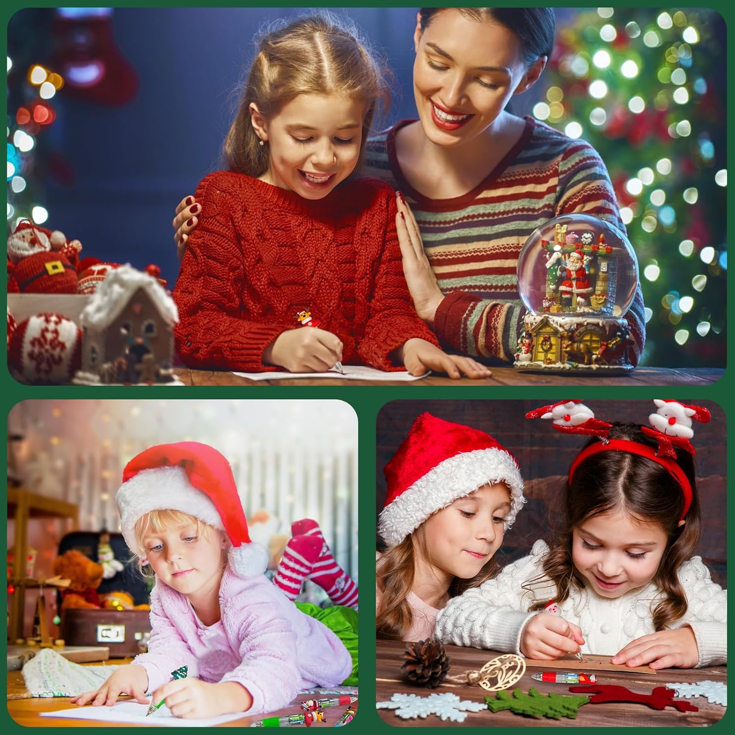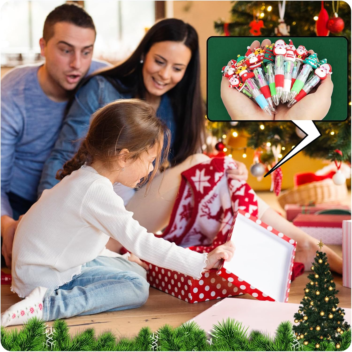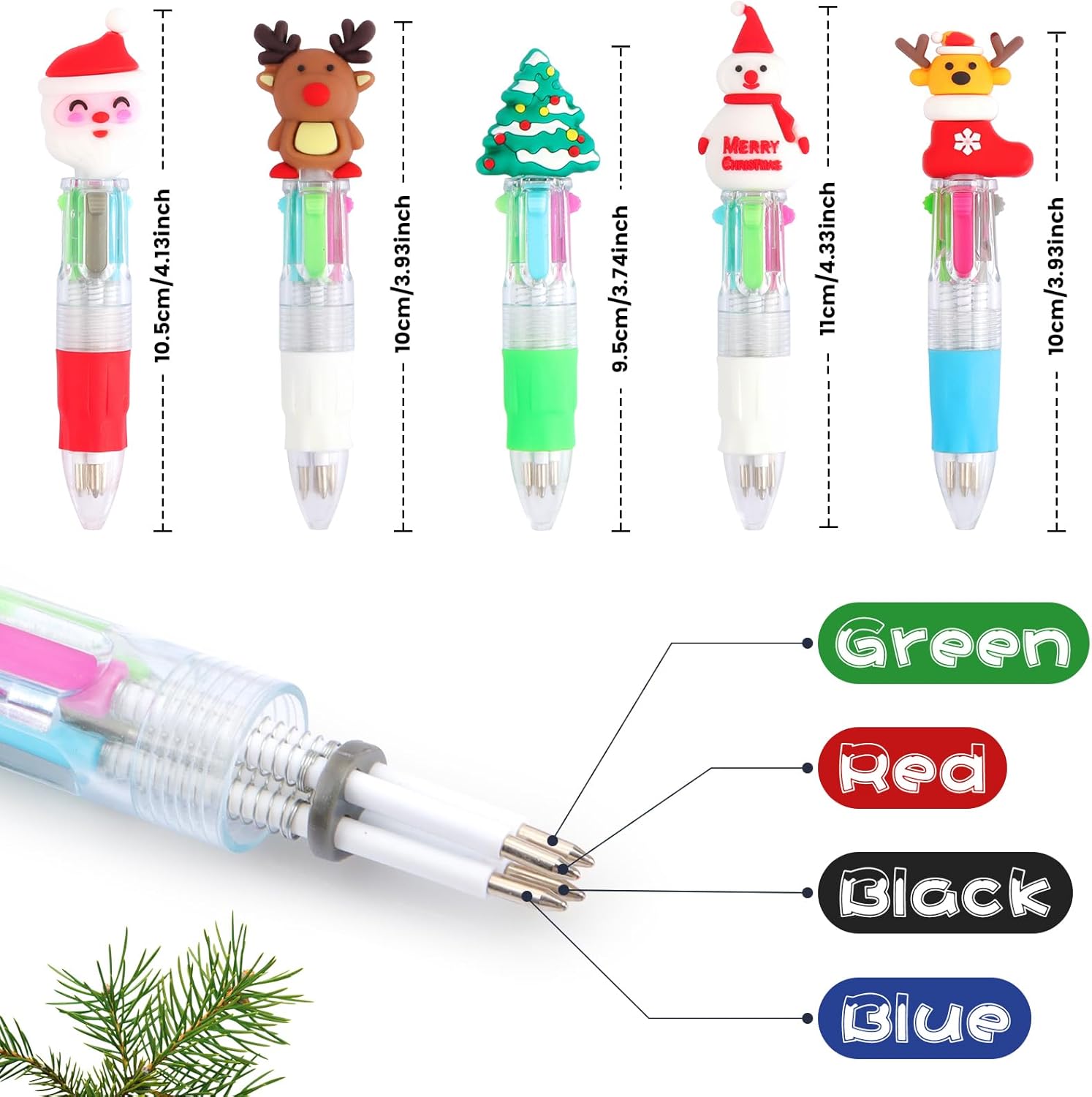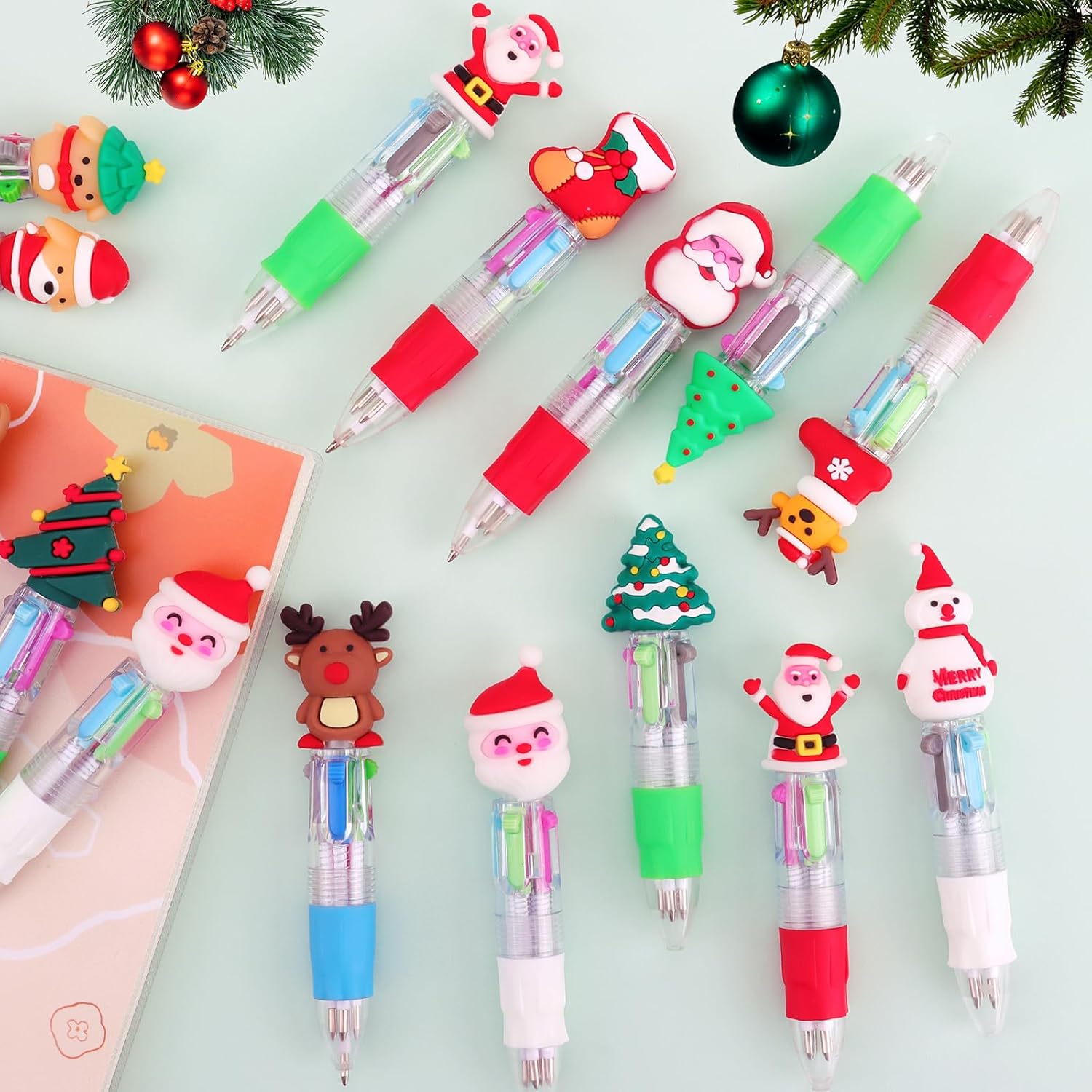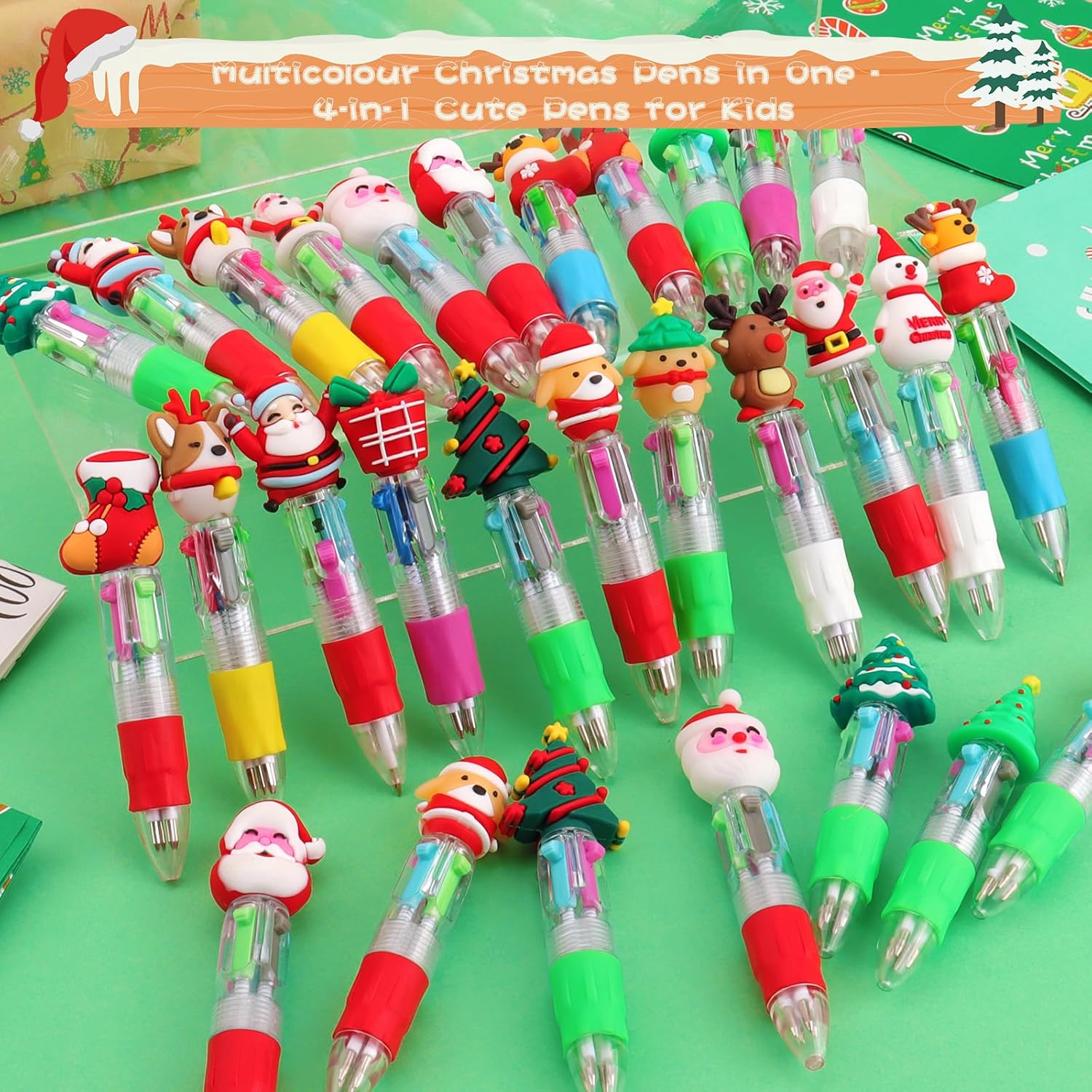【Penne a sfera Multicolore Natalizie】La confezione include 30 penne multicolore natalizie per bambini con 30 tappi, I modelli di tappo includono Babbo Natale, albero di Natale, renna, pupazzo di neve e così via. Sul cappuccio hanno dei carinissimi pupazzetti Natale in gomma morbida intercambiabili da penna a penna. Perfetto come Regali di Natale per bambini. 【Penne natalizie classiche a 4 colori】Le nostre penne multicolore natalizie per bambini offrono inchiostri in blu, rosso, verde e nero, facendone delle penne divertenti per bambini. Il tratto è scorrevole e nitido, scorrono in modo fluido, e non macchiano il retro del foglio, divertenti da usare. Ogni penna natalizia aggiunge un tocco di gioia alle festività, ideale per accessori per feste natalizie. 【Materiali sicuri e di alta qualità】Penne natalizia bambini realizzato con inchiostro di alta qualità, plastica inodore, senza piombo, non tossico, innocuo per il corpo umano. Design carino con una scrittura fluente. 4 colori di ricarica in un cilindro rotondo e il design a molla consente di passare facilmente da un colore all'altro. Sono studiate per le mani dei bimbi grazie anche al segmento gommato antiscivolo, Morbido e confortevole. 【Regalo di Natale perfetto】Queste Penne natalizia per bambini sono l'idea perfetta per Idee regalo per bambini e possono essere regalate come Regali di Natale per bambini. Il design adorabile e i colori vivaci possono attirare molto i bambini, puoi inviarli ai tuoi compagni di classe, amici, familiari o altri importanti a Natale o al compleanno. Costituiscono un buon incentivo ad amare la scuola, ma, soprattutto, per divertirsi scrivendo. 【Penne Accessori per feste a tema natalizio】Le nostre penne natalizie multicolore Sono ideali come accessori per feste natalizie e perfette per creare un'atmosfera festosa e pronta per essere usata come Regalini per feste di bambini o Accessori per feste natalizie. Un'idea fantastica per regalarli come gadget alle feste di Natale, come piccoli doni ai bimbi a scuola. Ogni bambini amerà questa penna con disegni di cartoni animati di Natale divertenti e affascinanti.