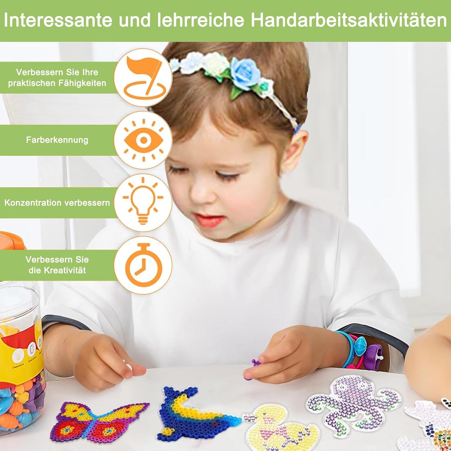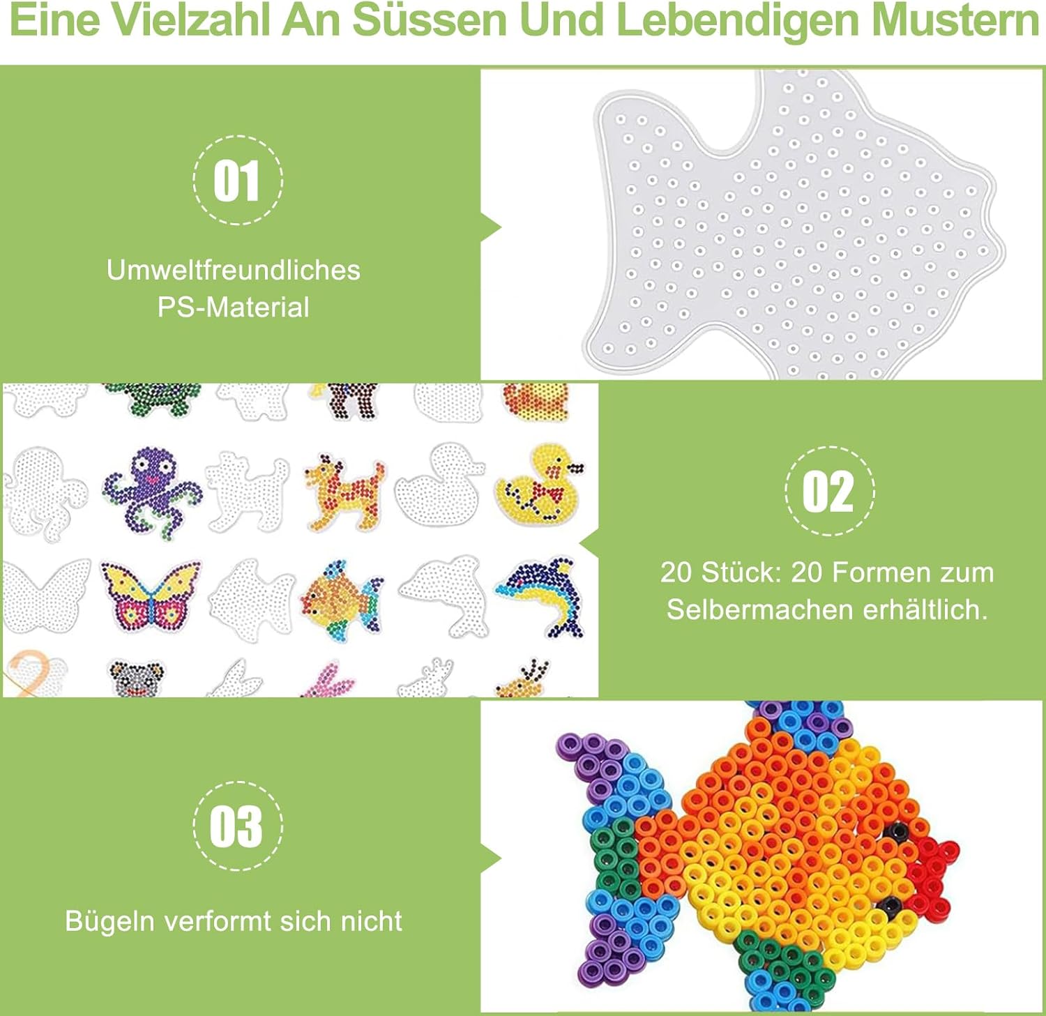 Contenuto del prodotto: il set di modelli da stirare su perline da 30 pezzi contiene 30 stencil creativi con disegni di animali, tra cui pesci, delfini, volpi, farfalle, giraffe, elefanti e molto altro. Perfetto per sviluppare l'immaginazione e imparare le forme degli animali attraverso il design creativo. COSTRUZIONE PREMIUM: Realizzate in plastica resistente, queste perle da stiro sono stabili e sicure per i bambini. Offrono un'opzione ecologica, priva di sostanze nocive, durevole e facile da maneggiare. Compatibilità universale: ideale per perline termoadesive da 5 mm: può essere facilmente sistemato sugli stampini con perline di ferro e fuso con un ferro da stiro. Questo crea opere d'arte uniche che possono essere progettate come preferisci. Fai da te creativo: con 30 design diversi, questo set di piastre da stiro stimola la creatività. I bambini possono scoprire forme e migliorare le loro capacità motorie mentre creano i propri disegni. Perfetto per giovani artisti e appassionati di fai da te. Ampie possibilità di applicazione: questo modello di perline da stiro è un ottimo regalo per la famiglia, gli amici o i bambini, sia per Natale che per altre occasioni. È un grande hobby trascorrere del tempo creativo in vacanza insieme o semplicemente divertirsi con tutta la famiglia.