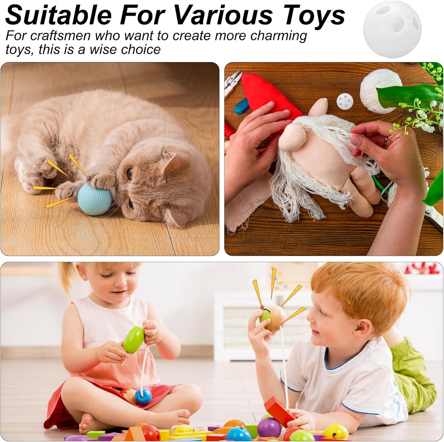 【Materiali di alta qualità】: Realizzate in resistente plastica ABS e PS, queste palline sonaglio da cucire sono adatte a un uso frequente. Sono resistenti, leggere e mantengono la loro forma e il loro suono anche dopo innumerevoli progetti e utilizzi. 【Ideale per il fai da te】: Un'aggiunta divertente per gli appassionati che desiderano aumentare il coinvolgimento. L'inserto con sonaglio dà vita ai peluche e ispira un divertimento creativo e veloce per gli animali domestici e chiunque ami i giocattoli interattivi. 【Veloce e facile da usare】: Basta inserire le palline sonaglio nelle tue creazioni di peluche o all'uncinetto per creare suoni delicati e piacevoli. I suoni delicati attirano l'attenzione senza essere invadenti: perfetti per creare giocattoli per animali domestici o per interazioni divertenti. 【Perfetti per una varietà di giocattoli】: Che si tratti di un orsacchiotto di peluche, una bambola fatta a mano o un giocattolo da masticare per animali domestici, gli inserti sonaglio aggiungono suoni coinvolgenti. Una scelta intelligente per gli appassionati che desiderano aggiungere fascino ai giocattoli. 【La confezione include】: 30 palline sonaglio per confezione, ciascuna di 24 mm di diametro, così avrai sempre delle palline di ricambio per lavori di bricolage o riparazioni. Ideale per creare giocattoli, potenziare i peluche o come materiale per futuri progetti creativi.