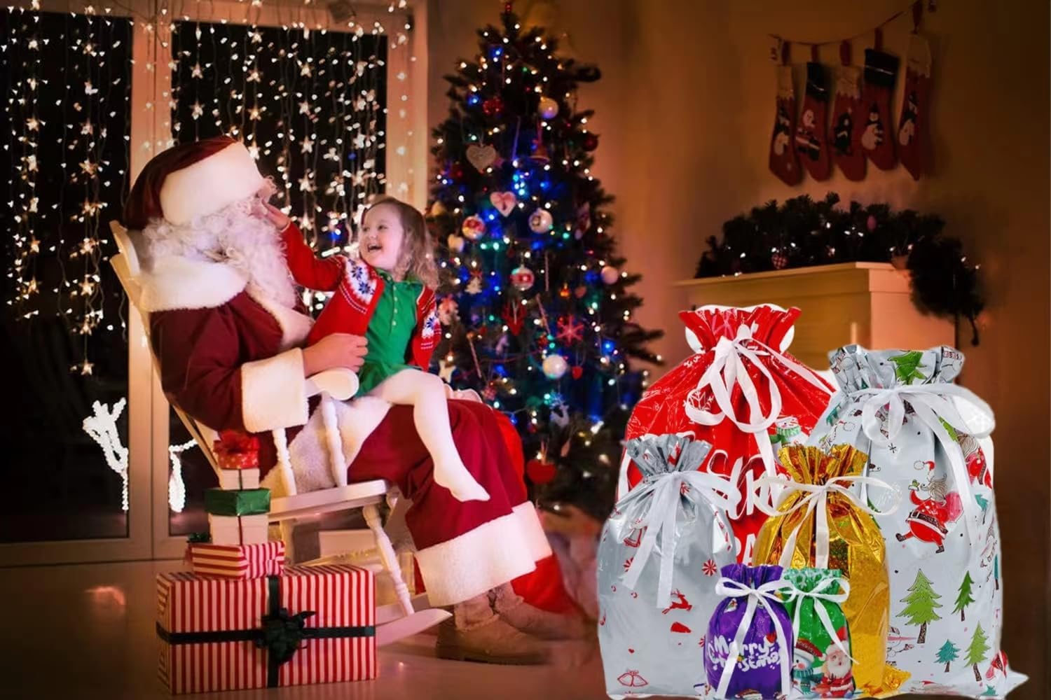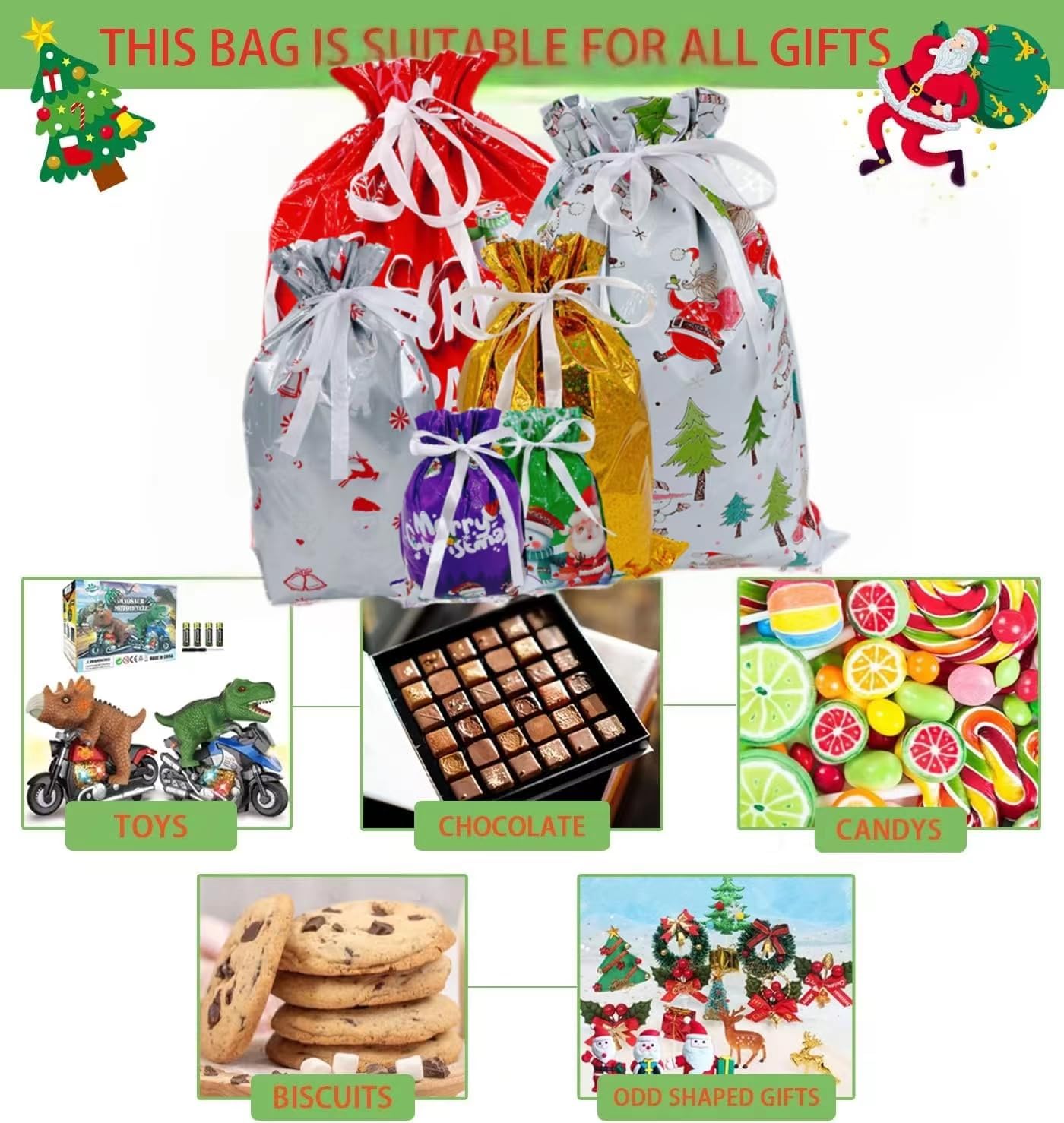 COMODO DESIGN CON COulisse: i nostri sacchetti regalo di Natale presentano un design unico con coulisse che ti consente di incartare i tuoi regali senza sforzo. Basta inserire il regalo nel sacchetto, stringere il nastro e fare un fiocco per completare la confezione. Questo processo semplice e rapido rende la consegna dei regali un gioco da ragazzi. DUREVOLI E RIUTILIZZABILI: Realizzati in un foglio di alluminio spesso di alta qualità, i nostri sacchetti regalo di Natale non sono solo belli ma anche durevoli. Il materiale robusto assicura che le borse possano sopportare il peso dei tuoi regali senza strapparsi. A differenza dei sacchetti regalo di carta, i nostri sacchetti riutilizzabili possono essere utilizzati anno dopo anno, rendendoli una scelta ecologica per incartare i tuoi regali. VARIE MISURE PER TUTTI I REGALI: Questi sacchetti regalo natalizi con cordoncino includono 4 misure in 6 modelli diversi, 5 sacchetti regalo extra large da 44 x 57 cm, 5 sacchetti regalo natalizi da 39 x 51 cm, 10 sacchetti regalo medi con cordoncino da 29 x 43 cm e 10 sacchetti regalo da 24 x 32 cm. Piccoli sacchetti di caramelle da 9,5 x 1 6,6 cm (particolarmente adatti come sacchetti di caramelle per snack per bambini). I sacchetti regalo per le vacanze possono soddisfare i tuoi regali di Natale. Sono richieste tutte le dimensioni del pacchetto. 【Versatile e Decorativo】Questi sacchetti regalo non sono solo pratici, ma servono anche come bellissime decorazioni per le tue feste di Natale. Usali per decorare il tuo albero di Natale, presentare regali alle feste o conservare bomboniere. I disegni e i colori festivi aggiungono un tocco di allegria natalizia ad ogni occasione. Sorpresa e gioia: avvolgere i tuoi regali nei nostri sacchetti regalo di Natale aggiunge un elemento di sorpresa ed eccitazione. Bambini e adulti saranno entusiasti di ricevere un regalo in una delle nostre stravaganti borse. Che si tratti di un sacchetto di caramelle, di un sacchetto di giocattoli o di un regalo speciale per le vacanze, i nostri sacchetti rendono il disfare le valigie ancora più piacevole. Diffondi la gioia e rendi questo Natale davvero memorabile con i nostri adorabili sacchetti regalo.