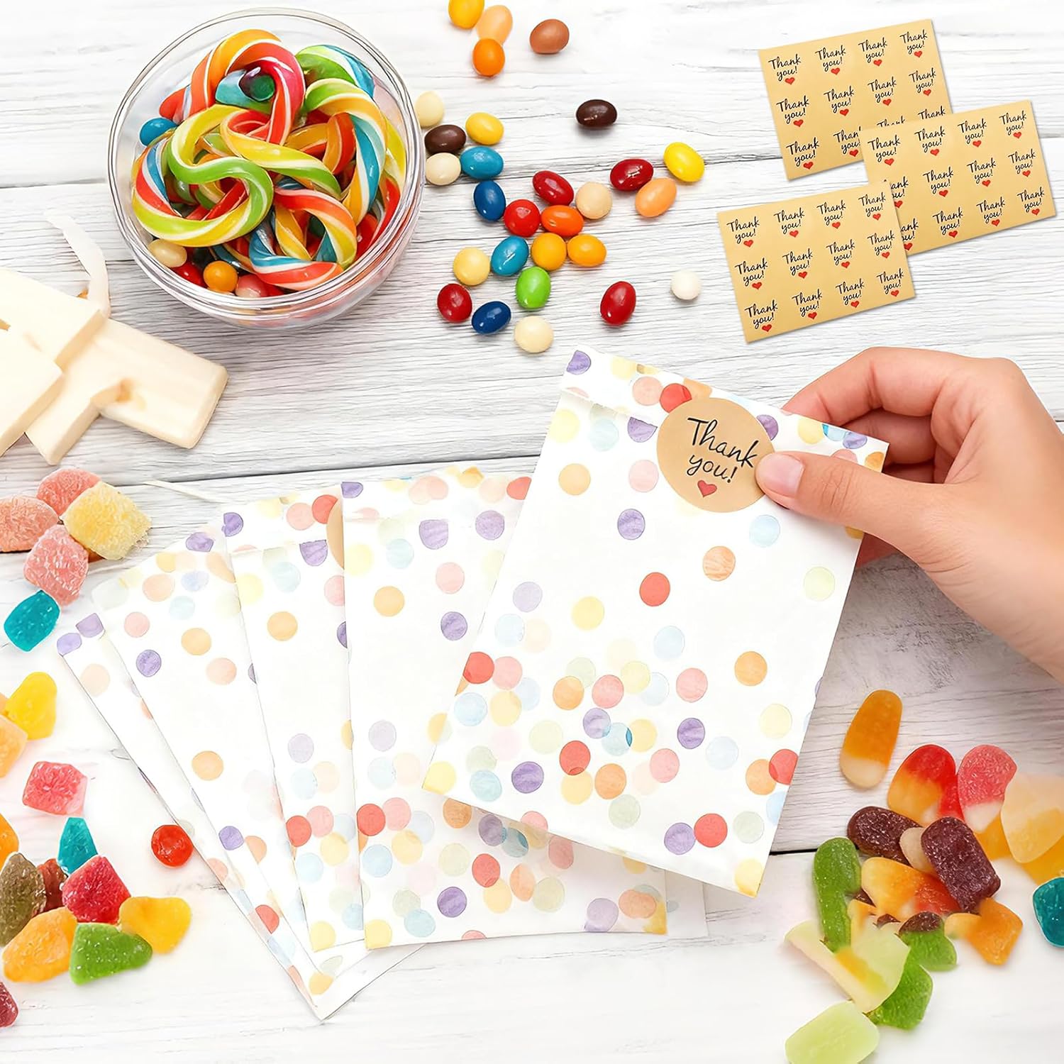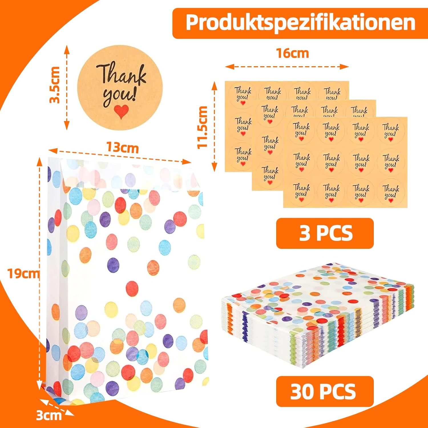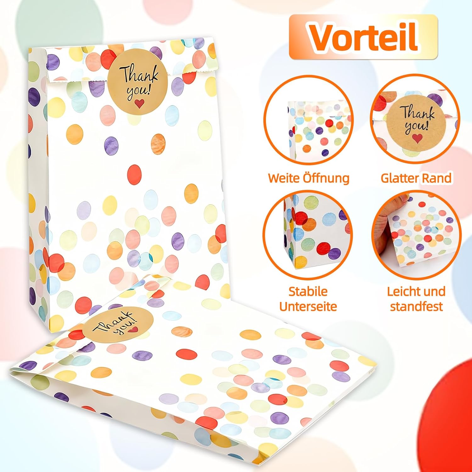 [Pratico set completo]: il set contiene 30 sacchetti regalo colorati in carta kraft e 36 adesivi decorativi "Grazie". Con dimensioni di 19 × 13 × 3 cm, i sacchetti per feste offrono spazio sufficiente per dolci, piccoli regali o snack - perfetti per compleanni, matrimoni, feste per bambini e altro ancora [Robusti e adatti agli alimenti]: realizzati in carta kraft spessa e di alta qualità, i sacchetti sono resistenti agli strappi, al grasso e all'acqua. Sono anche ecologici e sicuri per il contatto diretto con gli alimenti - ideali per biscotti, popcorn, cioccolata o piccoli snack. [Allegro design a pois]: il colorato motivo a pois in stile arcobaleno rende ogni borsa una vera attrazione. I colori forti creano immediatamente un'atmosfera di festa e rendono le vostre bomboniere particolarmente festive e uniche. [Versatile]: i sacchetti di carta si aprono facilmente, sono stabili e possono essere chiusi in modo sicuro con gli adesivi in dotazione. Che si tratti di sacchetti per snack, sacchetti per feste, sacchetti per regali o confezioni regalo, possono essere utilizzati in vari modi per tutti i tipi di feste [Con attenzione ai dettagli]: i bordi ben seghettati prevengono lesioni durante l'apertura, mentre gli adesivi di alta qualità non solo aderiscono in modo affidabile ma sono anche decorativi. Ciò conferisce ad ogni borsa un tocco individuale e rimarrà un bel ricordo per i tuoi ospiti