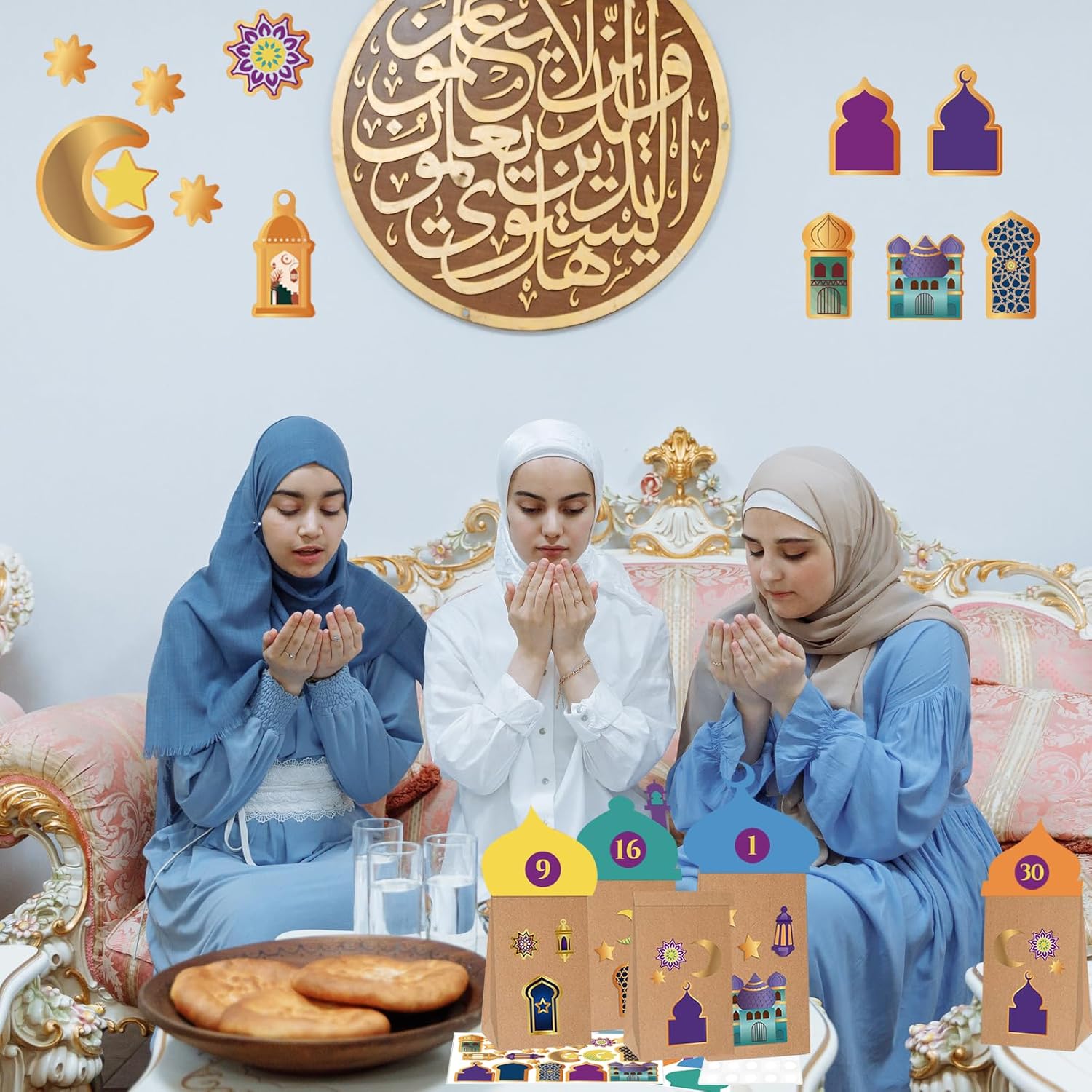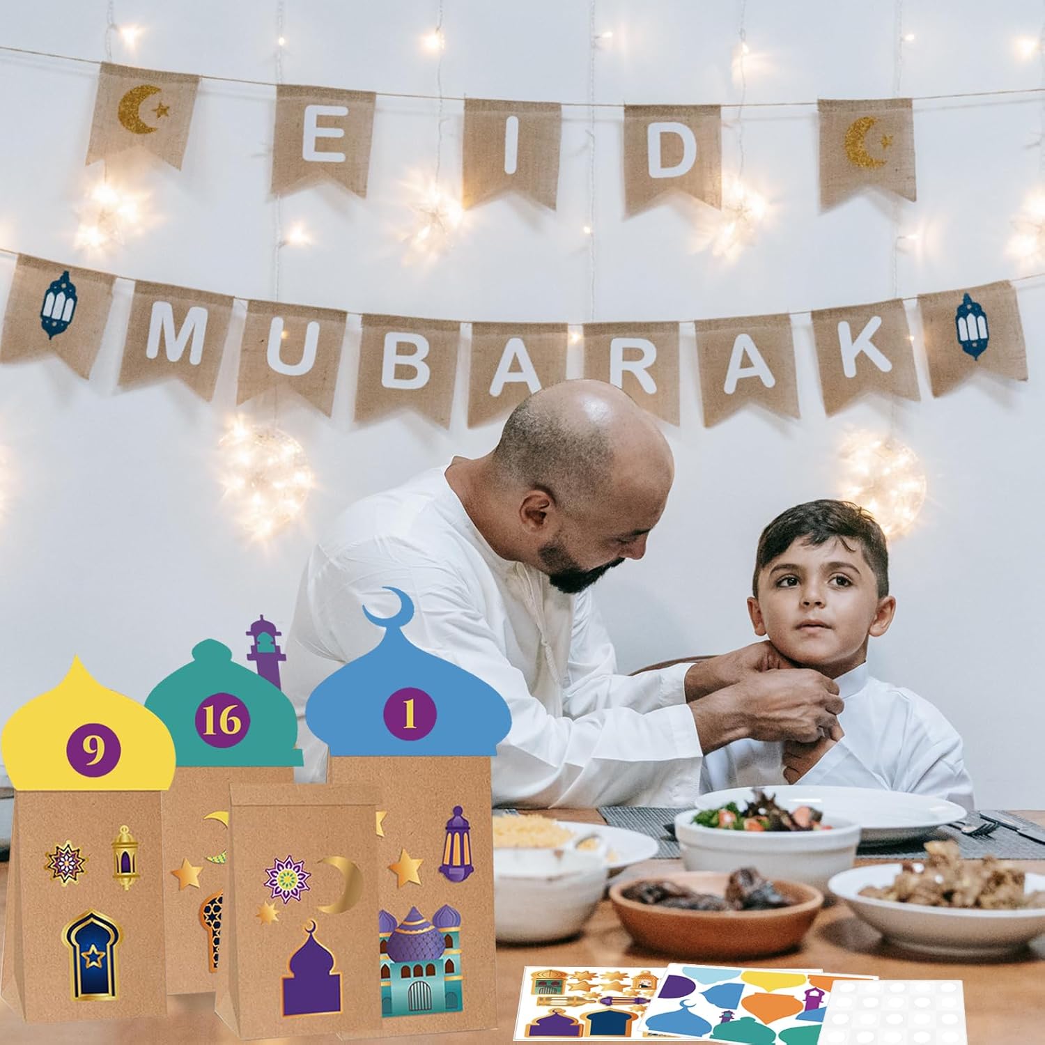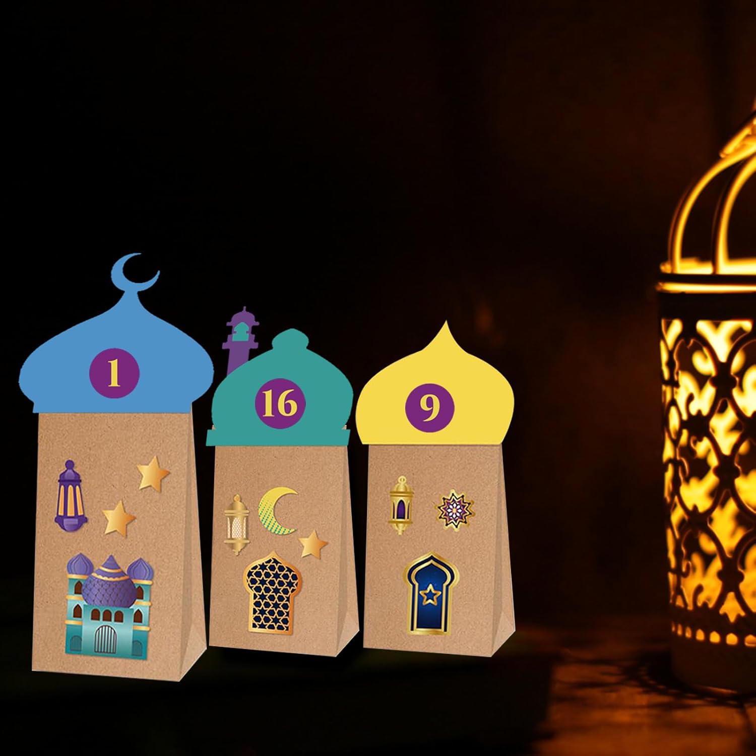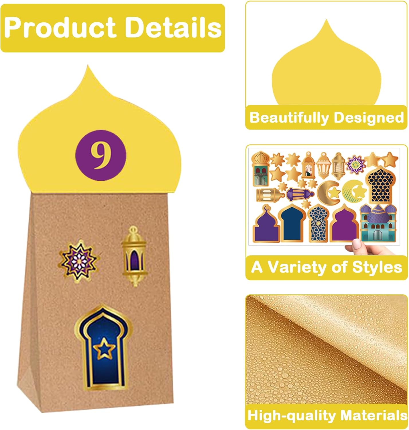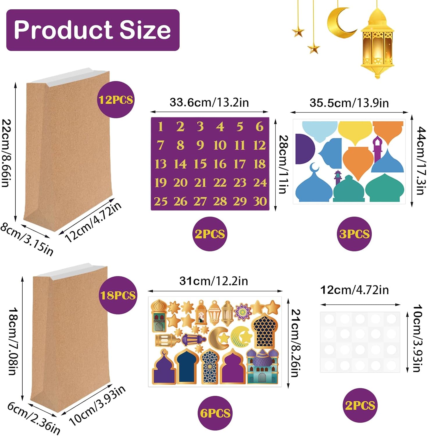 🌙【Sacchetti regalo calendario Ramadan】: Include 12 sacchetti di carta kraft marrone che misurano 22 x 12 x 8 cm, 18 sacchetti di carta kraft marrone che misurano 18 x 10 x 6 cm, adesivi con numeri da 1 a 30 e molti adesivi con stelle, lune e castelli stampati, 30 archi per tetto e torre pretagliati, due fogli di colla a pois. 🌙【Materiale di alta qualità】: la borsa del calendario Ramadan è realizzata in materiale cartaceo di alta qualità ed è spessa e resistente agli strappi. Può essere utilizzato per conservare caramelle, cioccolato, datteri, snack, piccoli regali, giocattoli, ecc. I robusti sacchetti regalo Eid sono facili da piegare e riutilizzabili! 🌙【Design di elementi a tema Ramadan】: crea decorazioni Ramadan uniche per la tua famiglia e i tuoi amici con un tocco di design utilizzando sacchetti di carta e una serie di adesivi colorati con elementi Ramadan come cupole di moschee, torri, archi, castelli e molto altro. 🌙【Regali Ramadan】: questo è il regalo Ramadan perfetto per bambini e adulti. Il riempimento del calendario del Ramadan fai-da-te è un'ottima motivazione durante il Ramadan. I sacchetti di carta decorati possono essere riempiti con piccoli regali o dolci durante l'avvicinarsi del Ramadan. 🌙【Ampiamente usato】Questi sacchetti regalo sono perfetti per feste per bambini, bambini del calendario Ramadan, feste Ramadan per conservare regali o dolci o piccoli oggetti, ecc. Questi sacchetti regalo a tema Ramadan sono la confezione ideale per i tuoi regali Ramadan. Lascia che i tuoi bambini e la tua famiglia vivano uno speciale festival dello zucchero!