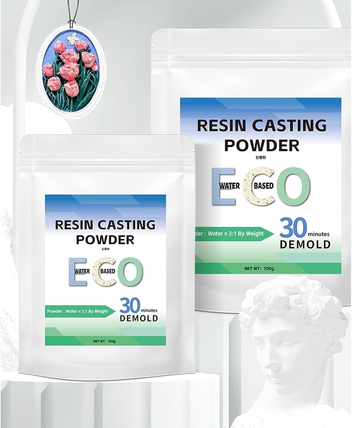 Di' addio all'aggiunta di resina polimerica. Serve come una fantastica alternativa alla resina epossidica. Ideale per realizzare vassoi, sculture, supporti, gioielli, figurine e così via unici. Basta misurare la polvere di gesso e l'acqua in un rapporto in peso di 3:1 e mescolare fino a ottenere un composto omogeneo. Questa polvere fine si indurisce formando una superficie liscia, simile alla porcellana, garantendo durevolezza e resistenza al calore. La nostra polvere di resina da colata con un componente amichevole del processo di indurimento attivato dall'acqua.