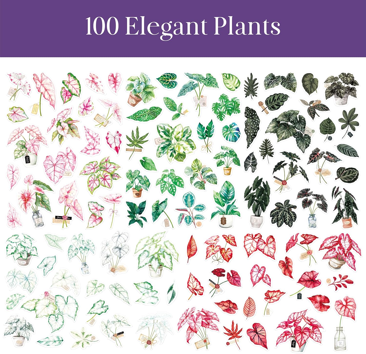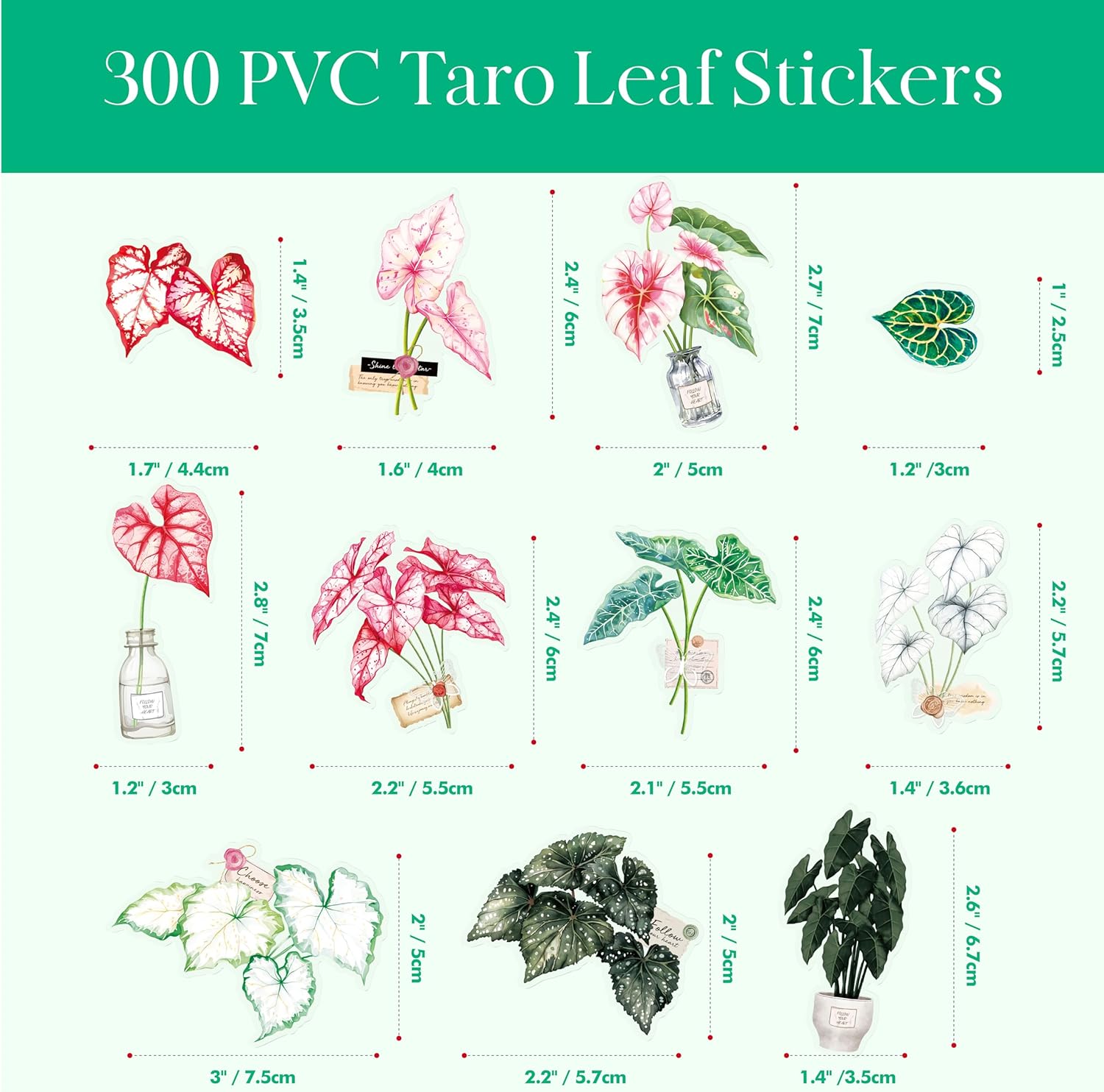 Confezione conveniente: contiene 300 adesivi con foglie di taro su 15 fogli facilmente spalmabili, una quantità sufficiente per soddisfare le diverse esigenze di decorazione. Gli adesivi delicati e accattivanti con motivi vegetali aumentano l'energia e aggiungono un tocco di naturalezza. DESIGN UNICO: presenta 100 design eleganti, ogni adesivo è realizzato con cura per catturare i dettagli delicati e i colori vivaci delle foglie di taro. Cinque diversi stili di adesivi offrono una rappresentazione autentica e accattivante delle meraviglie della natura. Materiale premium: realizzato in materiale PVC di alta qualità, impermeabile, resistente al colore e durevole. Il forte adesivo ti consente di attaccarli ovunque tu voglia. Goditi la loro bellezza per gli anni a venire! Facile da usare: 15 fogli facilmente distribuiti, adesivi discreti e pretagliati sono facili da staccare e distribuire. È possibile piegare leggermente l'adesivo, tenere l'adesivo con la mano sinistra, quindi staccare il bordo dell'adesivo con la mano destra per staccarlo facilmente. Ampia applicazione: lascia sbocciare la tua creatività! I nostri adesivi con foglie di taro in PVC si attaccano facilmente a varie superfici tra cui pareti, finestre, laptop, quaderni, mobili e altro ancora. Usali per creare splendidi album di ritagli, personalizzare i tuoi oggetti personali o semplicemente portare un'atmosfera naturale in qualsiasi stanza.
