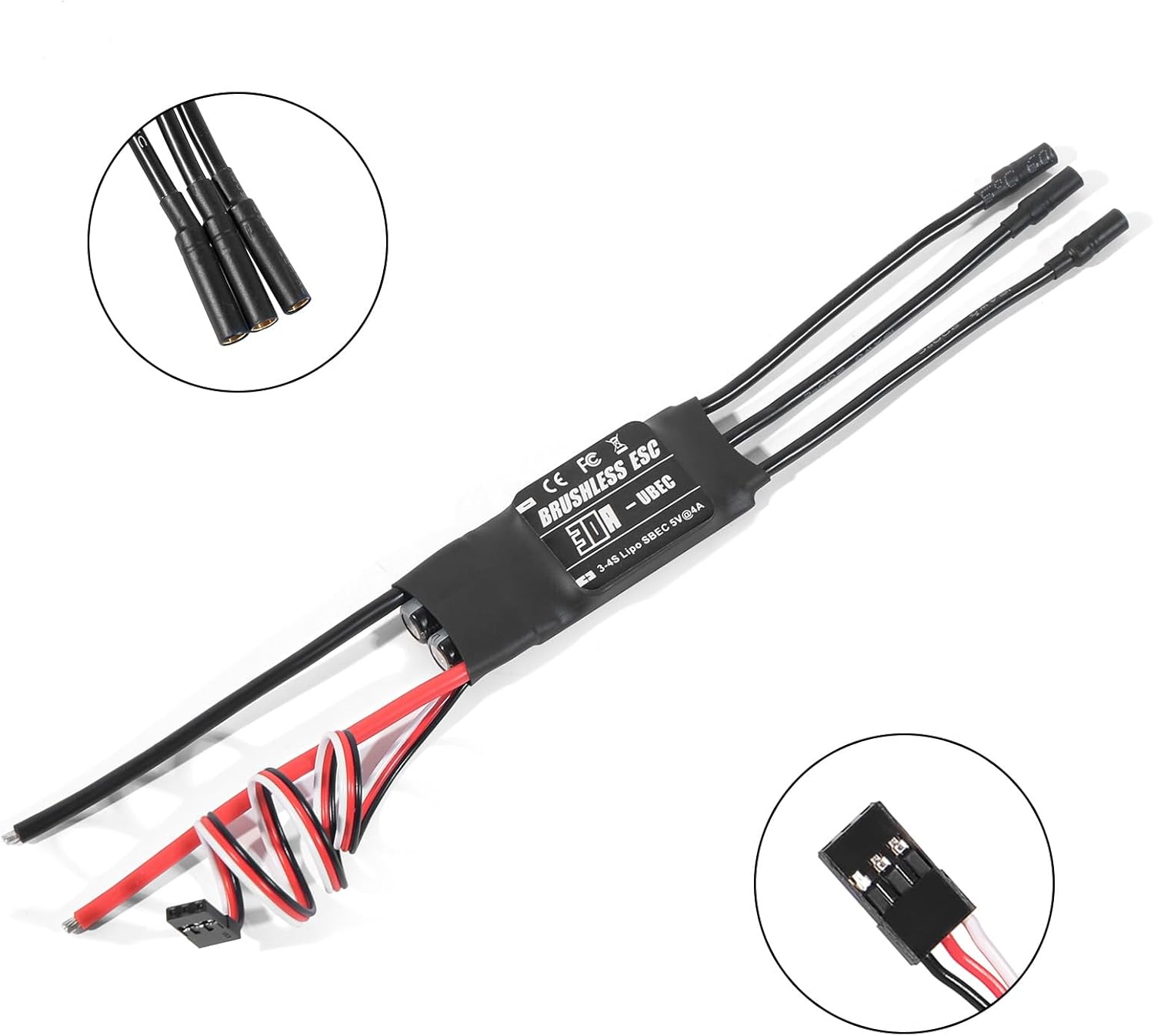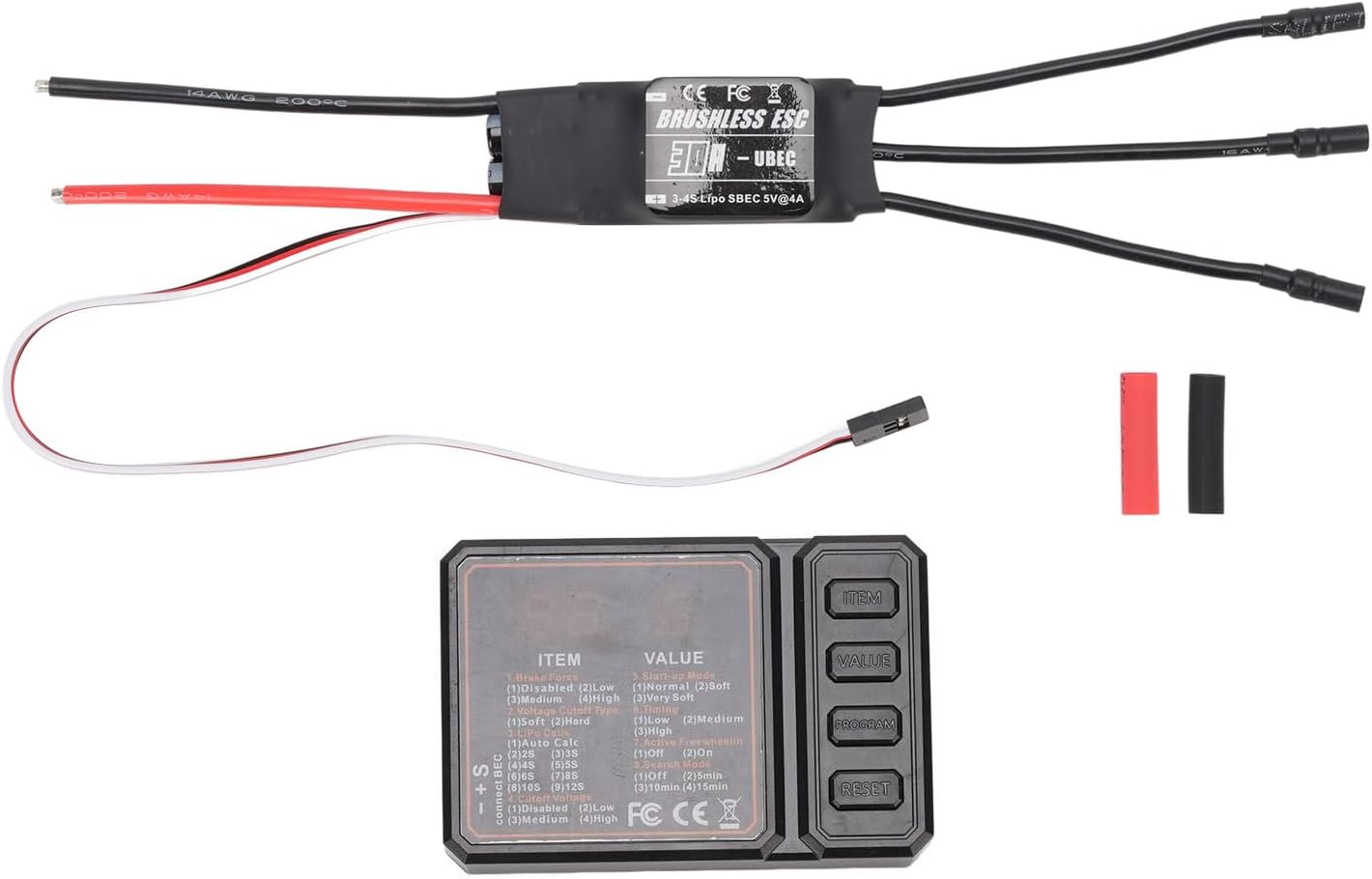 VELOCE E STABILE: l'ESC RC senza spazzole ha una modalità di avvio configurabile, una risposta rapida dell'acceleratore e un controllo della velocità lineare e fluido, che puoi utilizzare con sicurezza. Molteplici funzioni di protezione: l'ESC senza spazzole è dotato di protezione da avviamento anomalo, protezione da surriscaldamento, protezione dell'acceleratore e sezione di bassa pressione. Prestazioni di sicurezza ad alte prestazioni: l'ESC senza spazzole da 30 A è molto sicuro da usare, indipendentemente da dove si trova l'acceleratore, il motore non si avvierà immediatamente. Parametri tecnici: l'ESC senza spazzole RC supporta una varietà di metodi di programmazione, controllo remoto e programmazione. Ingresso 3-4S Lipo, uscita BEC 5V 2a (modalità Switch) Facile da usare: l'ESC è facile da usare a casa o durante il volo. È il primo per gli appassionati di modellismo esperti e per gli appassionati di RC