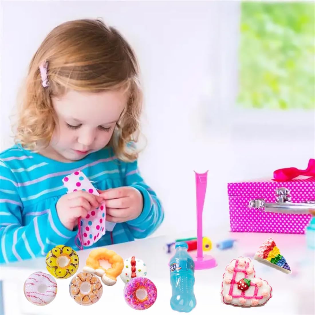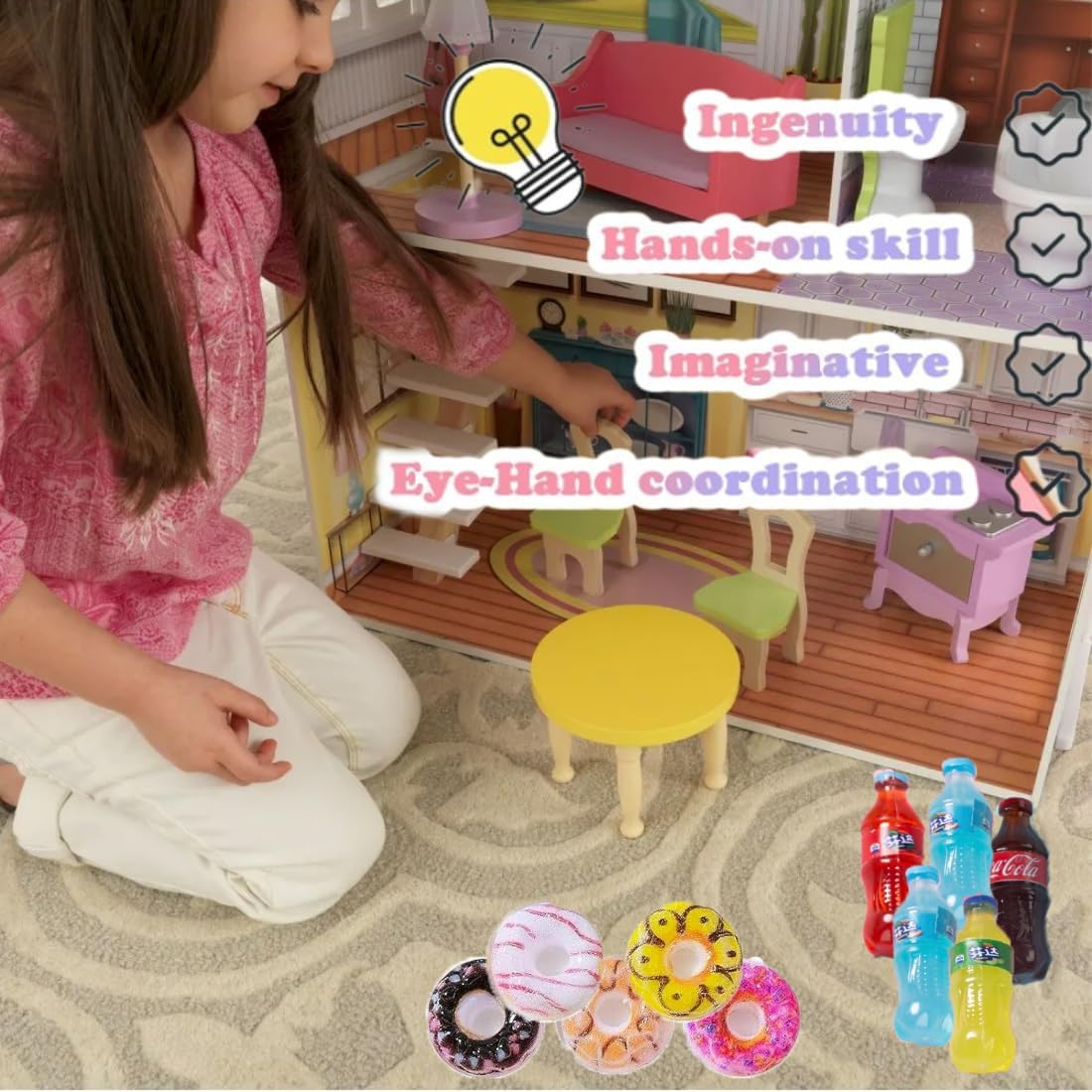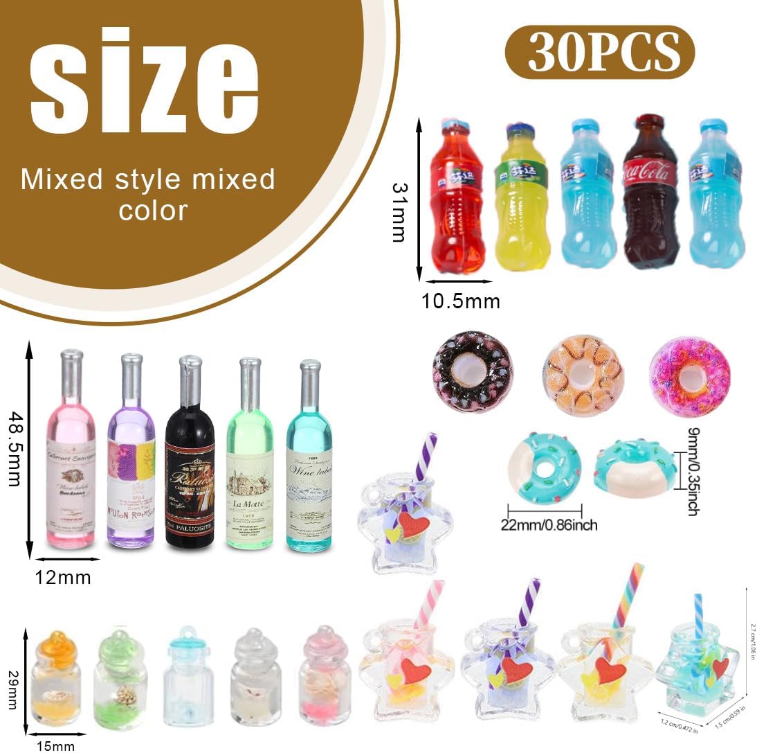 【Accessori per casa delle bambole】 Riceverai 30 accessori in miniatura, divisi in due parti: 6 set di giocattoli alimentari in miniatura, 5 * piccole bottiglie di soda, 5 * bottiglie di vino rosso, 5 * tazze di succo, 5 * tazze di tè al latte, 5 * cerchio dolce set, set da torta 5 *, mini set da cibo per mini cucina, è una decorazione perfetta per la casetta dei bambini. 【Materiale Sicuro】Il nostro set di case delle bambole in miniatura è realizzato in resina e legno di alta qualità, sicuri e non tossici, durevoli e non facili da deformare. Ogni accessorio è realizzato con cura, ha una superficie liscia, non sbiadisce facilmente e può essere utilizzato a lungo, rendendolo un accessorio ideale per la casa delle bambole. 【Effetto Realistico】Gli accessori per casa delle bambole sono progettati in scala 1/12, simulando il design di veri utensili da cucina e da cucina. Sembrano molto realistici, offrendoti un'esperienza di gioco più realistica e aggiungendo più fascino alla tua casa delle bambole. 【Ampia Gamma di Usi】Gli accessori in miniatura sono adatti per decorazioni di case delle bambole di vari temi. Puoi usarli per decorare le stanze dei bambini, cucine in miniatura, giardini fatati, panifici in miniatura, vetrine e altre scene per vivere il divertimento del mondo in miniatura. 【Regalo】Gli accessori casa delle bambole in miniatura sembrano molto vivaci e carini. Sono regali creativi ideali per compagni di classe, amici e familiari a Natale, compleanni, Halloween e altri festival, in modo che possano divertirsi con il fai-da-te.