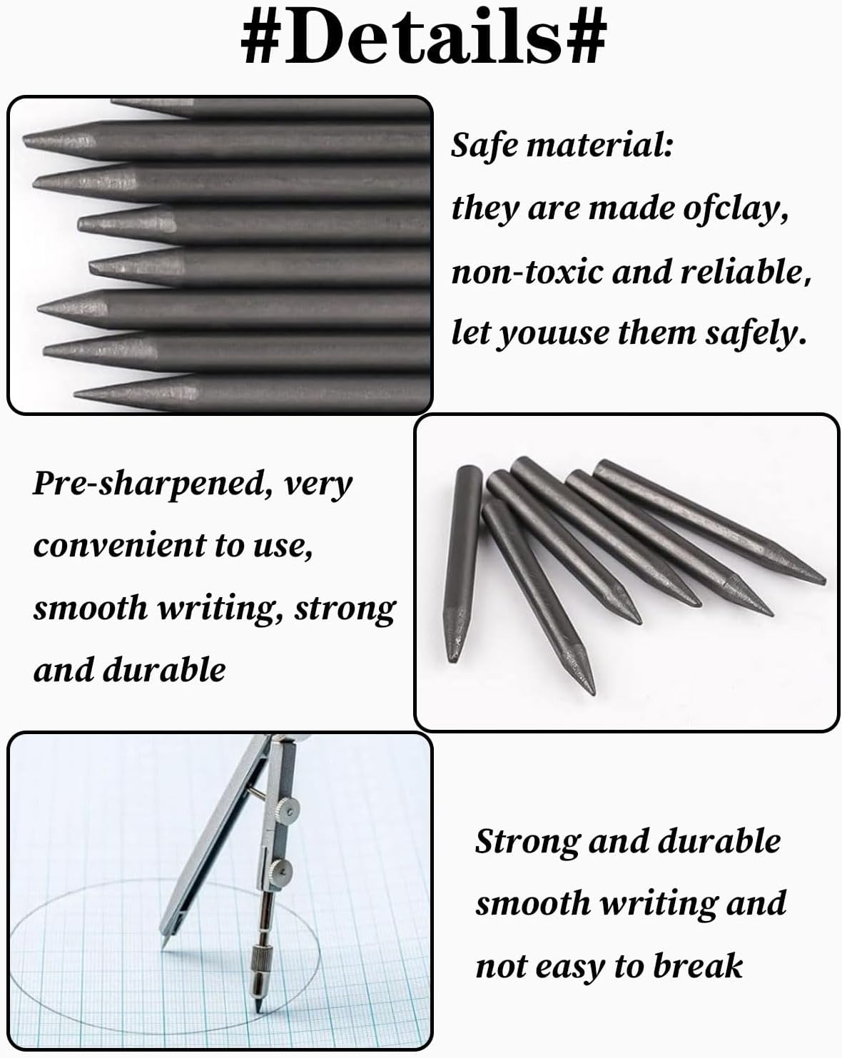 Preciso e durevole: il nucleo della nostra bussola è realizzato in materiale durevole, in grado di tracciare linee precise e chiare nel disegno tecnico. Anche se utilizzato frequentemente, riesce comunque a mantenere un effetto di disegno ottimale. Comodo e facile da usare: il nucleo di ricambio della bussola è facile da sostituire e può essere adattato perfettamente alla maggior parte dei modelli di bussola più comuni sul mercato. È una scelta pratica per studenti, insegnanti e professionisti che amano disegnare. Ampia compatibilità: questi nuclei per bussola hanno una buona compatibilità multifunzionale e possono essere adattati a vari tipi di bussole. Possono svolgere un ruolo importante e soddisfare diverse esigenze applicative, sia nel disegno scolastico, nella progettazione d'ufficio o nel funzionamento di un laboratorio. Materiale eccellente: le nostre ricariche per compasso sono realizzate in grafite di alta qualità, che rende le linee tracciate uniformi e non soggette a usura, garantendo la qualità del disegno. UN MUST-HAVE: che tu voglia sostituire vecchi accessori da disegno o aggiungerne di nuovi, queste mine per compasso sono un'aggiunta essenziale alla collezione di strumenti da disegno di precisione di chiunque.