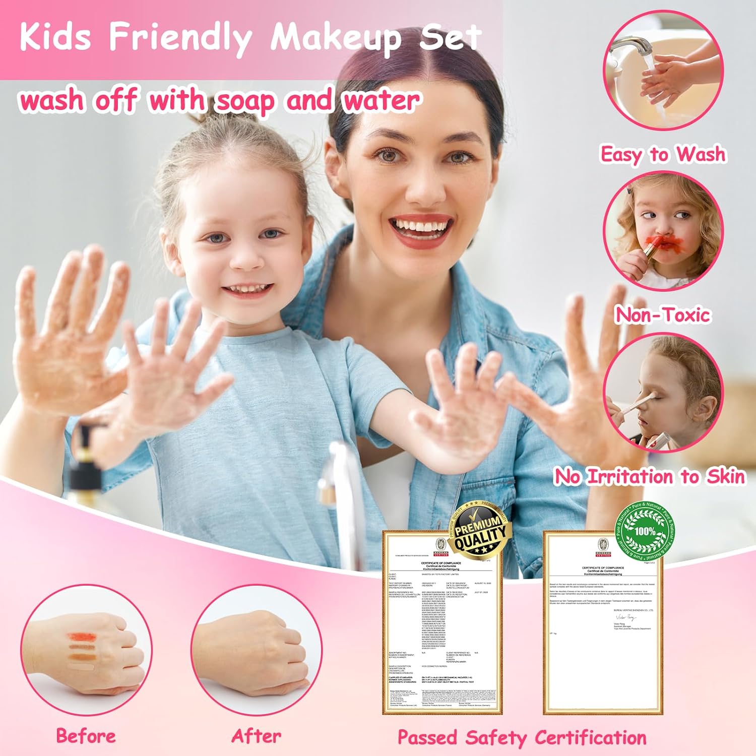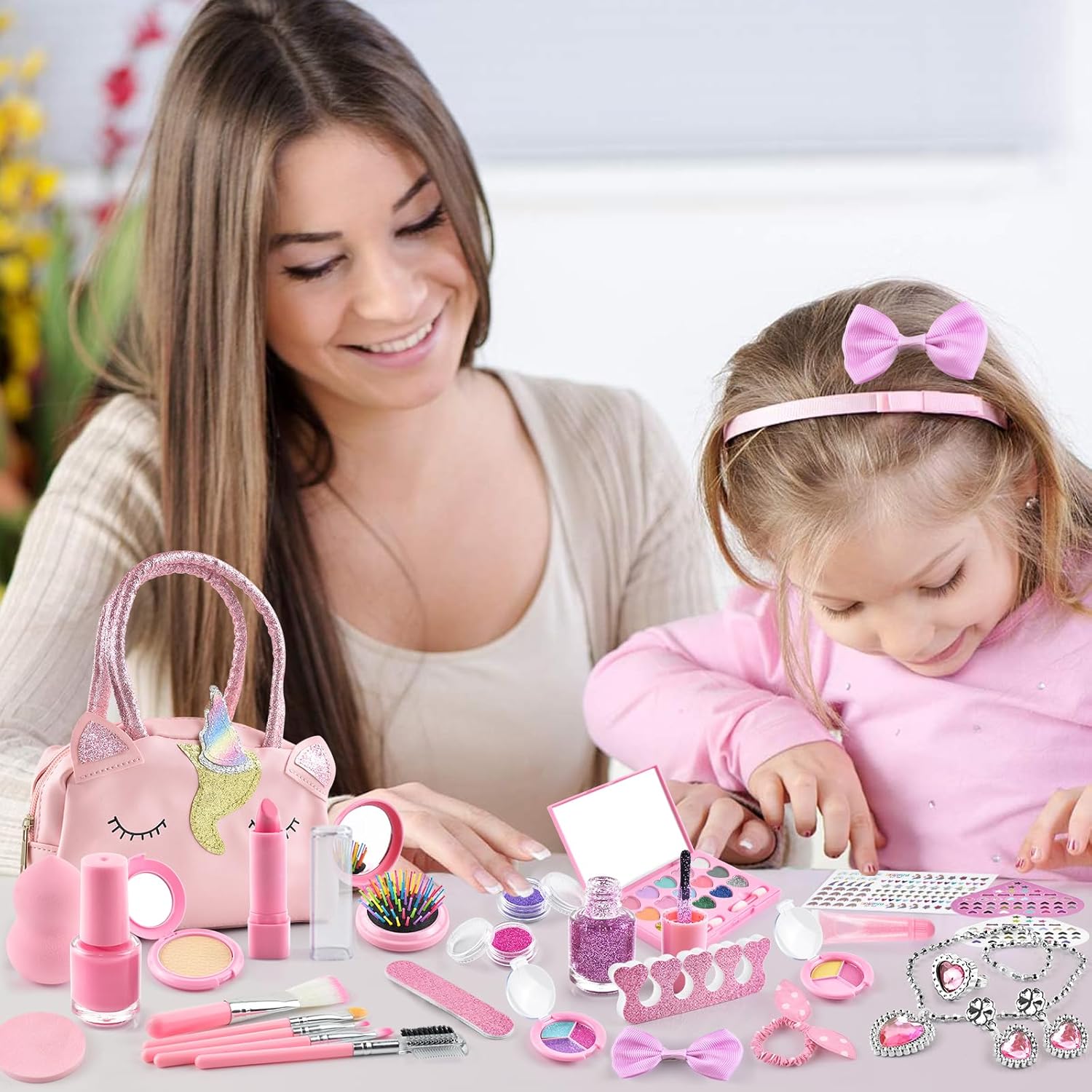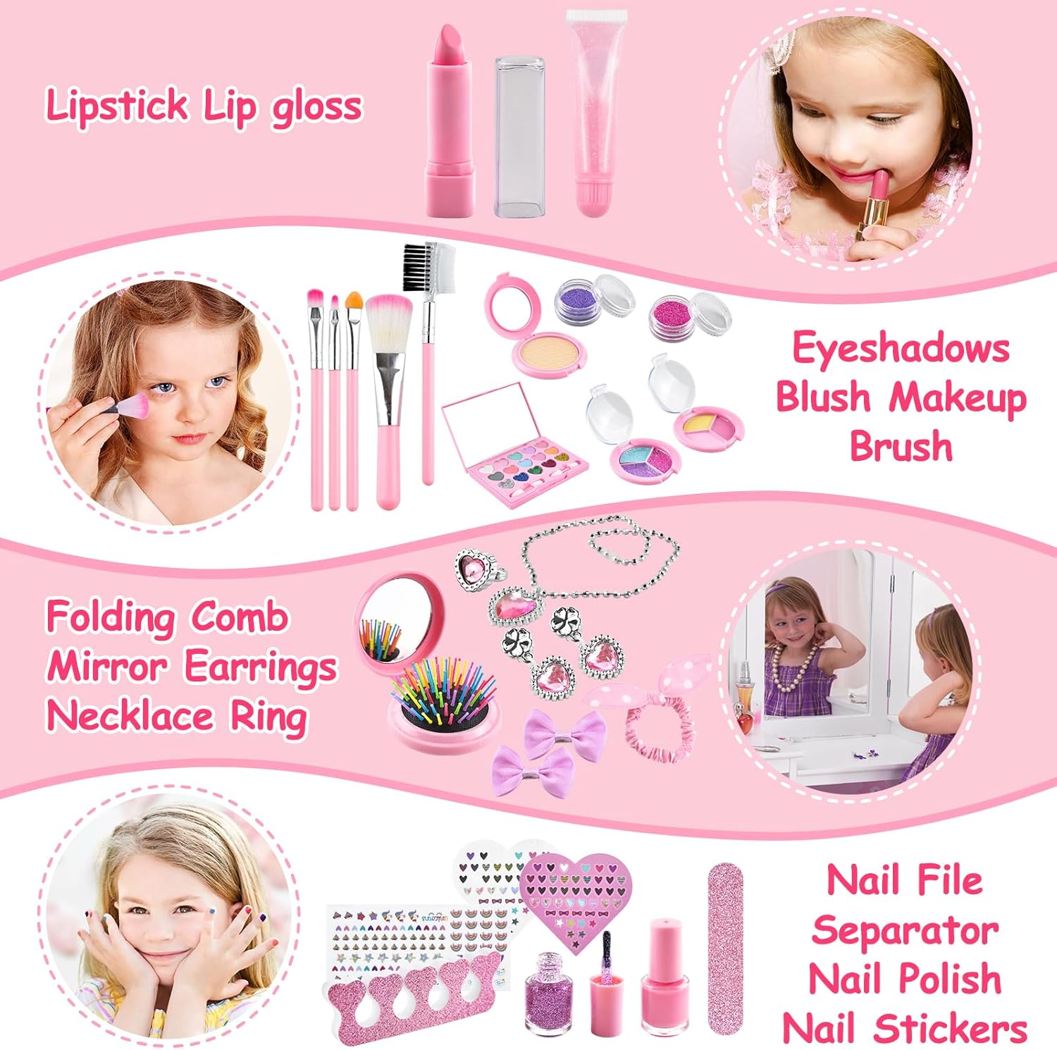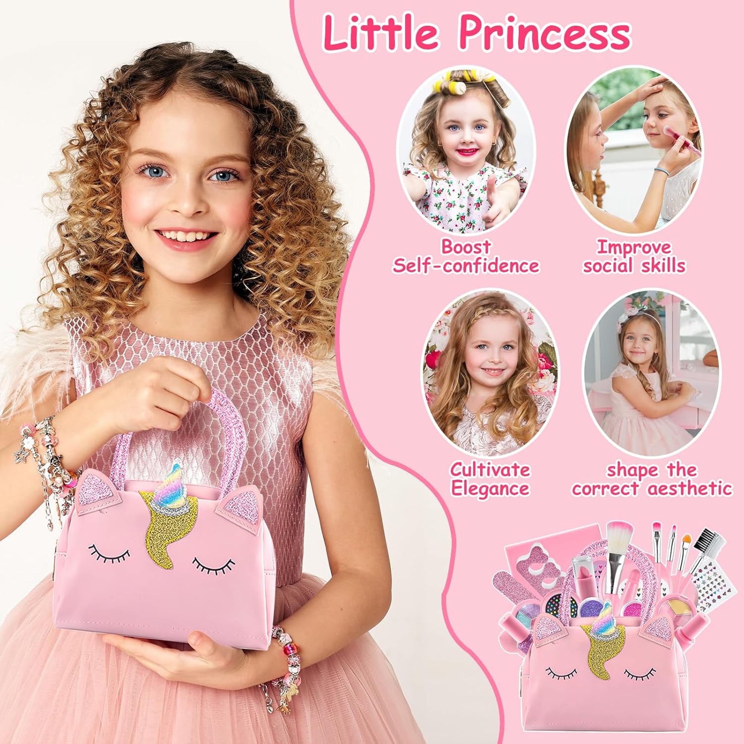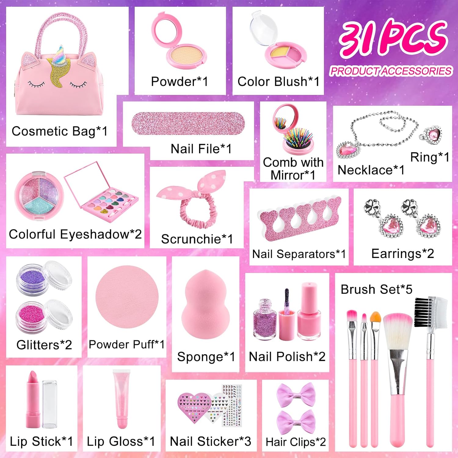 【31 articoli, trucco + nail art】 Include 1 polvere, 2 ombretti (15+3 colori), 2 rossetti, 1 spugna, 1 piumino di cipria, 2 glitter, 1 rosa (3 colori), 5 pennelli, 2 smalti per unghie, 3 adesivi per unghie, 1 separatore per unghie, 1 lima per unghie, 2 orecchini, 1 collana, 1 anello, 1 pettine pieghevole, 1 elastico per capelli, 2 fermagli per capelli, 1 borsa per cosmetici. Include trucco, design delle unghie e accessori di gioielleria per l'amore per la bellezza delle bambine! 【Non tossico e lavabile, nessuna irritazione della pelle】 Realizzato con materiali atossici e a base d'acqua, può essere pulito con acqua calda e sapone. Privo di parabeni e conservanti, morbido e delicato sulla pelle. Conforme agli standard internazionali e ha superato i test di sicurezza, adatto ai bambini e sicuro da usare. 【Coltiva abilità pratiche, stimola l'immaginazione】 Il set di trucchi per bambine soddisfa i primi interessi e bisogni di trucco delle ragazze, coltiva un temperamento estetico ed elegante e accompagna il loro amore per la bellezza. Non solo promuove la loro immaginazione, creatività e capacità di truccarsi, ma anche i loro rapporti con amici e conoscenti. 【Borsa per cosmetici squisita, facile da trasportare】 Non sono inclusi solo i prodotti essenziali per il trucco, ma anche una borsa per cosmetici carina e squisita a forma di unicorno, che può essere utilizzata per riordinare e raccogliere giocattoli cosmetici sparsi e può anche essere indossata in varie occasioni per giocare in qualsiasi momento, il che è semplice e divertente. 【Per bambini dai 3 anni in su】 Progettato per far vestire le bambine per incoraggiare l'immaginazione e il gioco creativo. Questo giocattolo per il trucco è adatto a varie occasioni come feste di trucco, feste di compleanno, feste di Natale, feste di Halloween, cosplay, giochi di travestimento. Ci sono un totale di 31 strumenti per il trucco tra cui scegliere, così potrai divertirti con i tuoi piccoli!