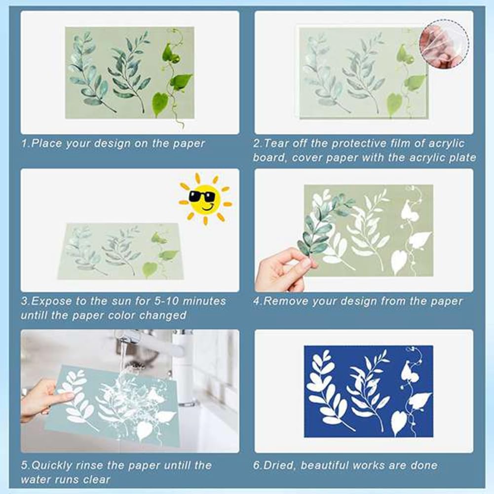 QUALITÀ PREMIUM: Le carte per la stampa solare sono realizzate con carta di pasta di legno di alta qualità, robusta, lavabile e non facile da rompere/strappare. La carta Sun Art è sensibile alla luce ultravioletta e il risultato 'imaging, tra cui uniformità e nitidezza, ha tutti buoni effetti. FACILE DA USARE: Posiziona il tuo disegno carta cianotipica; metti la carta e il disegno nello strumento di plastica; esporre la carta al sole per 5-15 minuti; sciacquare la carta in acqua per circa 1 minuto, quindi asciugarla. E il bellissimo 'artista è fatto! Così facile da ! IL PACCHETTO CONTIENE: Riceverai 32 fogli di carta cianotipica (circa 5,8 x 8,3 pollici) e 1 strumento di plastica progettato per la stampa solare. Lo strumento può mantenere la tua carta cianotipica. Non sarai più turbato possibilità che un forte soffi via le tue carte stampate dal sole. GRANDE PROGETTO DIY: Il processo di stampa del sole è semplice e divertente. Può coltivare l'immaginazione, la creatività, l'abilità pratica dei bambini e sviluppare il loro interesse per gli esperimenti scientifici. Per gli adulti, la stampa del sole è un'ottima attività da con i bambini o con gli friend, per godersi il tempo insieme.