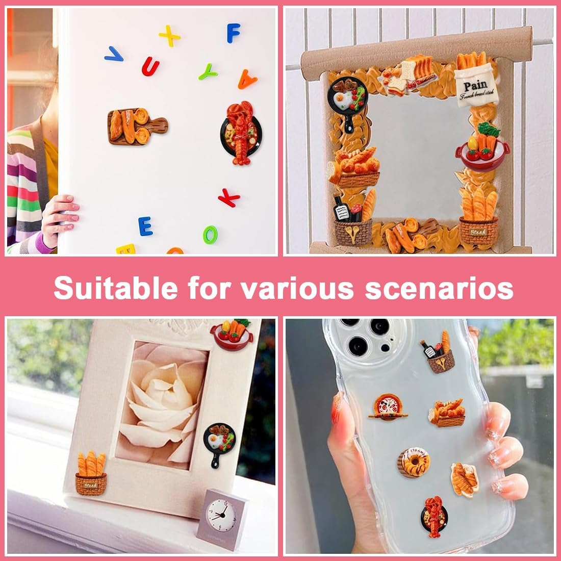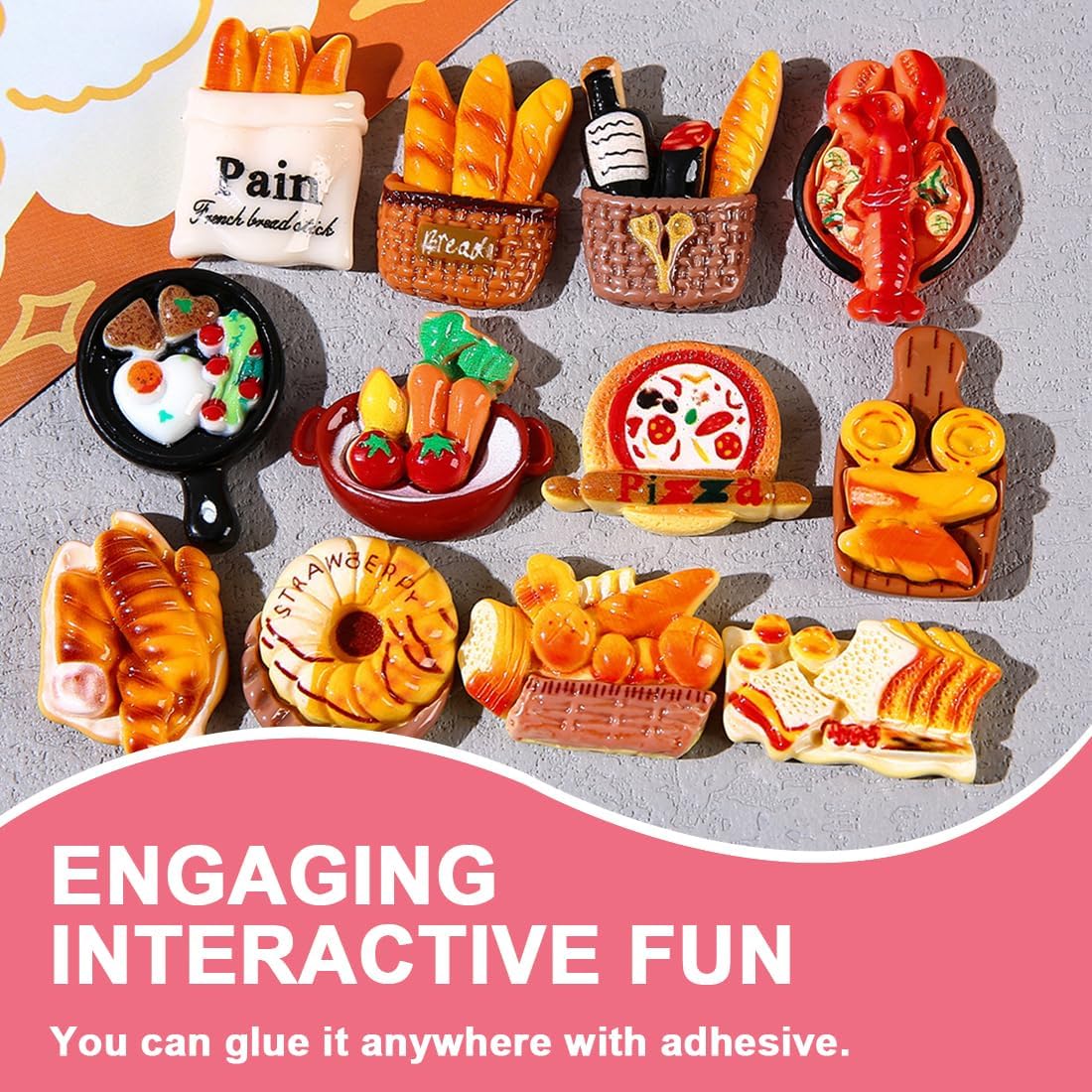 Forme ricche: 32 mini modelli di cibo, che coprono una varietà di forme di cibo come pane, dessert, fast food, ecc., con dettagli realistici e colori vivaci, creando un mondo alimentare microscopico per soddisfare le esigenze creative. Materiale di alta qualità: realizzato con materiali sicuri ed ecocompatibili, inodore, dalla consistenza liscia, robusto e durevole, non si danneggia facilmente. Può essere utilizzato per decorazioni, giochi e altre scene in tutta sicurezza. Facile da attaccare: grazie al suo supporto adesivo, è facile da attaccare e può essere fissato saldamente a superfici come frigoriferi, telefoni cellulari, notebook, ecc. Non è necessaria alcuna colla aggiuntiva, quindi puoi creare decorazioni interessanti in qualsiasi momento. Scenari multipli: adatto per giochi di finzione, costruzione di micro paesaggi, decorazione di quaderni, magneti da frigorifero e altri scenari, che si tratti di interazione genitore-figlio o di creazione personale, può aggiungere divertimento. Piccolo e raffinato: il modello è di dimensioni ridotte, non occupa spazio, è facile da riporre e trasportare e consente di iniziare a giocare in modo creativo in qualsiasi momento, aggiungendo una meravigliosa atmosfera di cibo e gioco alla vita e allo studio.