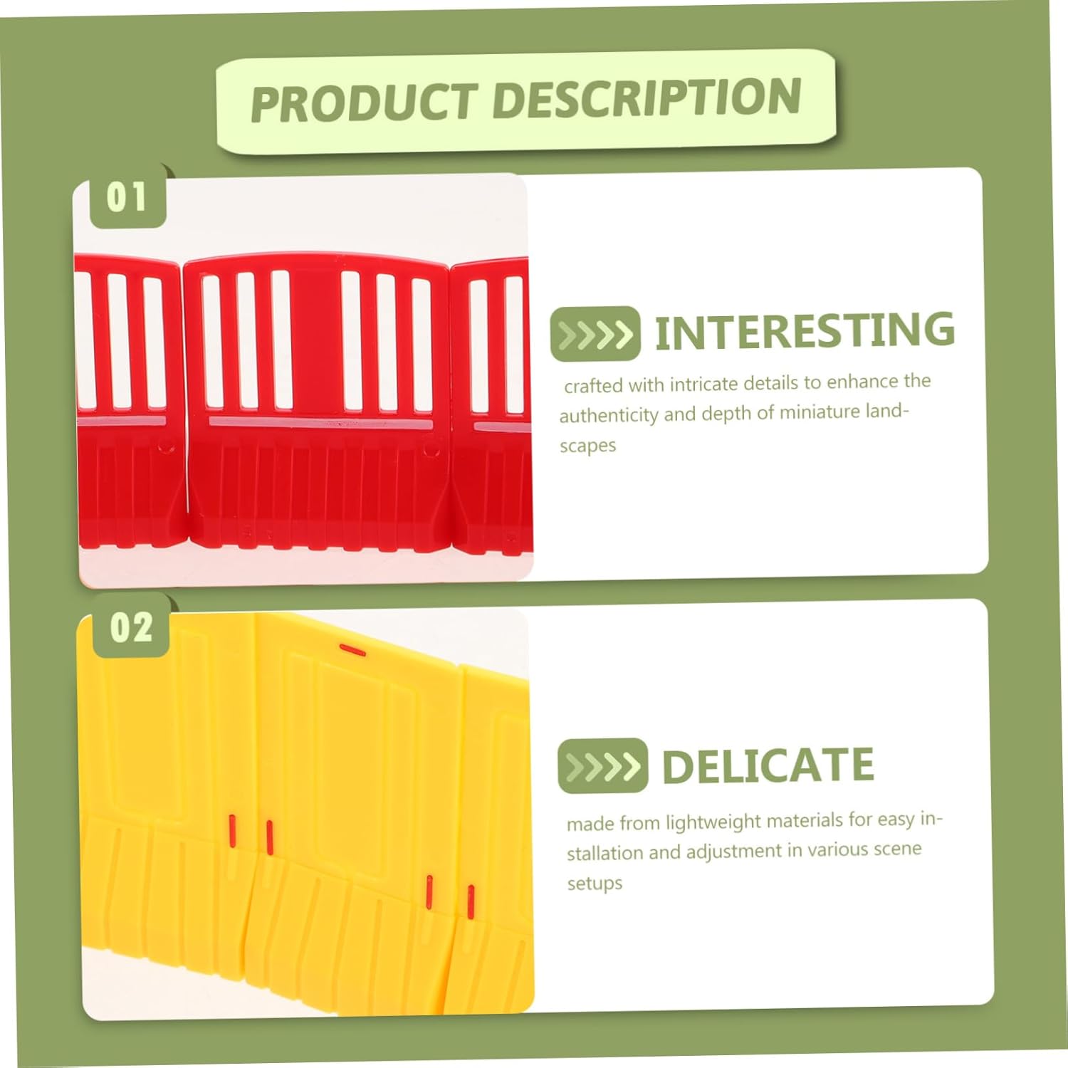 Texture : delle recinzioni per un'esperienza modellismo , miniescavatori, giocattoli per la sicurezza Dimensioni adattabili: compatibili con la maggior parte dei modelli in miniatura, offrendo versatilità nelle configurazioni creative, modellismo in miniatura, mini coni arancioni Design: aggiunge dettagli intricati ai in miniatura, creando scene realistiche e coinvolgenti, città in resina per in miniatura, mini oggetti scena per decorazioni paesaggistiche Design realistico: realizzato con dettagli intricati per migliorare l'autenticità e la profondità dei in miniatura, modello scenario in miniatura, kit in miniatura Dimensioni versatili: progettato per adattarsi alla maggior parte dei modelli in miniatura, offrendo flessibilità per composizioni paesaggistiche creative, recinzioni decorative da , mini recinzioni