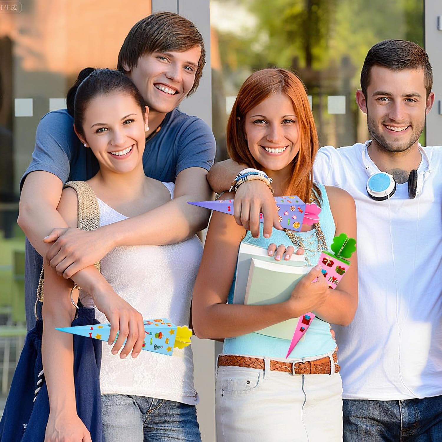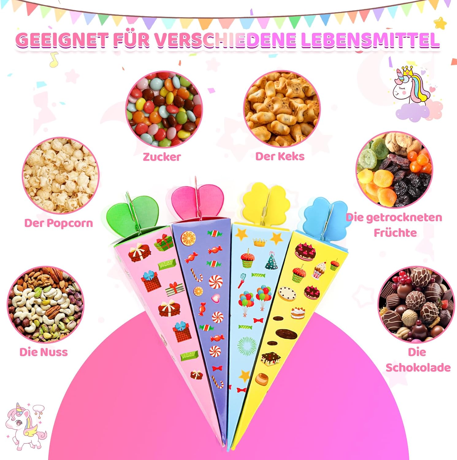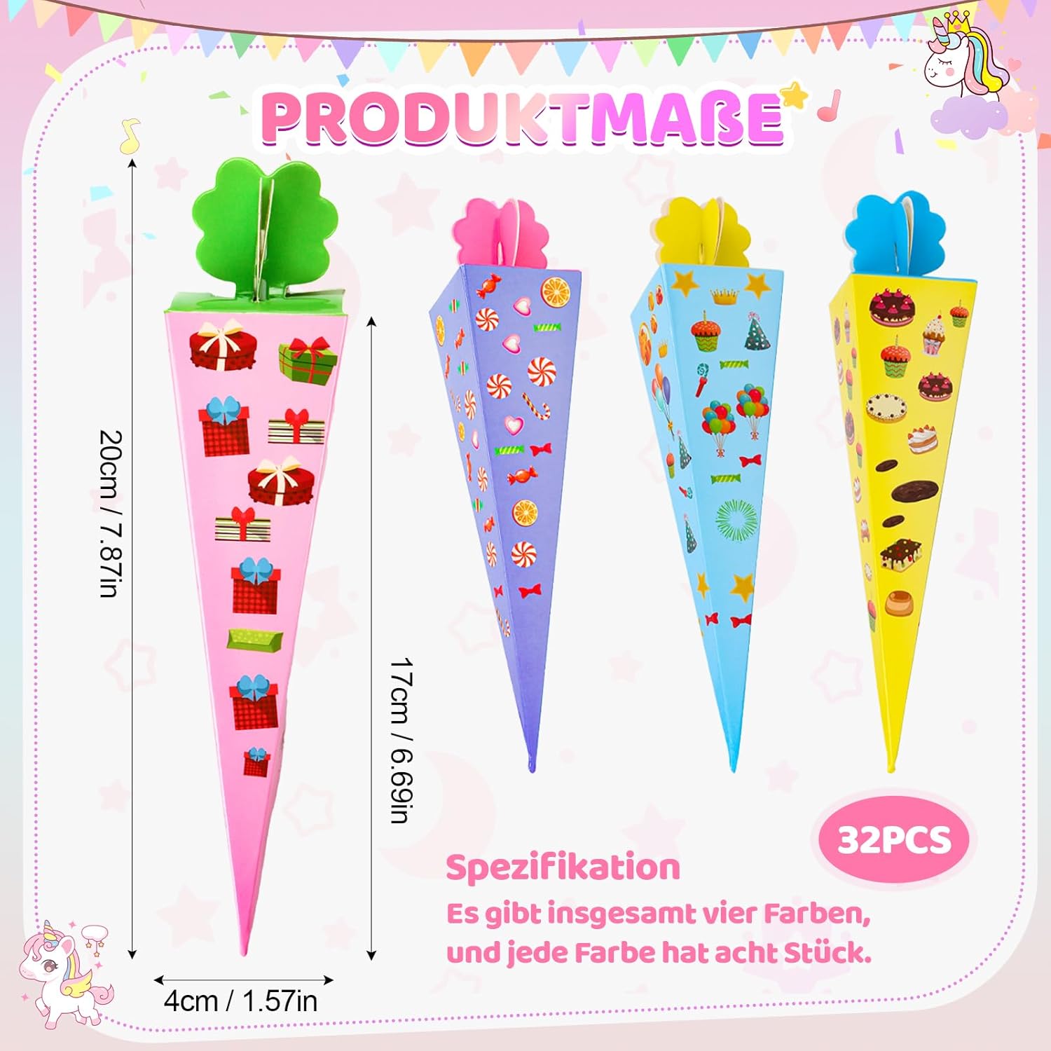 Piccolo cono per la scuola: riceverai 32 piccoli coni in 4 diversi colori. La composizione colorata non lascia nulla a desiderare, ideale per ragazze e ragazzi. Mini sacchetti per la scuola da riempire, quantità sufficiente per l'uso quotidiano e da condividere. Stabile e durevole: i piccoli sacchetti per la scuola da riempire sono realizzati in materiale robusto e resistente agli strappi. Sono robusti, durevoli e offrono spazio sufficiente per caramelle, piccoli regali e sorprese. Dopo il montaggio, l'altezza è di circa 20 cm, perfetto per l'inizio della scuola. Facile da montare: il piccolo cono per la scuola viene fornito in confezione piatta, è facile da montare, sicuro e atossico e facile da piegare. Piegare il mini cono per la scuola semplicemente lungo le linee prepiegate, riempirlo con piccoli dolci e snack, e voi e i vostri bambini potete creare bellissimi sacchetti per la scuola. Multiuso: il piccolo cono per la scuola è adatto come accessorio per feste per il primo giorno di scuola di ragazzi e ragazze, come regalo per l'inizio della scuola, come accessorio per la confezione regalo e può essere utilizzato come piccolo regalo per l'inizio della scuola, piccolo pensierino per gli amici della scuola o come pensierino. Cono piccolo per regali di addio all'asilo e alla scuola Regalo perfetto: il cono per la scuola dei fratelli per ragazzi e ragazze è carino e nobile ed è perfetto come regalo per l'inizio della scuola, come sacchetto per fratelli, confezioni regalo, regalo di addio all'asilo, decorazione per feste o come accessorio di abbigliamento. Trascorri una giornata indimenticabile con i tuoi figli.