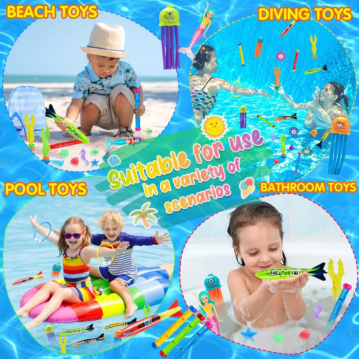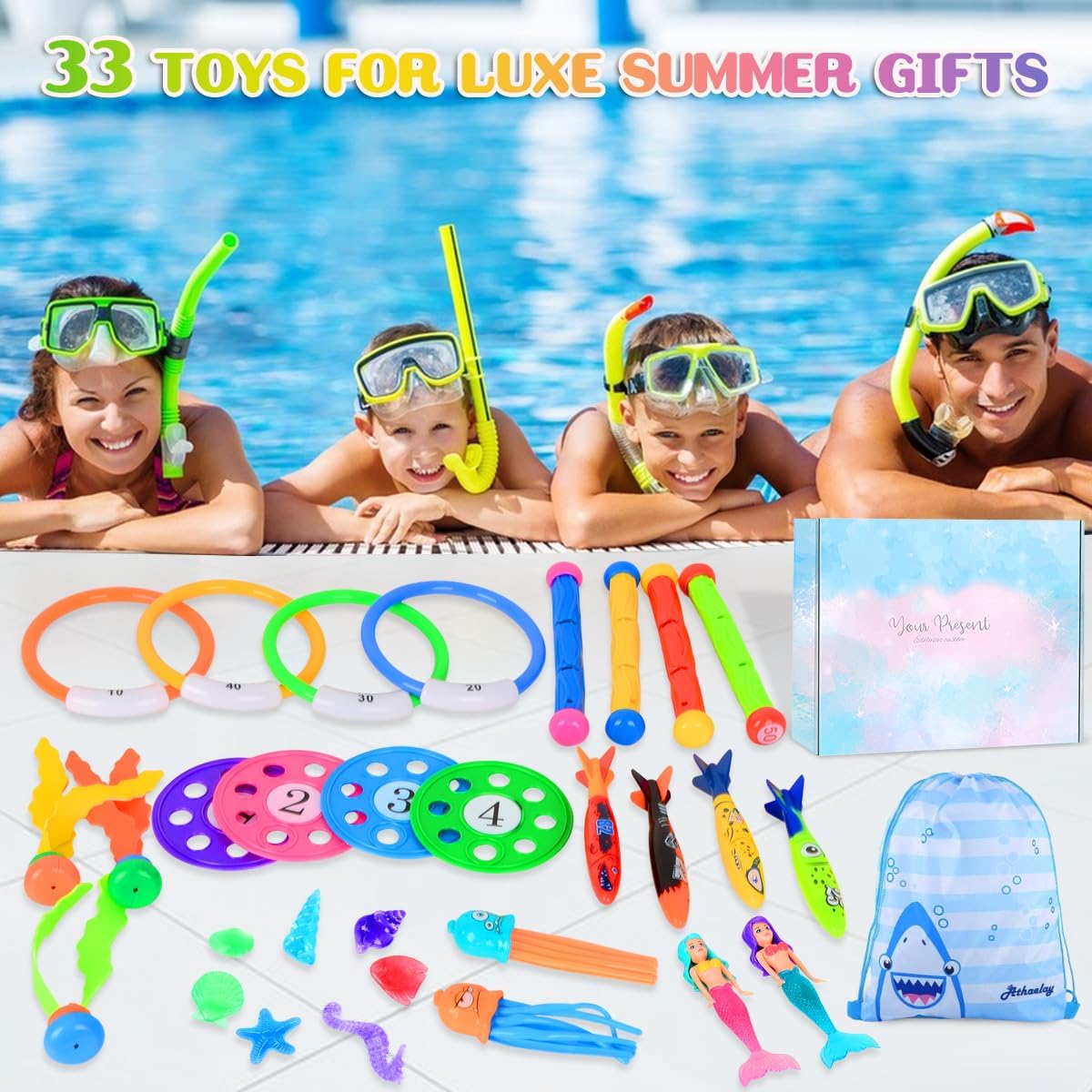 Set di Giocattoli per Piscina per Bambini: Set da giocattolo subacqueo set include 33 pezzi: 4×bastoncini subacquei, 4×siluri subacquei numerati, 3×alghe subacquee, 3×meduse subacquee, 4×anelli subacquei numerati, 2×sirene trasparenti, 4×dischi volanti subacquei, 7×gemme subacquee, 1×sacchetto con cordoncino personalizzato e 1×elegante scatola regalo. Materiali Sicuri ed Ecologici: Realizzati in PVC e PP atossici, i nostri giocattoli da immersionecon sono resistenti, sicuri ed ecocompatibili. I bordi lisci garantiscono che il bambino non si ferisca durante la presa, permettendovi di lasciarli giocare in totale tranquillità. Migliora le Abilità Subacquee: Questi giocattolo per piscina subacquea rendono il tempo in piscina più divertente, aiutando i bambini ad amare nuotare e immergersi. Giocando, sviluppano coordinazione subacquea e controllo del respiro. Colori Vivaci e Design Verticale: Progettati seguendo i principi della gravità, i giocattolo subacqueo affondano bene e rimangono in posizione verticale sul fondo della piscina. I colori brillanti aiutano i bambini a individuarli facilmente sott’acqua, aumentando la loro fiducia. I giocattoli numerati migliorano anche le abilità di apprendimento matematico. Regalo Perfetto per Bambini dai 3 ai 12 Anni: Giocattoli da Piscina con Anelli Giocattolo Ideale per bambini e bambine dai 3 ai 12 anni. La varietà di giocattoli coinvolge famiglie e amici, rafforzando le abilità subacquee e creando momenti di complicità gioiosa.