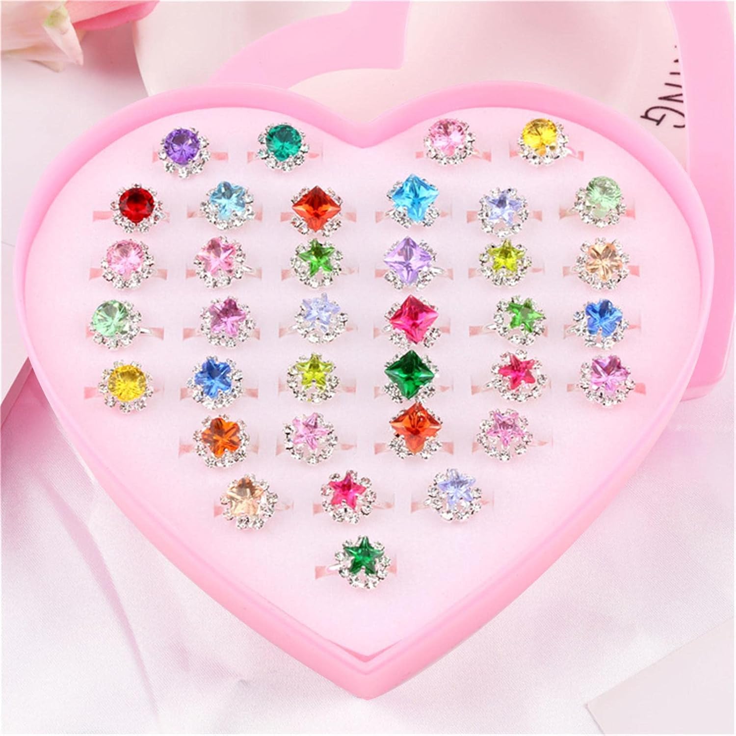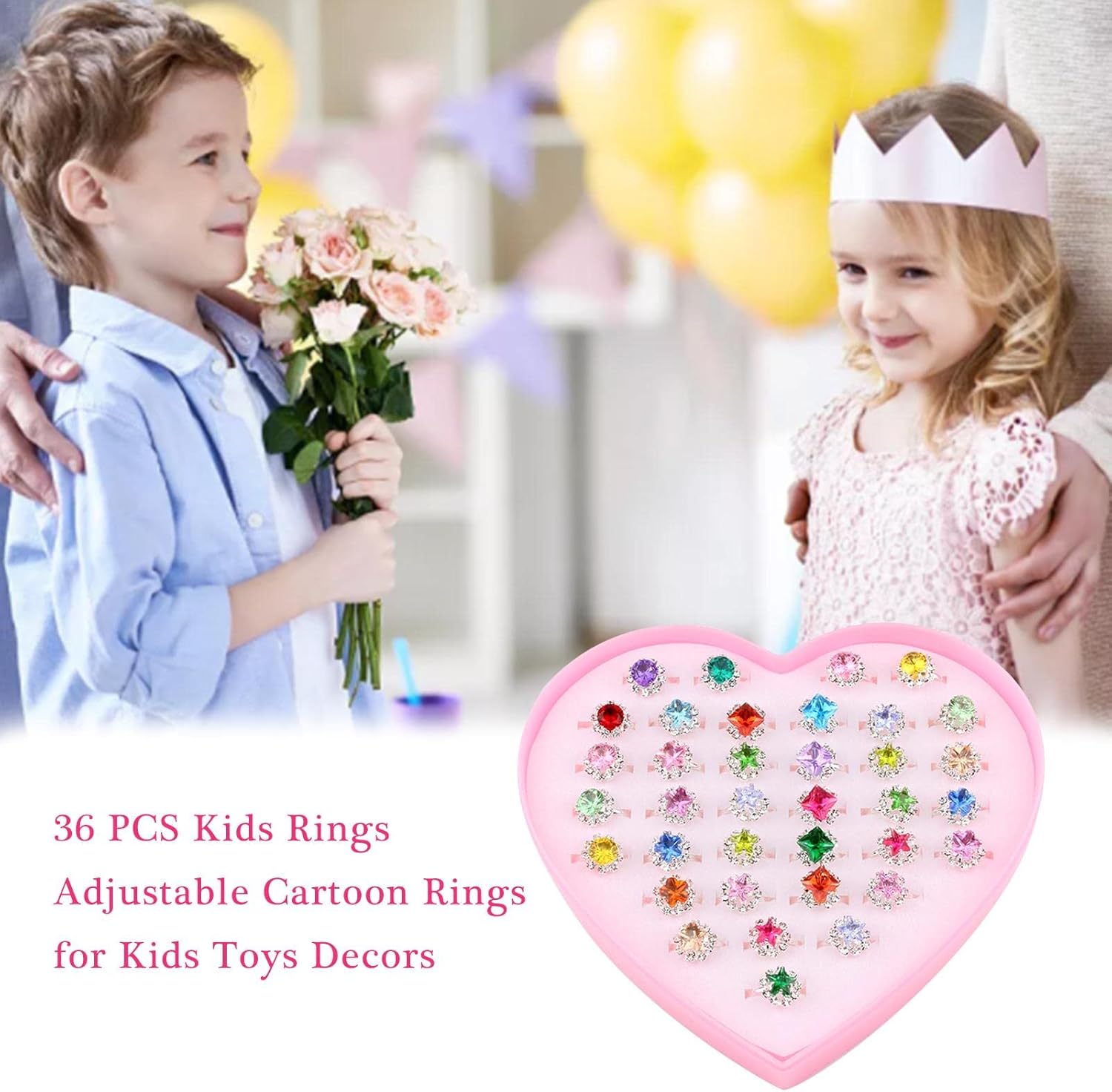 ️ LA CONFEZIONE COMPRENDE: 36 diversi anelli per bambini con una scatola rosa a forma di cuore, design raffinato e carino, la scelta migliore per accessori per bambini e regali di compleanno per bambine ️ MORBIDI E DUREVOLI: gli anelli per bambini per ragazze sono realizzati in acrilico e metallo di alta qualità, comodi al tatto. Questi anelli possono essere regolati per adattarsi alle dita. Non preoccuparti prima dell'acquisto. ️ STILI DIVERSI: Esistono molti stili di anelli, fiori, stelle, cuori, conigli per ragazze; diversi colori, blu, rosa, viola. Affascinerà sicuramente la bambina. ️ AGGIUNGI ALL'OUTFIT: questi squisiti e bellissimi anelli per bambini sono coordinati con diversi colori e temi. Scegline uno da indossare al dito ogni giorno e ti sentirai ogni giorno piacevolmente sorpreso e felice. ️ REGALO PERFETTO: anelli carini e graziosi. Abbiamo confezionato questi anelli per ragazze con scatole regalo a forma di cuore, è un buon regalo per la tua principessa. Buono per occasioni speciali come feste di compleanno, feste di Natale