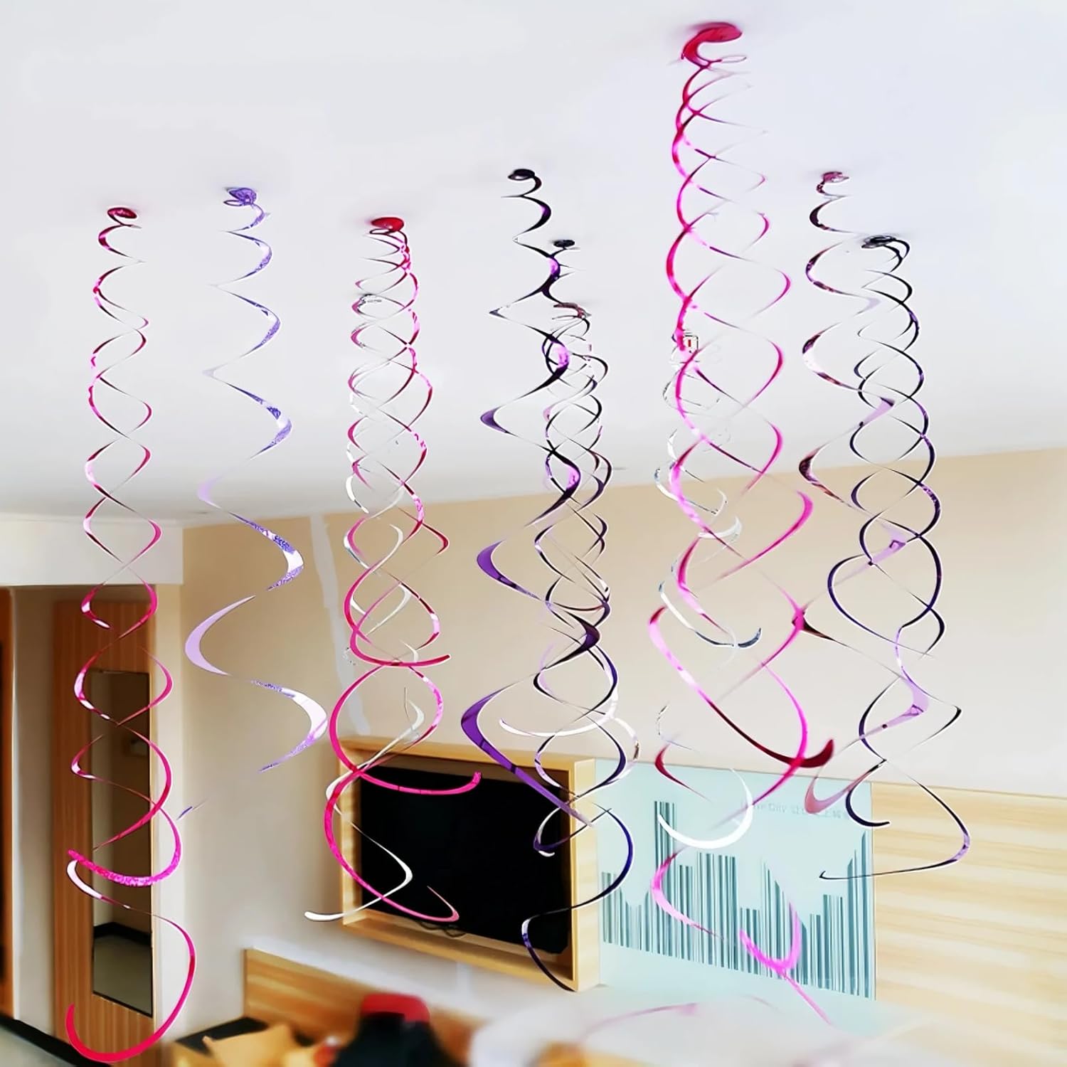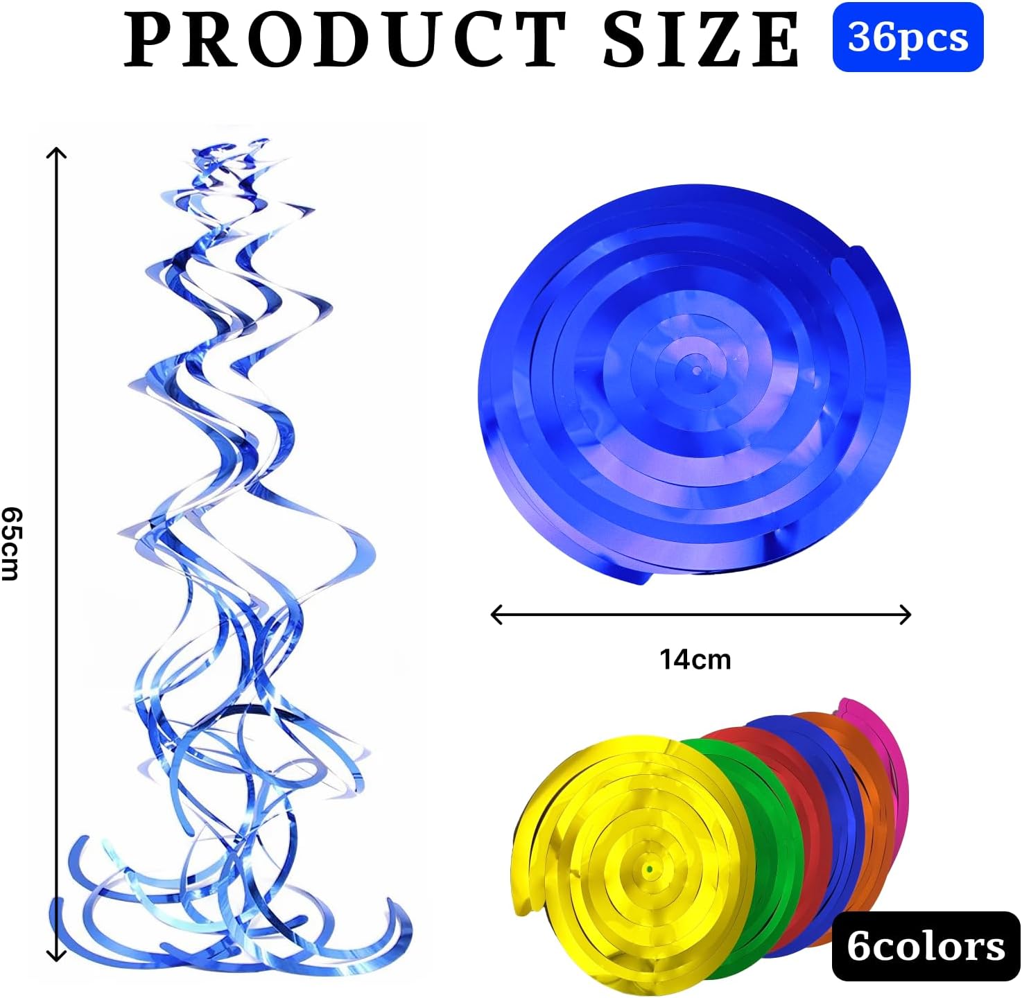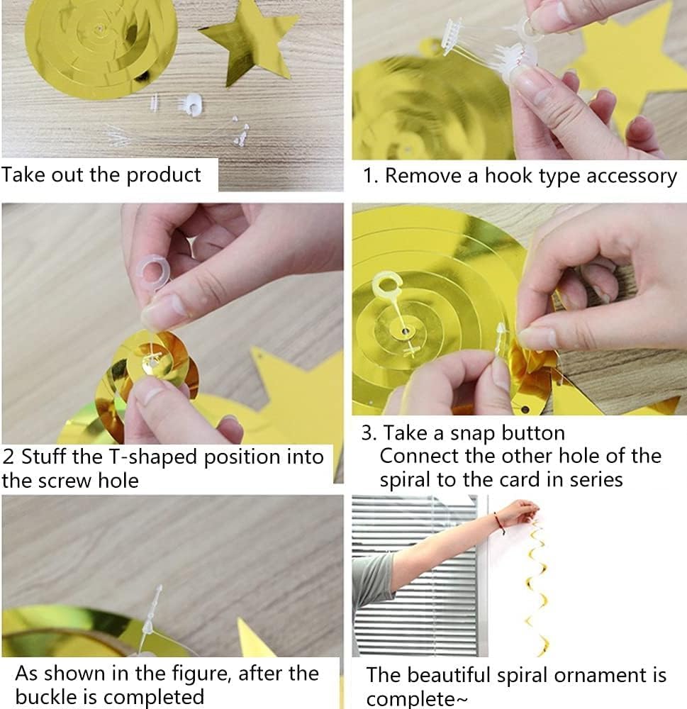 Materiale di alta qualità e riutilizzabile: le nostre ghirlande a spirale sospese sono realizzate in PVC resistente e lucido. Sono leggeri, resistenti agli strappi, alle intemperie e possono essere utilizzati più volte, perfetti per pianificare feste a lungo termine. Dimensione ideale per ogni decorazione: ogni spirale è di circa 65 cm di lunghezza e crea un effetto accattivante della stanza. La dimensione è ideale per soffitti bassi e alti e telai delle porte ed è ideale per decorare aree più grandi. Varietà colorata in 5 colori festivi: il set contiene un totale di 36 spirali in 6 colori vivaci: 6 oro, 6 rossi, 6 arancioni, 6 rosso rosa, 6 blu scuro e 6 verdi. Questa combinazione di colori crea un ambiente vivace e solenne in ogni occasione. Facile da appendere con gancio: ogni spirale è dotata di un robusto gancio in plastica sulla parte superiore. Si attaccano facilmente a soffitti, lampade, porte o infissi e possono essere facilmente rimossi e riposti se necessario. Ampia gamma di usi per tutte le occasioni: perfetto per feste di compleanno, matrimoni, baby shower, carnevale, Natale, Capodanno, Halloween, lauree e altro ancora. Nella parte inferiore è presente un anello per attaccare foto, ciondoli o scritte.