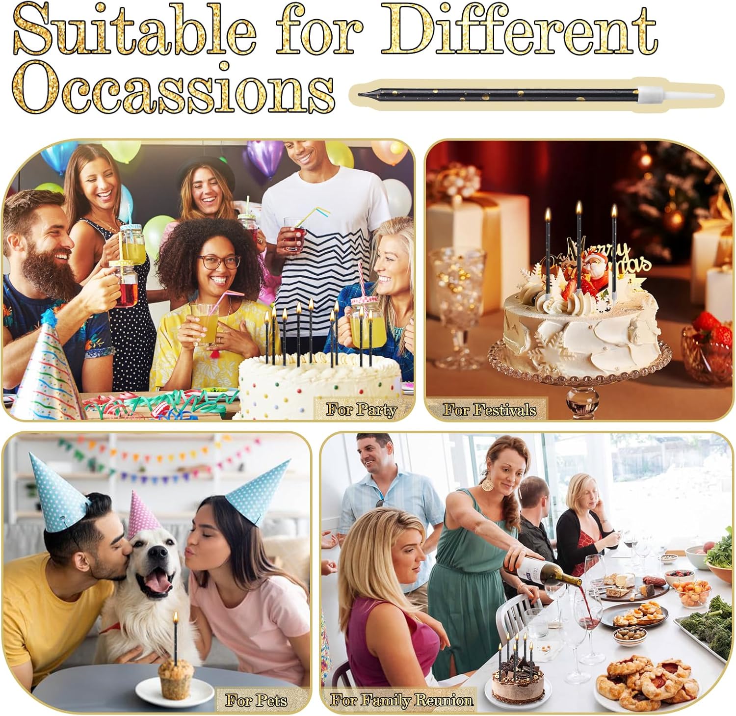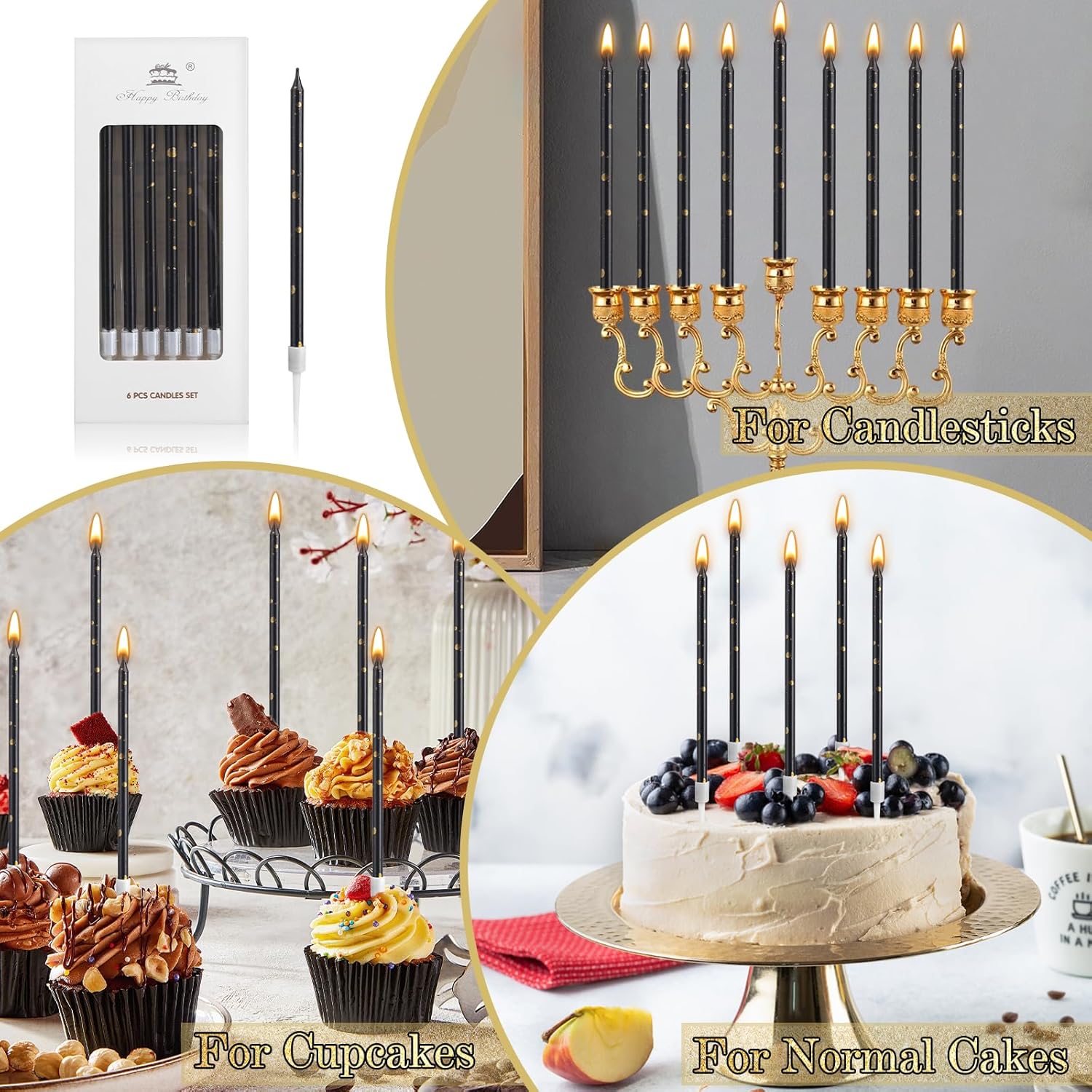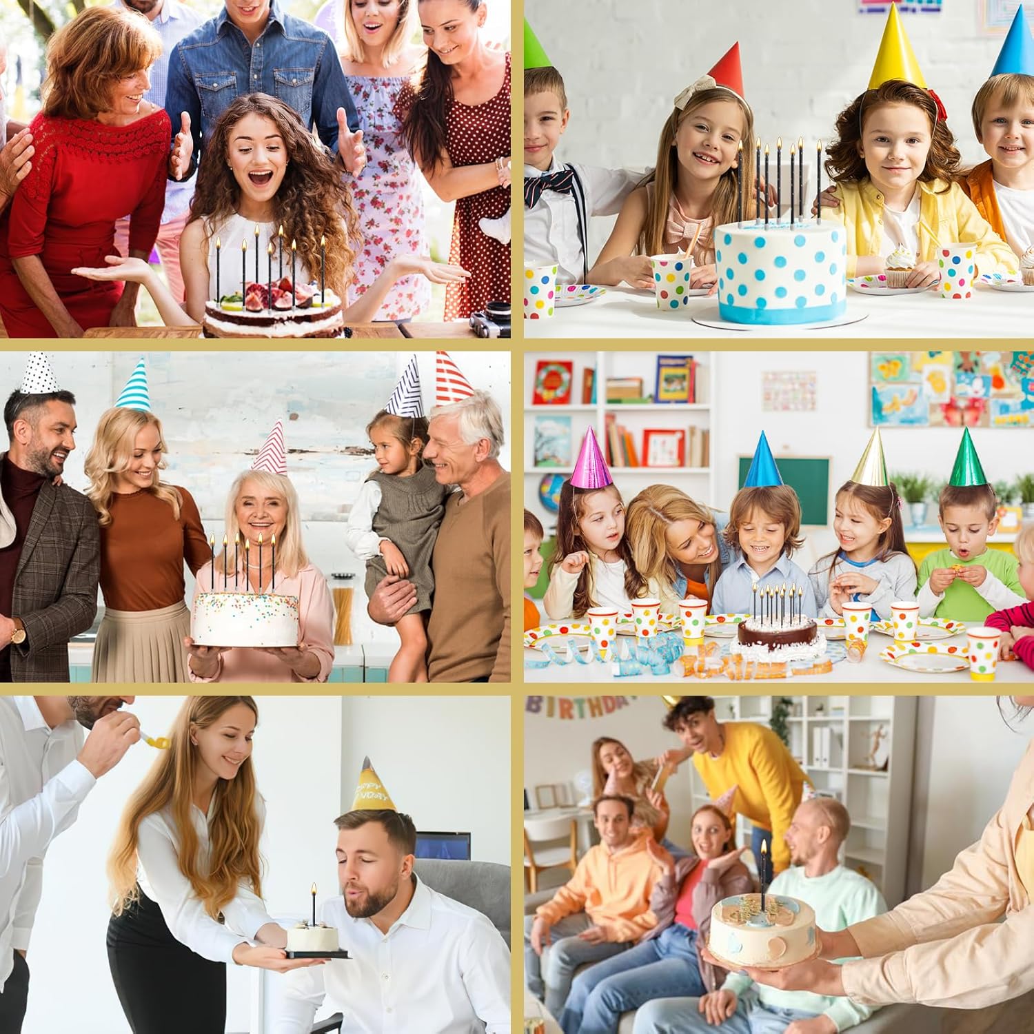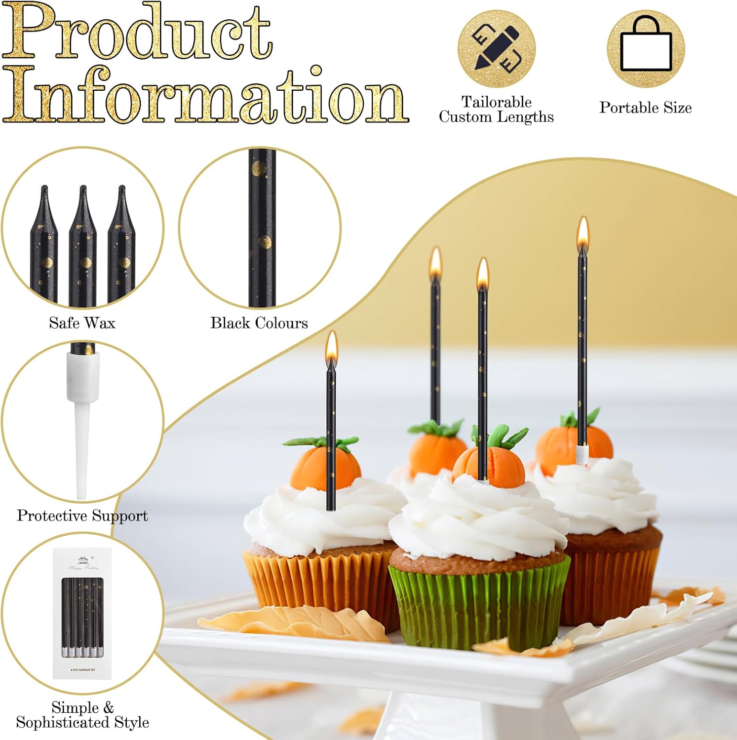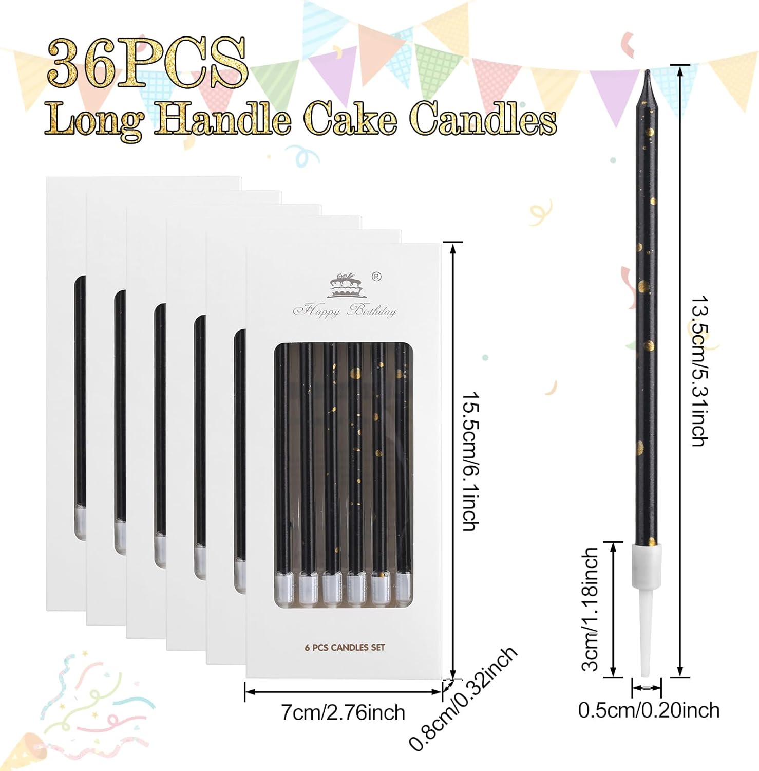 Candele di compleanno sottili e lunghe per torta: riceverete 36 candele di compleanno in 6 scatole, ogni scatola contiene 6 candele. L'aspetto delle candele di compleanno è molto sottile e bello. Sono squisite decorazioni per torte, adatte per compleanni, baby shower, matrimoni, Natale, San Valentino, feste e qualsiasi occasione speciale. Crea un'atmosfera calda e luminosa Decorazioni per compleanno in oro nero: le nostre candele per compleanno sono realizzate in materiale cerato di alta qualità, non contengono sostanze nocive, sono inodori, atossiche, sicure e affidabili. La candela di compleanno kuchen ha un corpo nero con lamina d'oro e un rivestimento lucido per rendere la candela più delicata. È anche il regalo perfetto per te o per la persona che ami. Accendi una candela e i tuoi bei desideri si avvereranno Dimensioni portatili: ogni candela da torta è alta circa 13,5 cm e può bruciare circa 3-5 minuti. Con esso, puoi cantare diversi round di "Buon compleanno". La dimensione del supporto in plastica bianca è di circa 3 cm, che non solo può essere facilmente introdotta nella torta, ma impedisce anche il fumo di cera durante il processo di combustione. La torta non cambierà il suo colore e garantisce così più ordine durante tutta la festa Ampia gamma di utilizzi: l'aspetto delle candele di compleanno è molto sottile e bello. Le candele per torta di compleanno sono squisite decorazioni per torte, adatte per compleanni, baby shower, matrimoni, Natale, San Valentino, feste e qualsiasi occasione speciale. Adatto anche per la decorazione di pasticcerie, caffetterie e panifici. Crea un'atmosfera calda e luminosa Precauzioni : 1. Quando si utilizzano candele per torte di compleanno, tenere le candele in posizione verticale e non posizionarle orizzontalmente o inclinate. 2. La base della candela può staccarsi o cadere durante il trasporto. Si prega di installare prima dell'uso. 3. Le candele torte devono essere conservate lontano da fonti di calore e fiamme libere