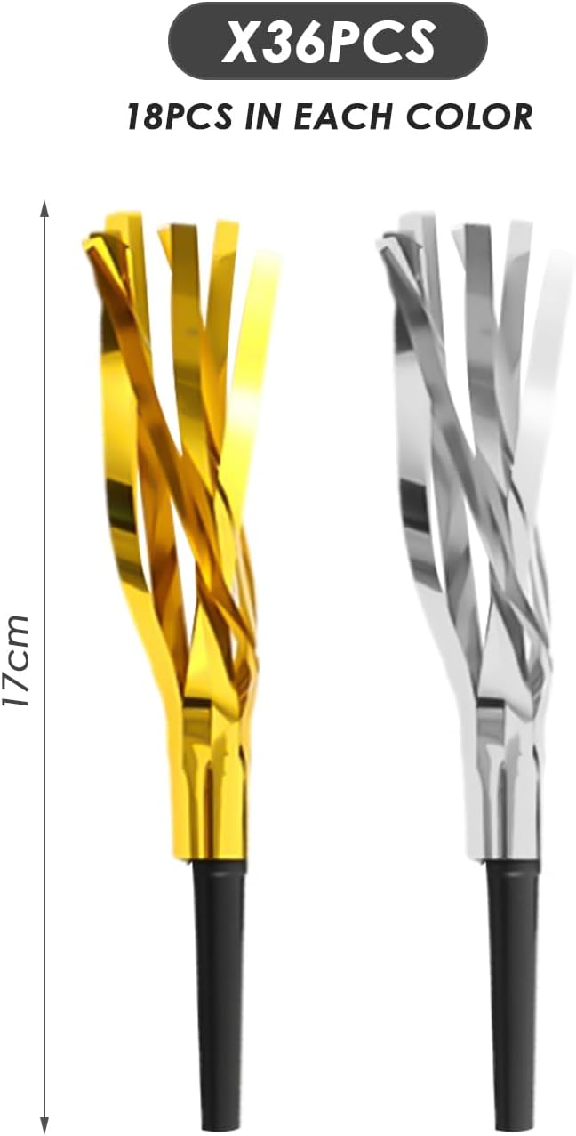 【Contenuto Del Prodotto】Riceverai 36 Pezzi Di Produttori Di Rumore Per Feste. 18 Pezzi Di Ogni Colore. La Dimensione È 17 Cm E I Colori Includono Oro E Argento, Adatti A Varie Feste E Celebrazioni. 【Materiale Del Prodotto】 Questo Prodotto È Realizzato In Plastica, Leggera E Resistente. Il Materiale Plastico Garantisce Che Non Si Danneggi Facilmente Durante L'Uso Ed È Adatto Al Gioco Dei Bambini E A Molteplici Usi. 【Design Unico】 Questo Prodotto Presenta Un Design Unico, Dotato Di Nappe Lucide E Un Generatore Di Rumore, Che Può Produrre Suoni Interessanti Quando Utilizzato, Aggiungendo Atmosfera Alla Festa. Il Design In Oro E Argento Lo Rende Ancora Più Magnifico Ed È Adatto A Varie Decorazioni Per Feste A Tema. 【Facile Da Usare】 Questo Articolo È Facile Da Usare. Basta Scuoterlo O Ruotarlo Delicatamente Per Fare Rumore E Può Essere Facilmente Utilizzato Dai Bambini. Non È Necessaria Alcuna Installazione O Preparazione Complicata Per Rendere La Tua Festa Divertente E Piena Di Energia. 【Ampia Applicazione】 Non Adatto Solo Per Feste Per Bambini, Ma Anche Per Varie Celebrazioni Come Feste Di Compleanno, Feste, Matrimoni, Feste Di Laurea, Ecc. Non Importa Se Si Tratta Di Un Evento Al Chiuso O All'Aperto, Questi Rumori Porteranno Risate Al Tuo Evento .