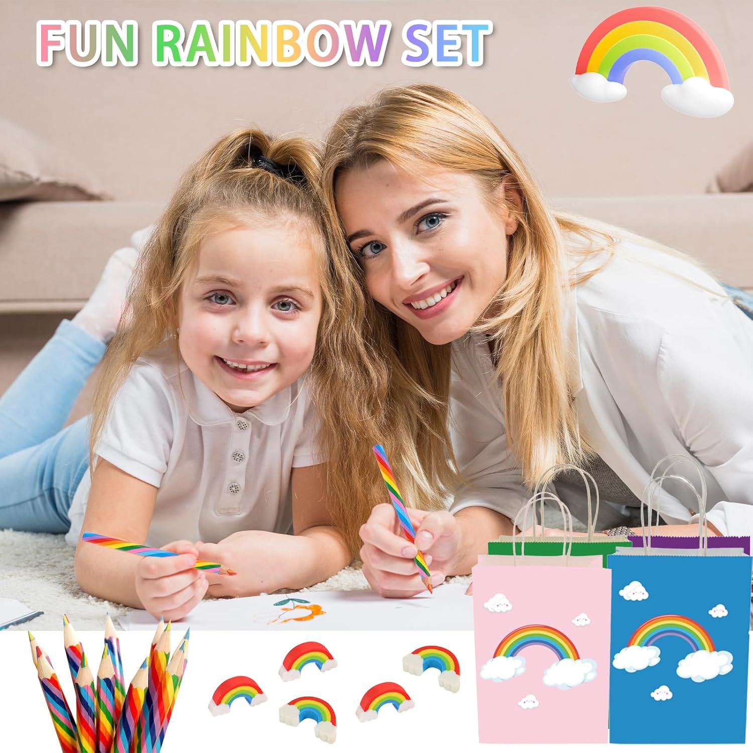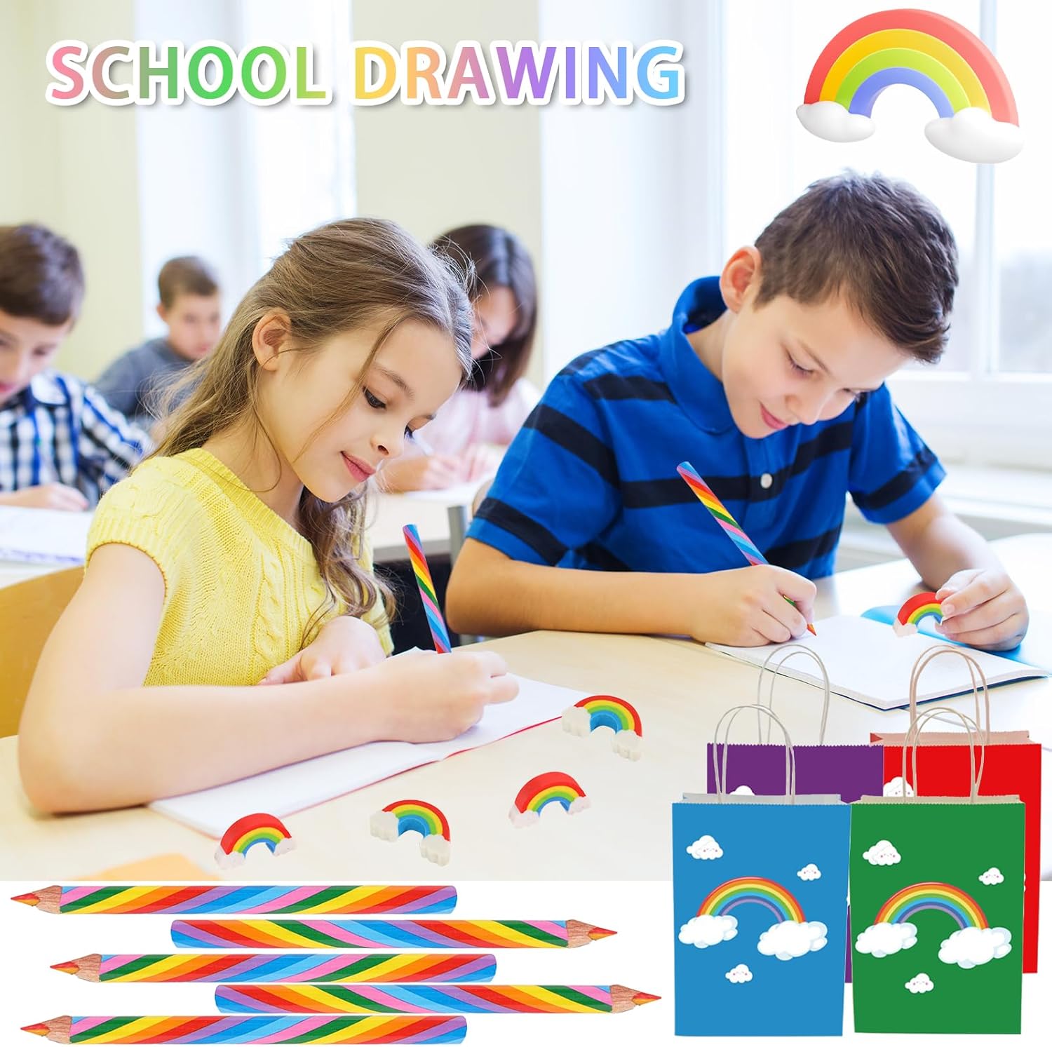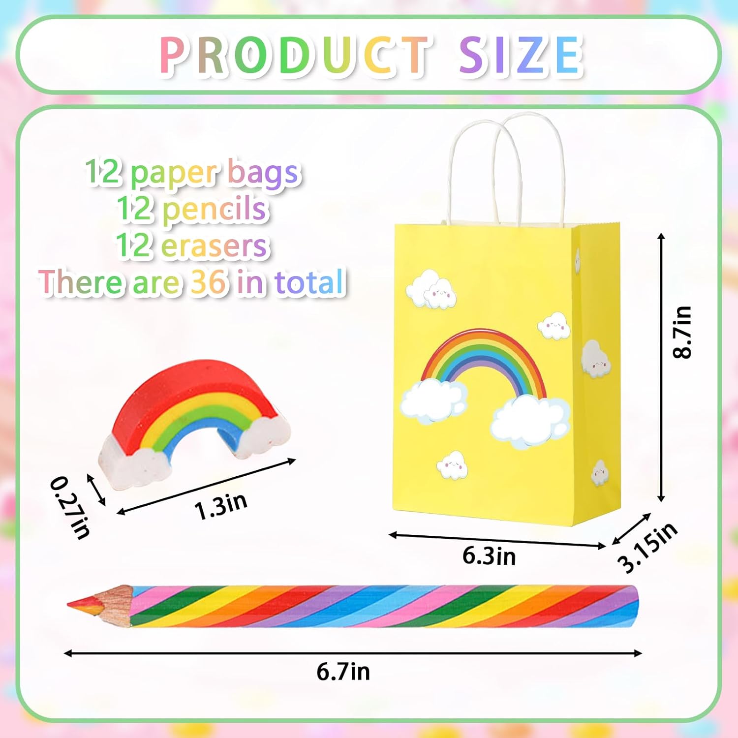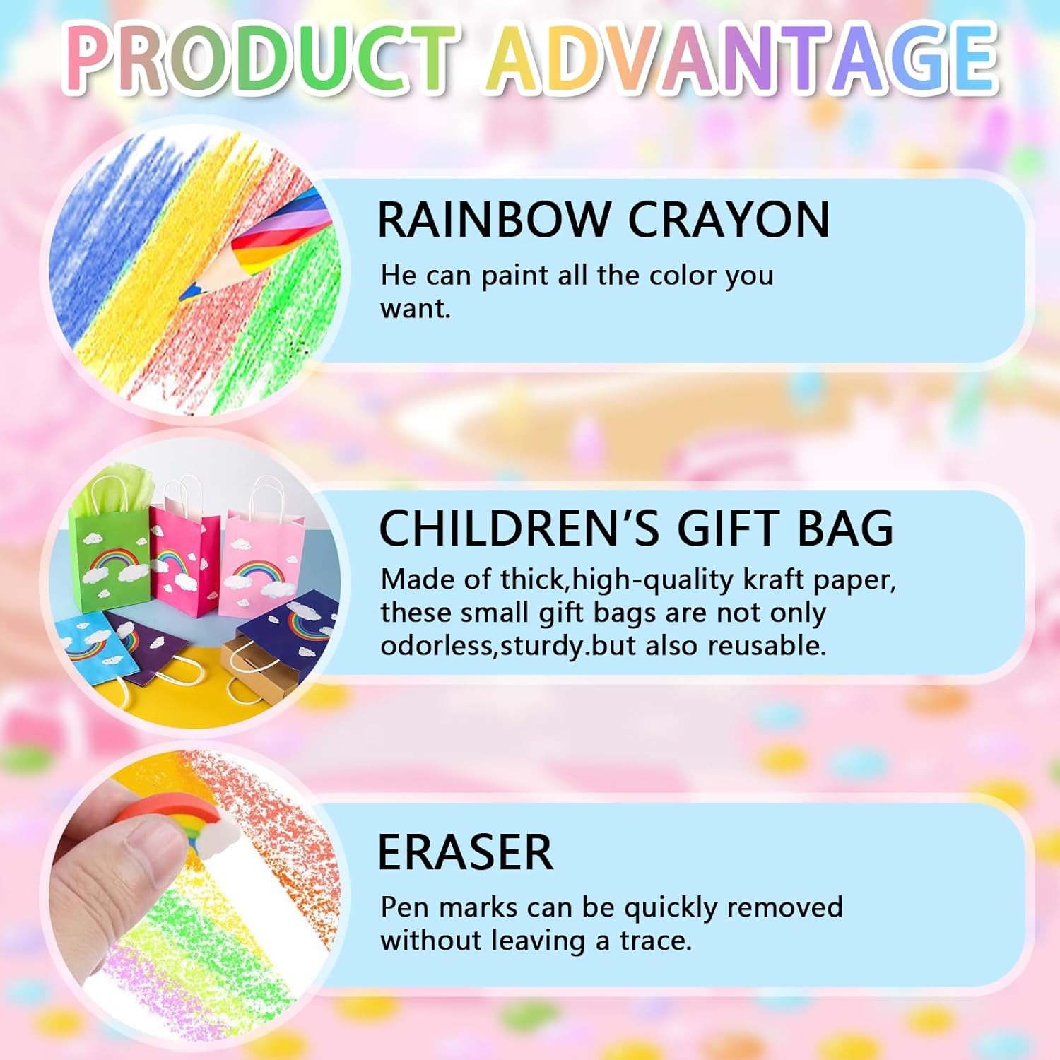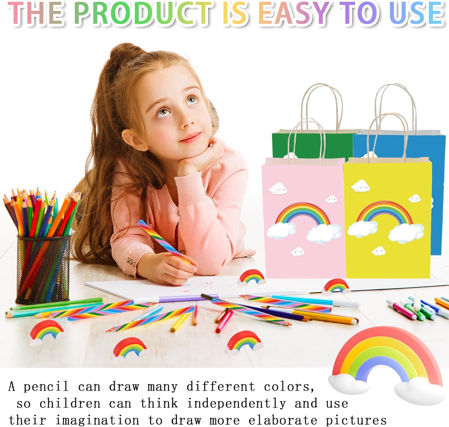 【Set di Cancelleria Arcobaleno】La confezione contiene 12 matite colorate arcobaleno e 12 gomme dai colori arcobaleno e 12 Sacchetti Regalo di Carta Arcobaleno,permettendoti di disegnare linee colorate che soddisfano i tuoi vari usi, come disegno, schizzo, pittura 【Design Arcobaleno】la superficie delle nostre matite colorate è decorata con motivi accattivanti e colorati che non si annoieranno mai. Le simpatiche gomme arcobaleno hanno una forma unica e attirano l'attenzione dei bambini,particolarmente adatti per coltivare la creatività e l'immaginazione di bambini e principianti di età diverse 【Colore arcobaleno 4 in 1】Il nucleo della matita è composto da quattro colori: rosso, giallo, blu e verde.La cosa più sorprendente di questa matita è che quando disegni, puoi ruotare la penna per ottenere colori diversi, ben oltre la tua immaginazione, con curve e linee colorate 【Materiale Di Alta Qualità】I sacchetto regalo arcobaleno sono realizzati in carta kraft di alta qualità, che non solo ha un'eccellente resistenza allo strappo e all'abrasione, ma è anche leggero ma robusto e durevole.La matita colorata è realizzata in legno naturale e resistente, materiali atossici e inodori, infrangibili, sicuri e salutari per il corpo umano, puoi usarli a lungo.Le gomme TPR di alta qualità offrono una pulizia morbida per correggere facilmente gli errori e rendere l'immagine perfetta 【Regalo perfetto】regalo per compleanni o altre occasioni speciali.Il nostro set di matite arcobaleno è il regalo perfetto per i piccoli artisti.Particolarmente adatti per il regalo di festa, regalo di Natale, regalo di ritorno a scuola, regalo di laurea e premio per gli studenti in classe
