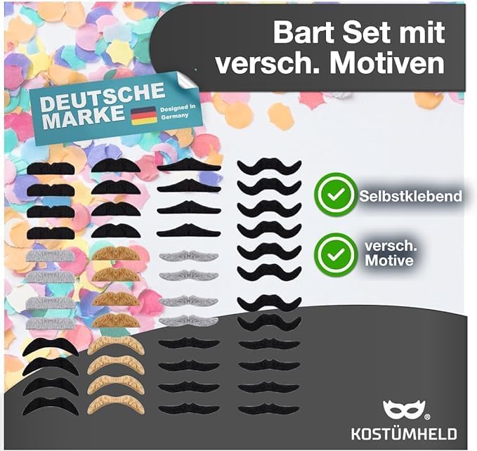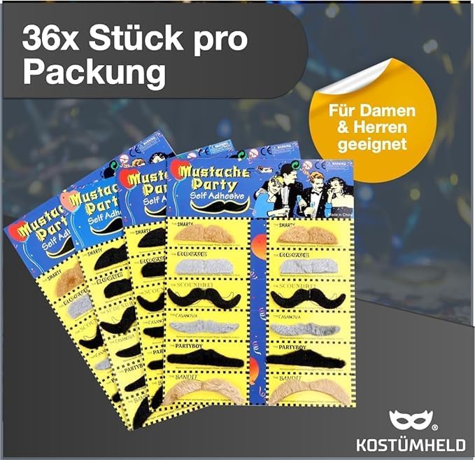Numerose applicazioni possibili per le barbe da incollare: Sombrero Mexico, boss mafioso - costume da mafioso, baffi, Supermario e Luigi, Village People, costume 1920, Freddie Meccury e molto altro. Da attaccare: Facile fissaggio della barba con superficie autoadesiva Baffi adatti a uomini e donne - L'aggiunta perfetta al costume da festa perfetto - Baffi - Baffi finti come barba finta per carnevale e Halloween Avete bisogno di un modo semplice e veloce per cambiare il vostro look per una festa in maschera o per carnevale? Allora siete pronti con le 36x barbe autoadesive con baffi, baffetti e baffoni! Create il look perfetto con questi ornamenti facciali rimovibili, sia per divertirvi che per arricchire il vostro stile quotidiano. Queste barbe di alta qualità sono disponibili in misure universali che si adattano perfettamente ai contorni del viso della maggior parte delle persone. Sono facili da applicare sulla pelle e sono costituite da due strati separati che si uniscono al contatto: uno strato assicura una vestibilità aderente e fornisce un maggiore comfort quando vengono indossate. Sono inoltre resistenti al sudore, agli strappi e all'acqua, per cui possono essere indossati sia di giorno che di notte. Scegli 36x barbe autoadesive con baffi barba e baffi se stai cercando un modo semplice ma efficace per decorare il tuo costume in maschera ad una festa in maschera o creare più personaggi festivi in pochissimo tempo!