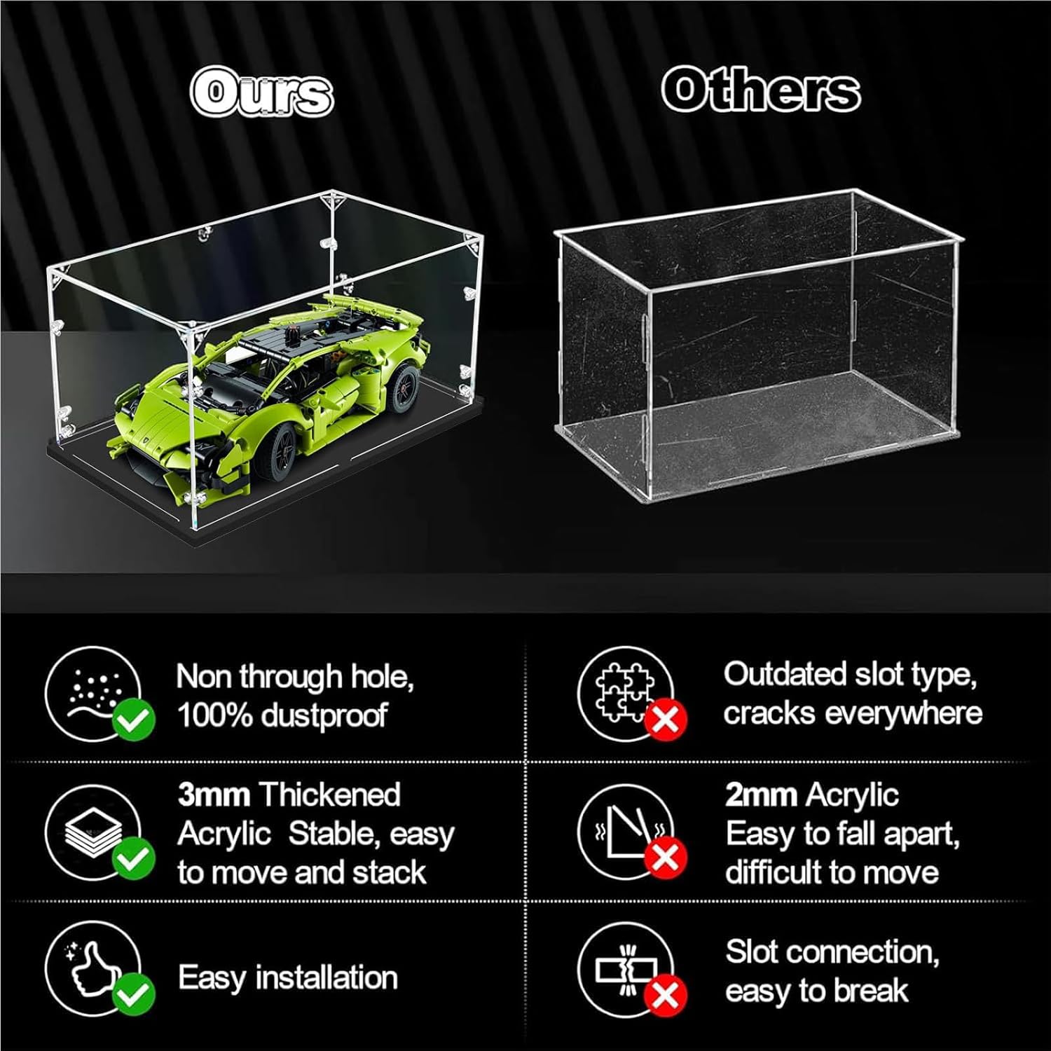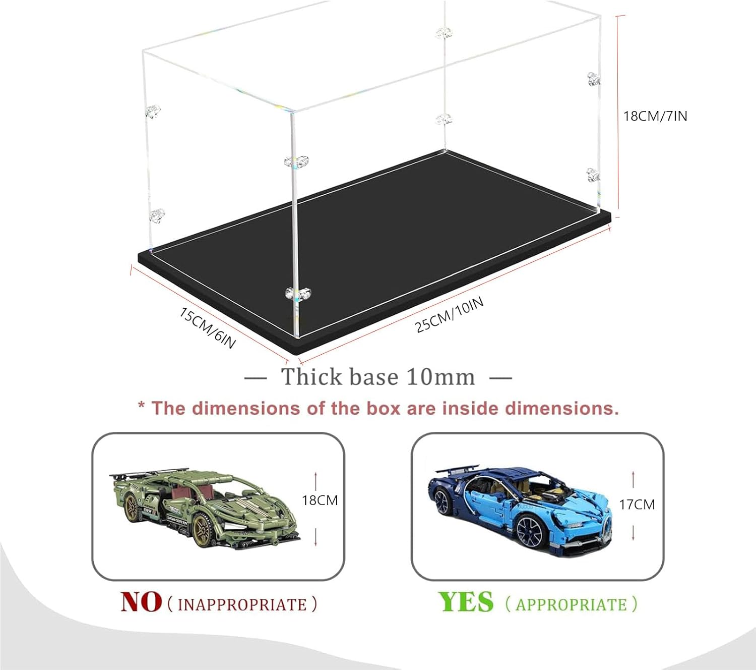 【DIMENSIONE】 Seleziona la dimensione indicata. Le dimensioni indicate nel titolo sono tutte dimensioni interne. NOTA: Ogni prodotto ha protezione film doppio lato, Burrs sul bordo è un film protettivo, si prega di strappare prima di usare. 【TRASPARENZA ESTREMAMENTE ALTA】Queste vetrine da collezione sono fatte di acrilico trasparente, robusto, resistente e trasparente, rendono l'effetto di visualizzazione artistico e bello. Acrilico premium spessore (spessore 3mm), riduce efficacemente la luce solare e le radiazioni UV. 【PACKAGE】 Espositorio in acrilico trasparente completamente assemblato con base nera. Acrylic Dustproof Protection Showcase include imballaggio protettivo per garantire un arrivo sicuro. 【SUPER CLEAN & MODERN LOOK ON YOUR PRODUCTS】 L'acrilico di qualità superiore offre un aspetto pulito e moderno per il vostro deposito di esposizione che può dare una vista elegante sulle vostre mostre. 【INSTALLAZIONE INNOVATIVA】Si prega di assemblare passo dopo passo secondo le istruzioni del manuale. Utilizzando fibbie di collegamento in acrilico trasparente, collegare facilmente due fogli di acrilico con un posizionamento preciso e sicuro. Può essere facilmente completato in pochi minuti. Questi risers display sono un ottimo modo per mostrare i vostri oggetti da collezione, manufatti, memorabilia sportivi, giocattoli, figurine, antiquariato, gioielli,. Può essere utilizzato a casa, nei negozi al dettaglio, nei musei o nelle fiere.