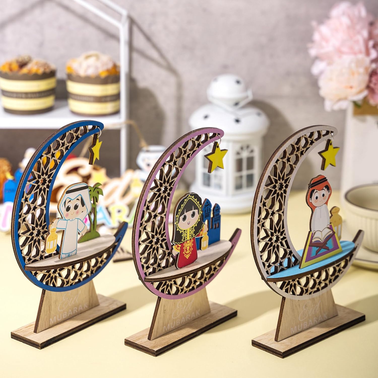 Ampiamente usato per la decorazione domestica, la celebrazione di Eid, l'impostazione di eventi religiosi e come regalo premuroso per le Migliora il tuo spazio abitativo con questa decorazione tradizionale, aggiungendo un tocco di eleganza e ricchezza culturale a qualsiasi ambiente Festeggia il festival Eid con il nostro squisito ornamento da scrivania a forma di stella luna, simbolo unico di benedizione che migliora l'ambiente del festival Molto adatto per famiglie religiose e appassionati di cultura mediorientale che cercano un'elegante decorazione da tavola per feste Realizzato in legno, questo cartello ornamentale da tavolo Eid presenta una sofisticata forma di luna e un design unico ritagliato, mostrando squisita fattura per un uso prolungato