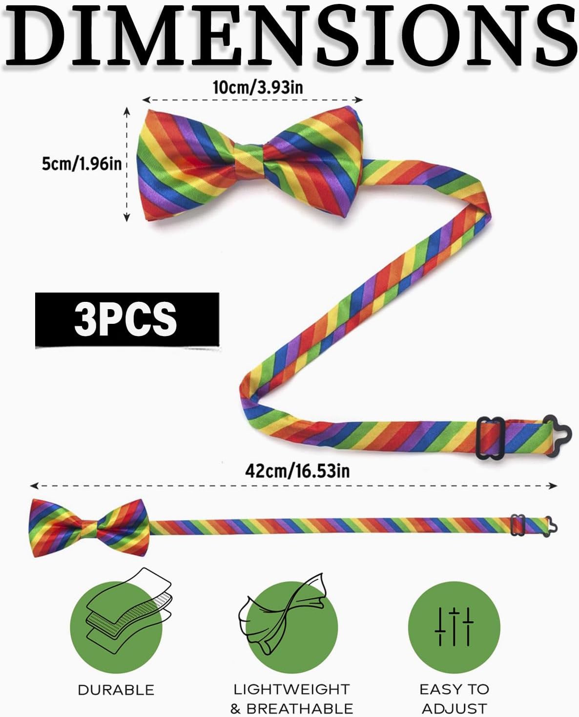 Contenuto della confezione: 3 papillon arcobaleno Bello e accattivante: aspettati la reazione delle persone: quando ti vedranno indossare un papillon arcobaleno, ti noteranno. Il nostro papillon è caratterizzato da sottili strisce arcobaleno oblique che gli conferiscono un aspetto arrotondato. VERSATILE: la nostra collana è un accessorio versatile che può essere indossato in una spaventosa notte di Halloween, a una festa scatenata di Mardi Gras o Mardi Gras e agli eventi del Pride. PERFEZIONA IL LOOK: aggiungi il tocco finale al tuo outfit e usa un papillon per completare alla perfezione il tuo outfit. Gli accessori arcobaleno sono l'aggiunta ideale per rendere il tuo outfit ancora più accattivante. Taglia universale: il papillon non solo offre molteplici opzioni di mimetizzazione, ma è anche comodo da indossare. Grazie al collare flessibile, può essere comodamente regolato per adattarsi a diverse misure del collo, senza causare fastidiose pressioni. Non perdere l'occasione di rendere speciale il tuo prossimo outfit, ordinalo oggi stesso!