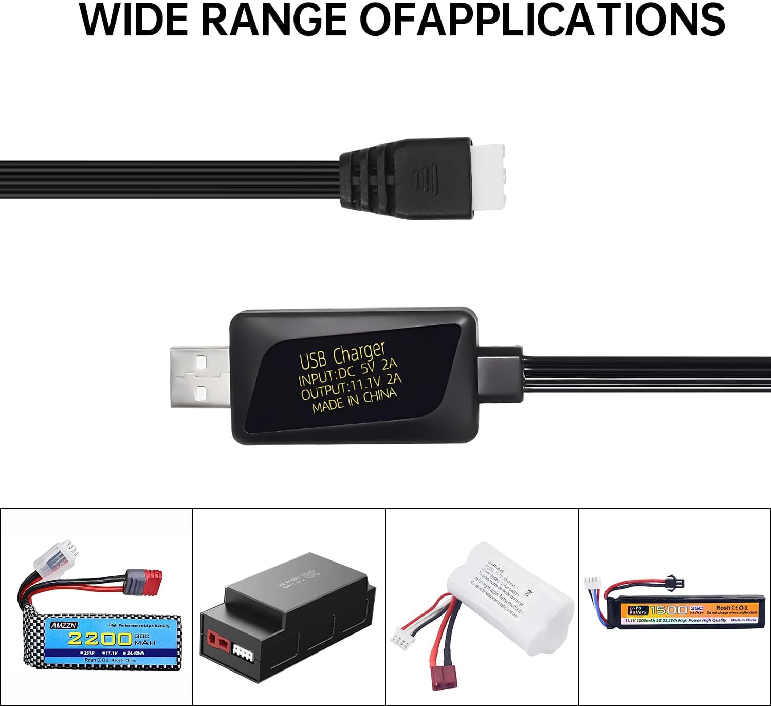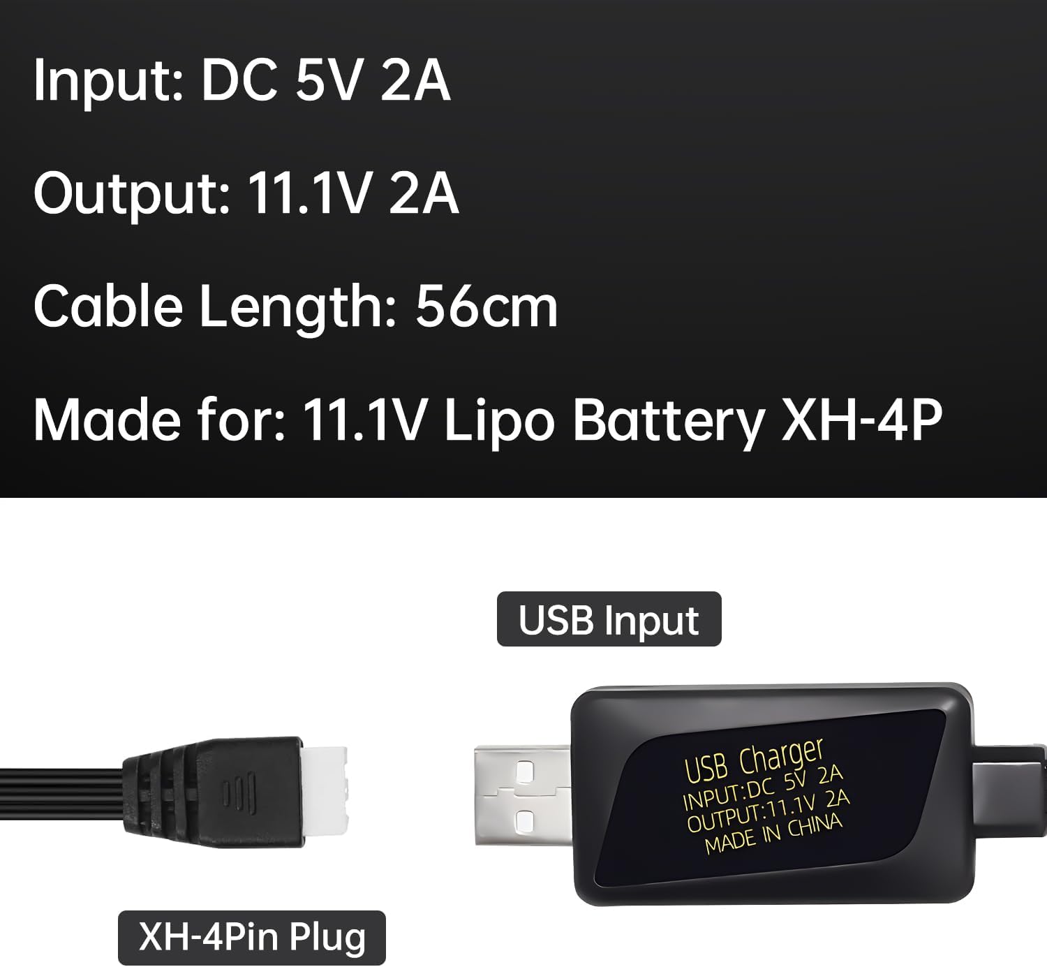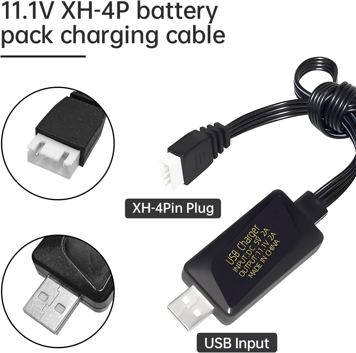 Spina connettore XH-4P bianca a 4 pin per batteria da 11,1 V per auto RC, droni, droni softair e camion e caricabatterie USB per batteria agli ioni di litio 11,1 V 3S Il cavo ha una resistenza al calore e una capacità di carico estremamente elevate, che possono raggiungere le massime prestazioni e sicurezza. LED rosso acceso: carica in corso, LED rosso spento: carica completa, interrompe automaticamente la carica quando è completamente carica. Lunghezza totale del cavo di ricarica USB: 56 cm (2,2 pollici) Lista del pacchetto: 2PCS USB cavo di ricarica.