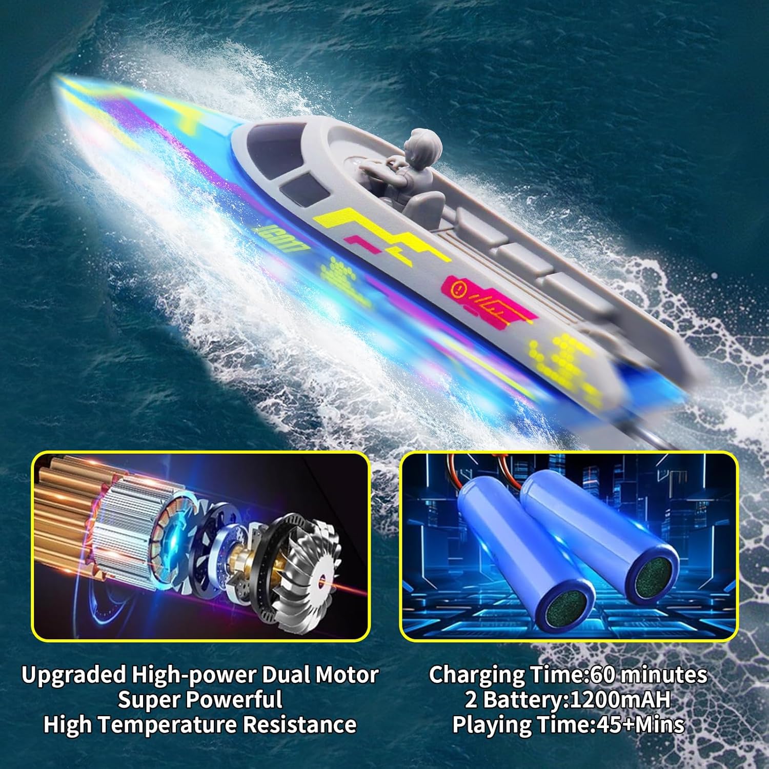 ✨【Luci Abbaglianti】: questa barca RC è dotata di 16 luci LED ad alta luminosità, che possono emettere luci colorate durante il giorno o la notte. Con il telecomando, è possibile accendere e spegnere liberamente gli effetti luminosi e spegnere le luci per risparmiare energia. 🔋【Prestazioni Eccellenti】: questo giocattolo da piscina è dotato di due batterie ricaricabili da 1200 mAh, ciascuna delle quali può funzionare per almeno 45 minuti. Ha un motore potente che può raggiungere una velocità massima di 20 chilometri all'ora. Si manovra bene anche in acque agitate, offrendo ai bambini un'esperienza senza precedenti. 🙌【Doppio Radiocomando】: La nostra barca telecomandata per bambini è dotata di radiocomando a 2,4 GHz e di telecomando a bracciale, che ha un segnale stabile, una forte capacità anti-interferenza e una portata effettiva fino a 50 metri. Quando la batteria è scarica e fuori dal raggio d'azione effettivo, il telecomando lampeggia di luce rossa per avvisare in tempo e impedire che il telecomando si spenga. ✅【Sicuro e resistente】: Realizzato in plastica ABS di alta qualità, resistente e antiurto, non è facile da danneggiare anche in caso di collisione accidentale. La struttura ad alta densità e l'anello di tenuta resistente alla pressione impediscono all'acqua di entrare. Il sensore di distanza dall'acqua è attaccato al fondo; quando la barca esce dall'acqua, la pala dell'elica smette di girare, prevenendo efficacemente i graffi e garantendo la sicurezza dei bambini. 🎁【Regalo ideale】: Che sia per compleanni, vacanze, Natale, Halloween, feste di famiglia o feste in piscina, le barca radiocomandata con luci LED sono i regali giocattolo più popolari per ragazzi e ragazze. Possono essere giocate in ambienti diversi come piscine, laghi e fiumi, garantendo il divertimento di più giocatori.