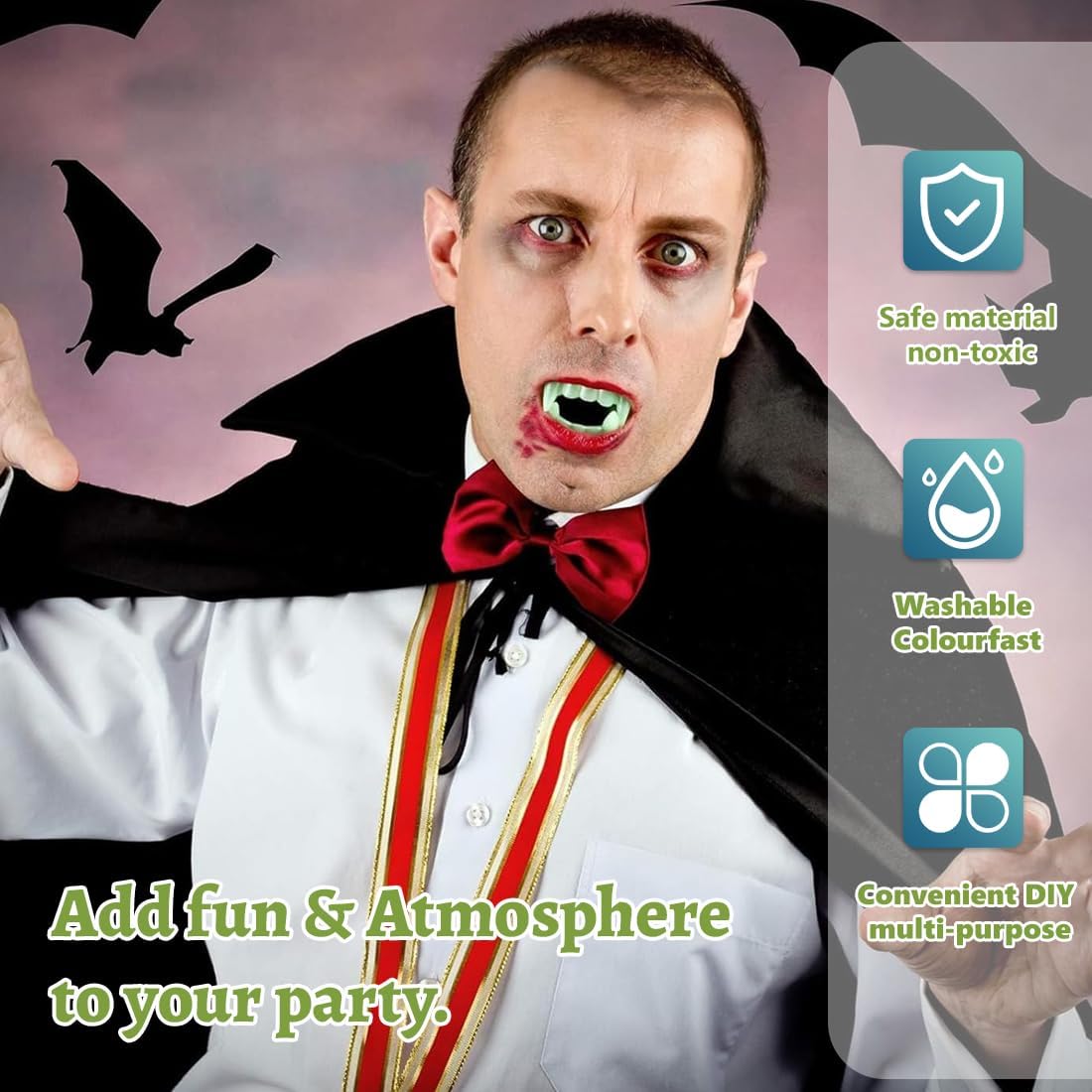 Perfetto per travestimenti: Ideale per Halloween, Carnevale o qualsiasi festa in maschera che richieda un look spaventoso. Completa perfettamente costumi da Dracula o vampiro, creando un'atmosfera autentica e memorabile Sicuro e atossico: Realizzato con materiali sicuri e specificamente progettati per l'uso nella zona orale. I genitori possono stare tranquilli, poiché i denti da vampiro sono adatti ai bambini e privi di sostanze nocive Design realistico: I denti da vampiro presentano un aspetto estremamente realistico, rendendo ogni costume da Dracula o vampiro un vero colpo d'occhio. Perfetti per chi desidera un travestimento autentico e dettagliato Materiale robusto e flessibile: Realizzati in plastica resistente e flessibile, questi denti garantiscono durata e comfort. Ideali anche per il gioco attivo dei bambini, mantenendo la loro forma senza deformarsi Facile da applicare: I denti da vampiro si fissano facilmente sui denti naturali, permettendo a bambini e adulti di trasformarsi in un vampiro in pochi istanti. Un accessorio pratico e divertente per ogni occasione