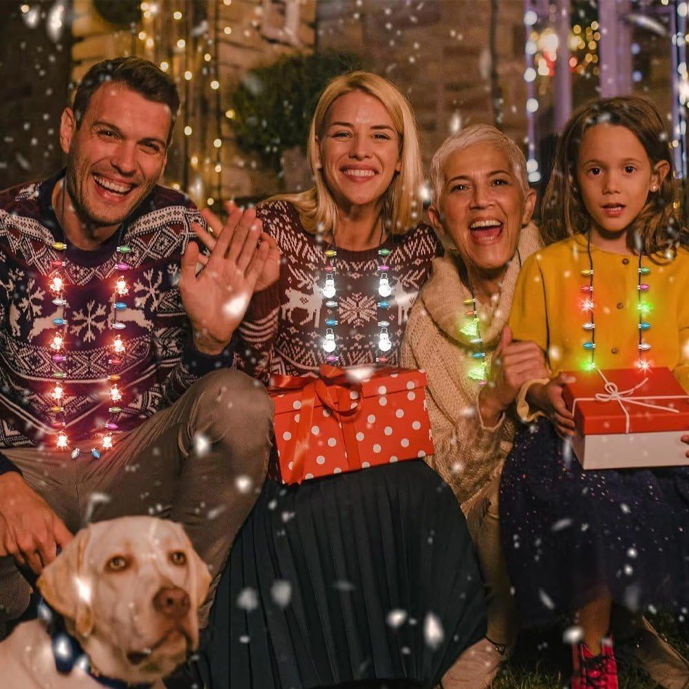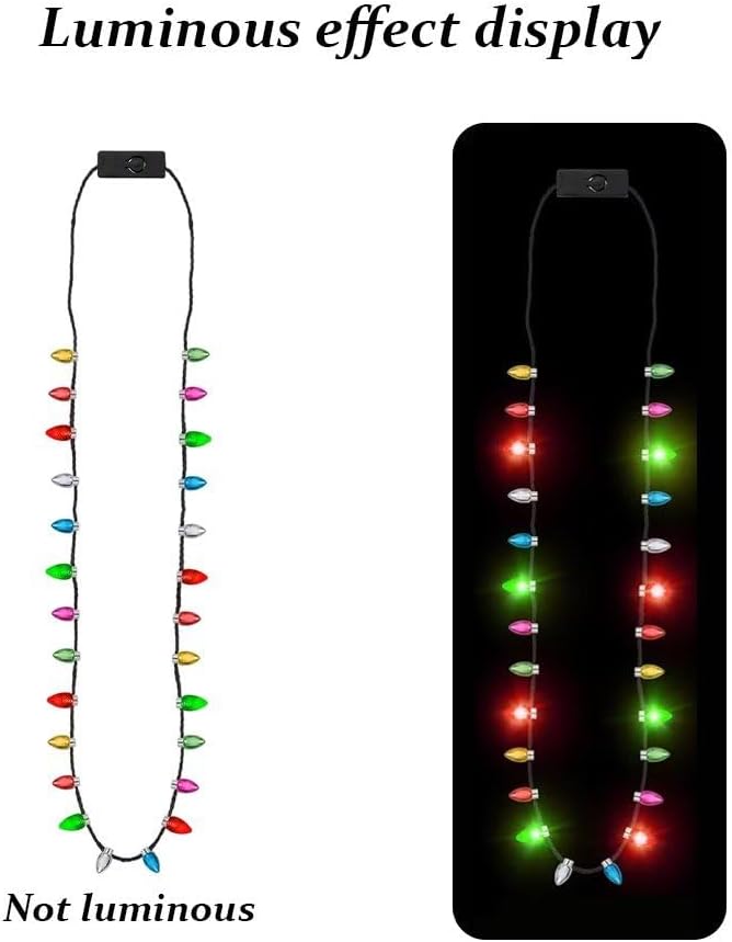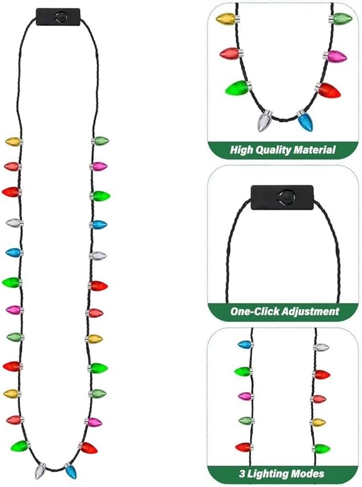 Forniture natalizie: collana natalizia Bulb è decorazione perfetta per le feste di Natale, le feste con i maglioni brutti e molto altro. Illumina il Natale. Sicure e di alta qualità: le collane luminose natalizie sono realizzate in PVC e perline LED. Il materiale è sicuro e di alta qualità, adatto a tutti. LED colorate: le lampeggianti per le feste di Natale possono essere impostate tra modalità di lampeggio veloce, lento e fisso. Design e dimensioni: i regalini per le feste di Natale sono progettati ispirandosi all'albero di Natale, Babbo Natale e pupazzo di neve. Le dimensioni sono adatte alla maggior parte delle persone. Cosa riceverai: una collana luminosa natalizia con lampadine. Una collana a LED colorata che ti farà trascorrere un Natale indimenticabile.