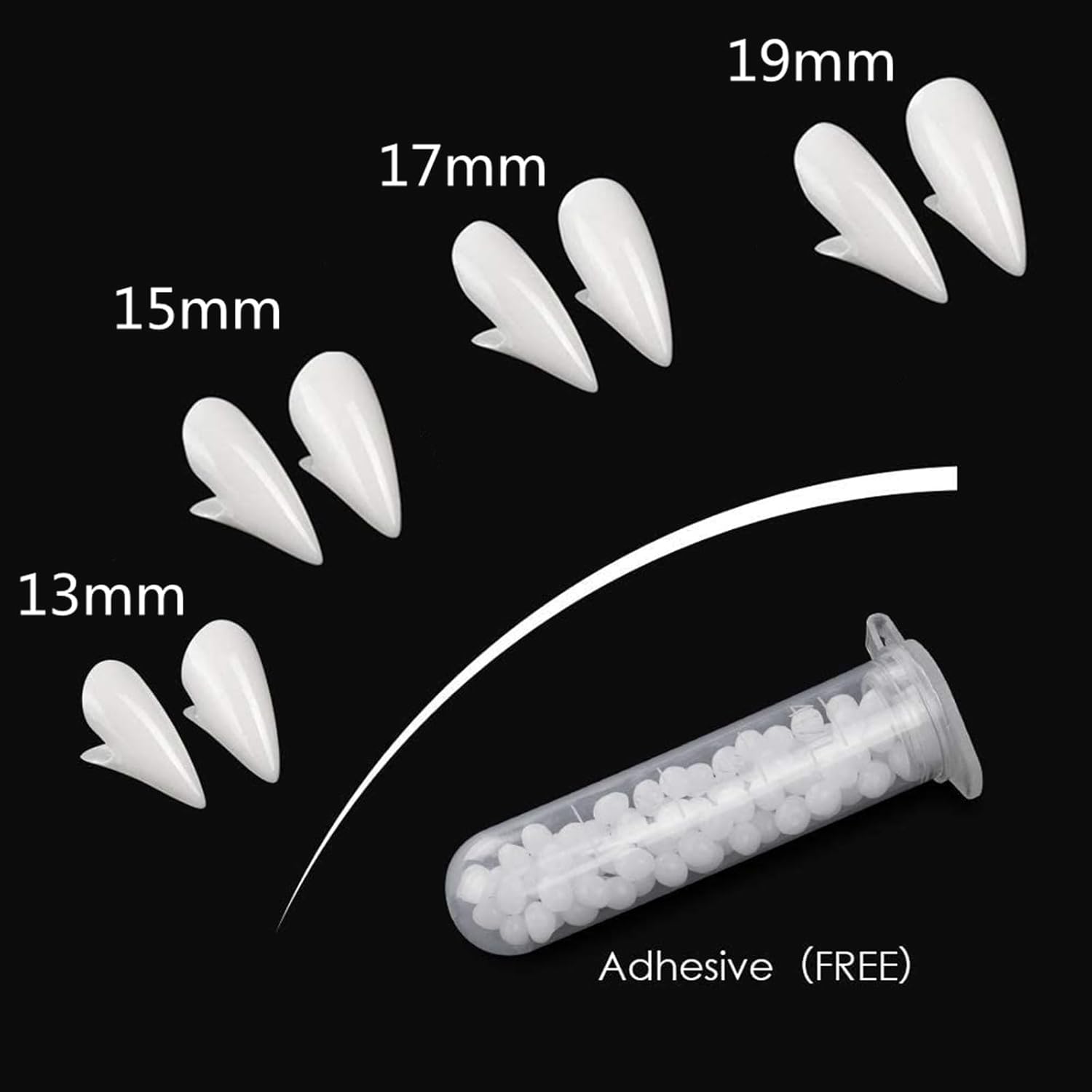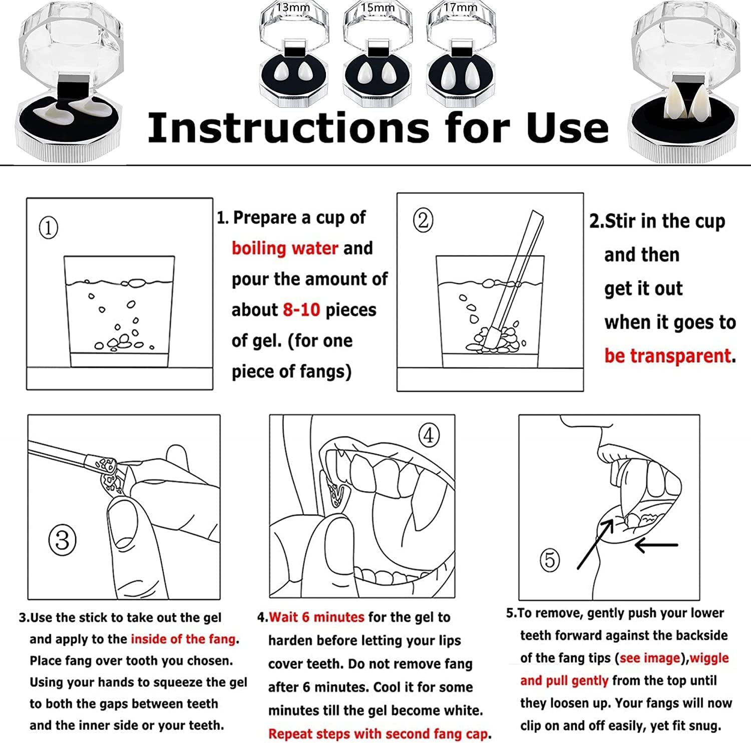 4 misure di denti da vampiro: 4 paia (13 mm, 15 mm, 17 mm e 19 mm) di zanne di diverse dimensioni e 1 tubo adesivo per particelle (non c'è bisogno di acquistare adesivo separatamente), che può adattarsi a denti di diverse dimensioni, per soddisfare le diverse esigenze di cosplay. Ideale per lupi mannari, cosplay di vampiri. Materiale di qualità: denti finti da vampiro di Halloween in resina, atossici e sicuri sui denti, insapore ed ecologico, sciacquare abbondantemente con sapone e acqua tiepida prima dell'uso. Facile da usare: riscaldare le perline adesive dei denti in acqua bollente fino a quando non diventano trasparenti, quindi mettere il gel nello slot delle zanne per creare uno stampo, infine, premere i denti finti sui propri denti per un po '(le perline adesive si raffreddano molto rapidamente, quindi è necessario maneggiarle rapidamente). Ottima idea per travestimenti di Halloween: queste protesi da vampiro sono ideali per giochi di personaggi delle feste e adatte per l'uso come accessorio per costume da vampiro, lupo mannaro, zombi e cosplay, possono anche essere inviati come regalo a sorpresa per familiari e amici. Comode e riutilizzabili: ogni paio di zanne da vampiro confezionato in una piccola scatola trasparente facile da trasportare e rende le protesi da vampiro riutilizzabili per molte volte.