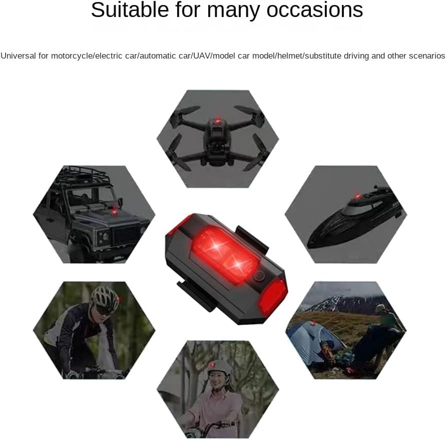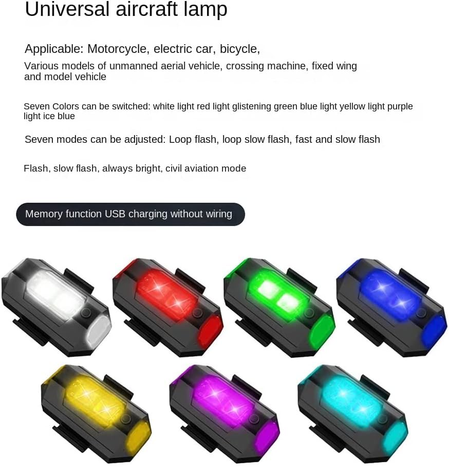 [Luci stroboscopiche per aerei] Le luci stroboscopiche a LED per aerei sono le più calde per gli appassionati di attività all'aria aperta per avere una corsa più fresca ed eccitata, le luci colorate attirano l'attenzione di tanti spettatori. Ti innamorerai di esse. [Luci anti-collisione per droni per notte] La mini luce stroboscopica è progettata per impedire ai droni di volare ciechi di notte. Visibile a 4,6 km. Visibilità a 360º dall'alto per i piloti aerei, che possono localizzare con precisione il drone e prevenire incidenti in aria. La lampada del drone non causa un carico aggiuntivo al drone. [Batteria a lunga durata e super] Il tempo di ricarica è di circa 1 ora, con indicatori di batteria, uscita fino a un uso prolungato e non preoccuparti di rimanere senza alimentazione durante il volo. Impermeabile: le luci stroboscopiche a LED per aerei sono state testate impermeabili. Non c'è bisogno di preoccuparsi che le luci della ruota della bici vengano danneggiate durante la guida, adatte a tutti i tipi di tempo, ma si prega di non metterlo in acqua troppo a lungo.