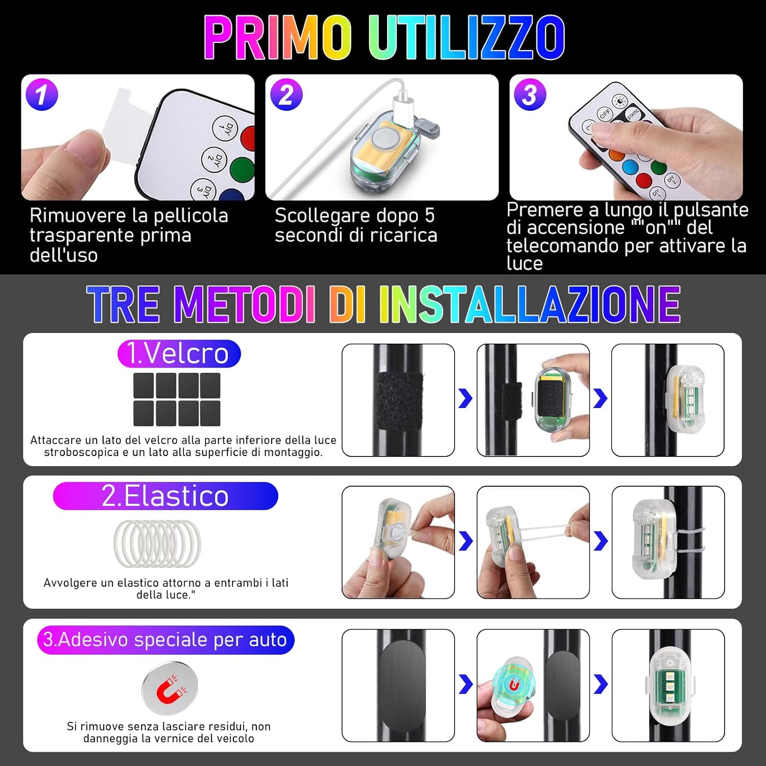 💡Stupisci i tuoi amici: attira immediatamente la loro attenzione e aumenta il tuo status. La nostra luce stroboscopica offre 8 colori e molteplici modalità. Ha bianco, rosso, verde, blu, giallo, viola, rosa, blu ghiaccio e molteplici modalità: flash di navigazione; flash stroboscopico; flash aereo; Ciclo a tre modalità di navigazione, strobo e aereo; luce flash SOS rapida; respirare la luce; lampeggiamento lento; luce lampeggiante; spia luminosa; Luce continua. Puoi controllare a distanza diversi colori e modalità in base alle tue esigenze. Fai risaltare la tua auto e rendila fantastica. 🔋Resistente e Ricaricabile: Lo stoppino con i suoi colori vivaci attira l'attenzione di notte. Basta collegarlo a una porta USB per una ricarica rapida. È completamente carico in 1,5 ore. Dura oltre 6 ore in modalità flash, nella modalità che consuma più energia, ad es. B. la luce rossa dura 2 ore e la luce bianca dura 4 ore. La durata effettiva può variare a seconda delle diverse modalità. 💡Installazione semplice: basta sostituire la chiusura in velcro/magnetica nella posizione desiderata e inserirla. Dotato di elastici per rinforzo aggiuntivo oltre a velcro e magneti. Inoltre, la superficie liscia si abbina a qualsiasi arredamento, rendendolo non solo funzionale ma anche elegante. Facilmente rimovibili e riposizionabili, queste luci si adattano al tuo stile di vita, rendendo ogni momento un po' più luminoso! 💡AMPIE APPLICAZIONI: le luce stroboscopica possono essere installate in luoghi bui come braccioli, contenitori, portiere di auto, aree salotto, ecc. Sono adatte anche come lampade da comodino, luci per armadio, lampade da lettura e luci per zaino. Possono essere posizionati ovunque nella stanza e con essi è possibile illuminare qualsiasi luogo buio. Il suo design compatto e leggero lo rende facile da installare e spostare, offrendo flessibilità nell'illuminazione di diversi spazi. La luce morbida e delicata che emette è rilassante per gli occhi e crea un'atmosfera piacevole ovunque venga posizionata. 💧IMPERMEABILE IP67: le nostre luci lampeggianti sono testate per l'impermeabilità. Guidando sotto la pioggia, non preoccuparti che le luci vengano danneggiate. Sono adatti a tutte le condizioni atmosferiche, ma si prega di non lasciarli in acqua troppo a lungo. Proteggi le tue luci lampeggianti dall'umidità eccessiva per garantirne la longevità. Goditi la sicurezza e la visibilità che offrono senza preoccuparti della pioggia o degli spruzzi d'acqua. 💡COMPORTAMENTO RESPONSABILE E SOSTENIBILE: in quanto azienda responsabile, Fxlpower aderisce a elevati standard ambientali e sociali. Ci impegniamo a integrare la sostenibilità nelle nostre pratiche commerciali, sia internamente che con i nostri fornitori. La mini luce stroboscopica Fxlpower viene fornita con una garanzia di 12 mesi.