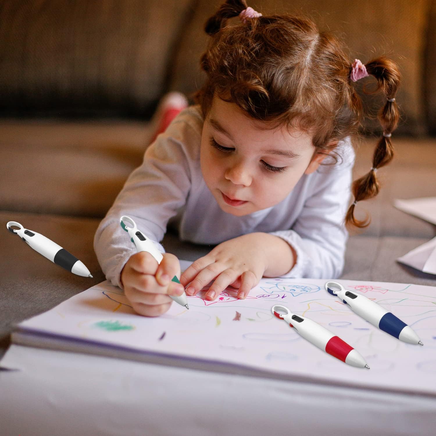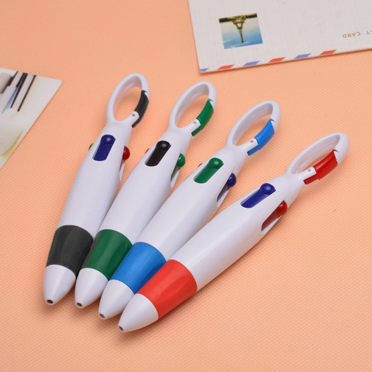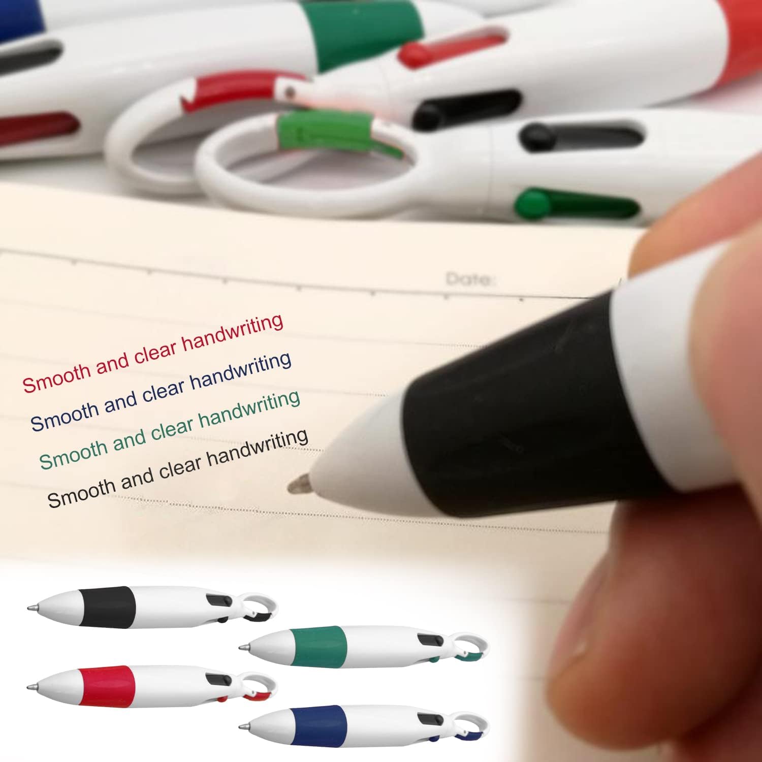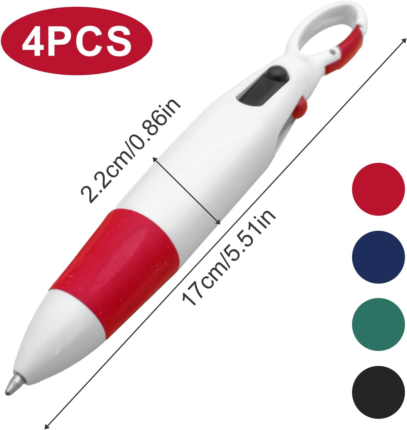 Penna a sfera 4 in 1: ogni penna a sfera ha 4 colori: nero, blu, rosso e verde, che può cambiare colore facilmente e bene, molto adatta per segnare, prendere appunti e migliorare l'efficienza del lavoro. Materiale di alta qualità: la custodia per penna a sfera è realizzata in materiale plastico ABS ecologico, resistente e non facile da rompere, inchiostro ecologico e sicuro, scrittura liscia, fornendo un'esperienza di scrittura facile. Facile da trasportare: la parte superiore della nostra penna a sfera retrattile è progettata con un moschettone, che può essere appeso alla borsa o alla tasca, e può essere appeso al collo con un cordino nero, che è facile da trasportare e non facile da perdere. Design unico: morbido rivestimento in silicone del corpo della penna, texture antiscivolo, impugnatura comoda, scrittura di lunga durata senza fatica, design retrattile, facile da usare premendo l'inchiostro selezionato. Vari usi: questa penna a sfera multicolore è perfetta per l'ufficio, l'aula come strumento di scrittura, che aiuta a evidenziare i punti chiave nel testo o nelle note o nel codice colore.