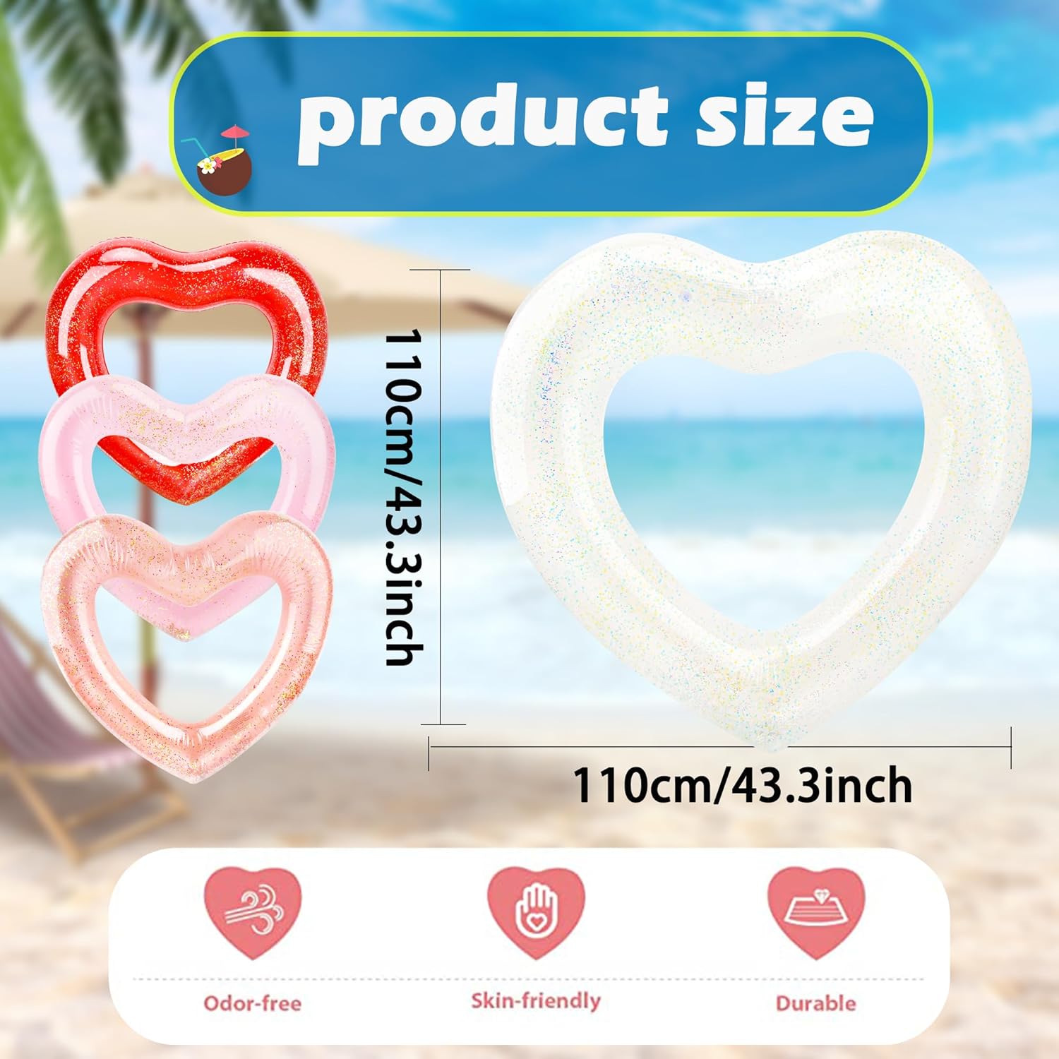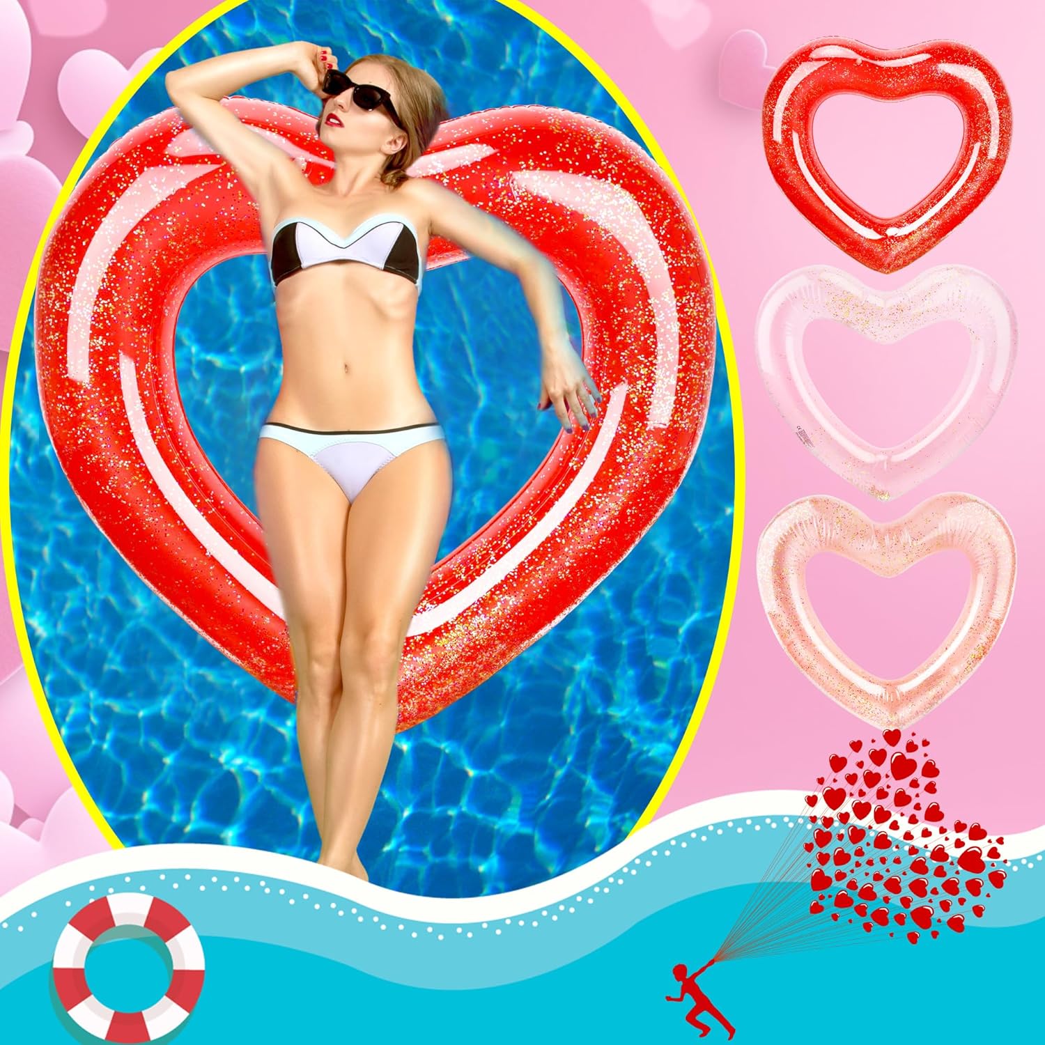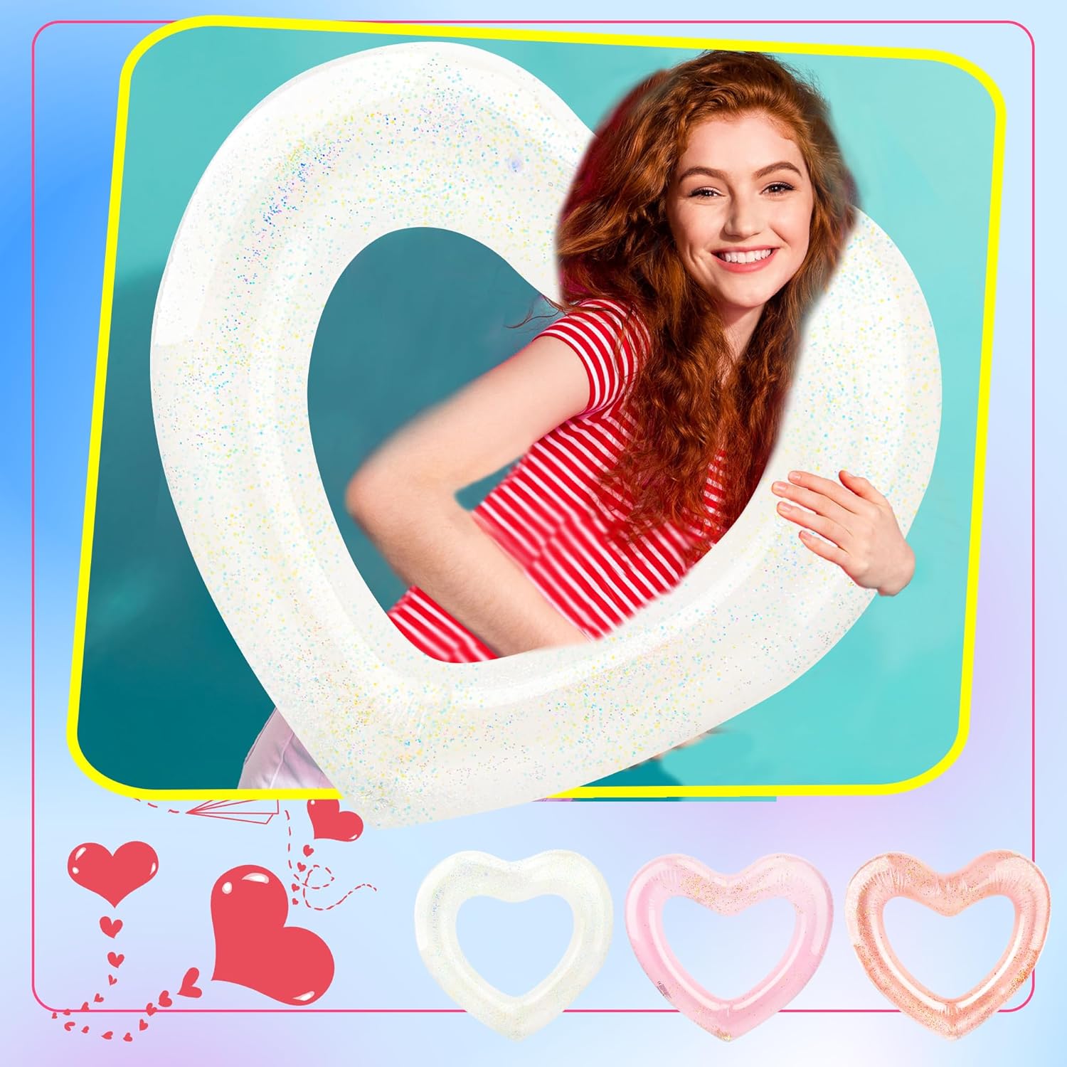 Contenuto della confezione: riceverai 8 cerchi gonfiabili a forma di cuore, sono pratici giocattoli da piscina per feste in piscina e in spiaggia Ampia applicazione: gli anelli da nuoto a forma di cuore gonfiabili sono molto adatti per piscine, spiagge, feste di compleanno, attività nel parco acquatico, oggetti di scena per performance, decorazioni per piscine, regali estivi, ecc., rendendo la tua estate piena di vitalità e aggiungendo più divertimento Design a forma di cuore con paillettes: il tubo da nuoto gonfiabile ha un design unico a forma di cuore, e ci sono anche paillettes all'interno, che sono scintillanti, dall'aspetto più alla moda e attraente, consentendo di attirare facilmente l'attenzione degli altri, usarlo per aggiungere più divertimento alla tua festa in piscina, adatto per soddisfare le tue esigenze di festa e un'esperienza piacevole e appagante Grandi dimensioni: il diametro esterno del salvagente gonfiabile è di circa 120 x 100 cm e il diametro interno è di 55 x 47 cm, che è abbastanza grande e ha una forte capacità portante, adatto per adulti per giocare in piscina Materiale del PVC: il galleggiante gonfiabile per piscina a forma di cuore è realizzato in PVC spesso Realizzato con materiali, pregevole fattura, durevole, impermeabile, sicuro da usare, buone prestazioni di cucitura interna, anti-estrusione e strappo, consentendo di resistere facilmente alla galleggiabilità in acqua e goderti il divertimento dell'estate