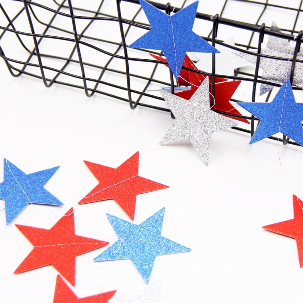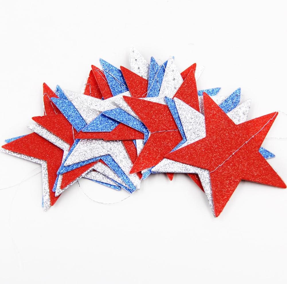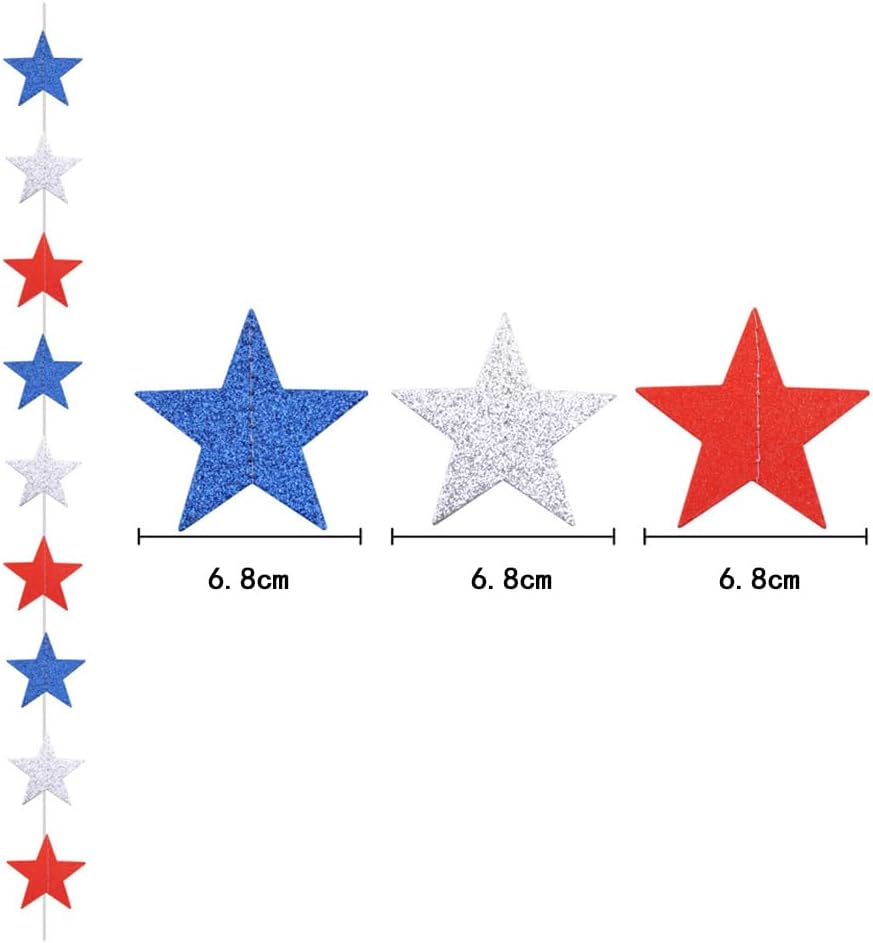 Materiale: Stella di carta diametro 6,8 cm, lunghezza totale 2 m Contenuto della confezione: 4 pezzi Può essere decorato su soffitti, tavoli, finestre, ecc. Adatto per feste del Giorno dell'Indipendenza, 4 luglio, decorazioni per feste patriottiche americane, accessori per la laurea
