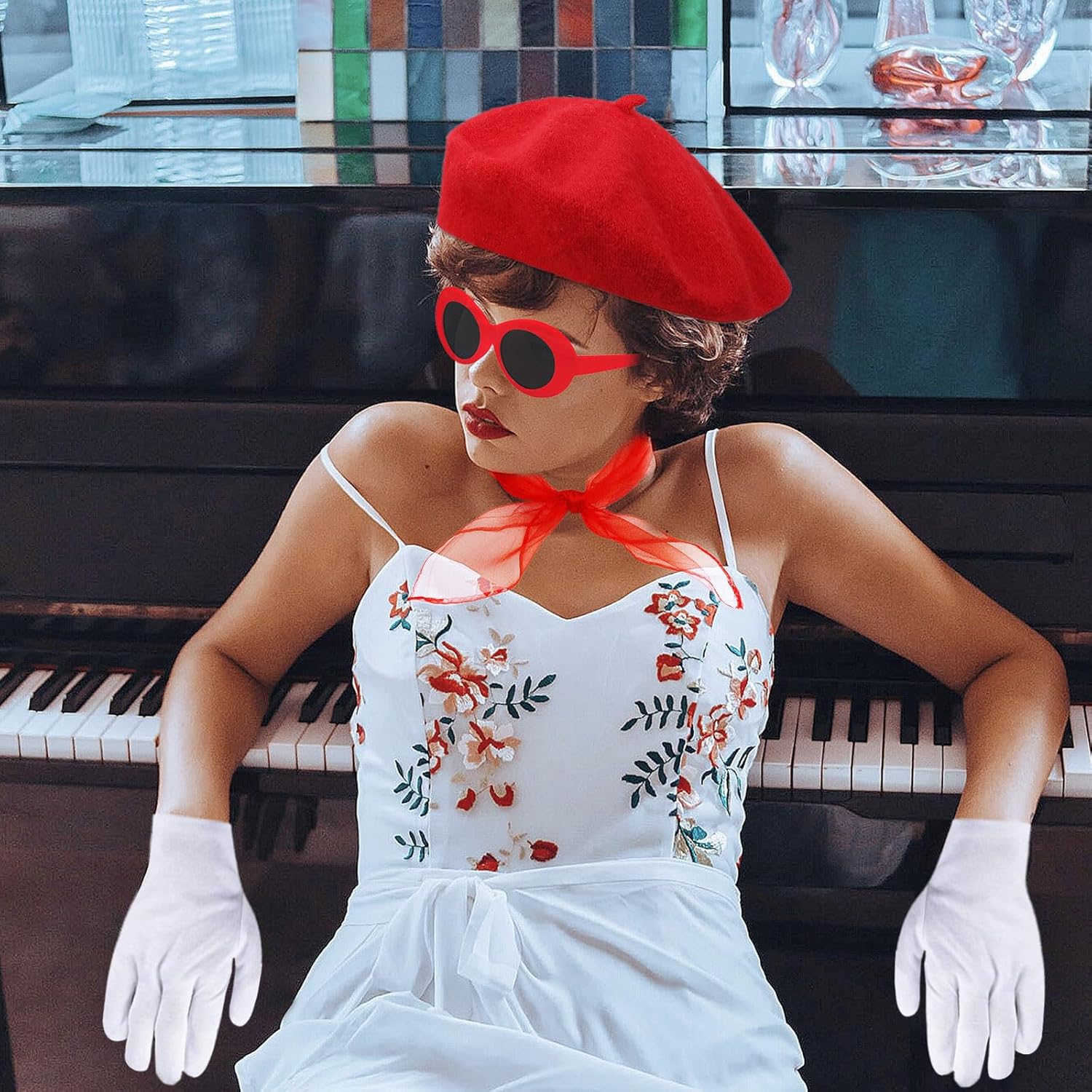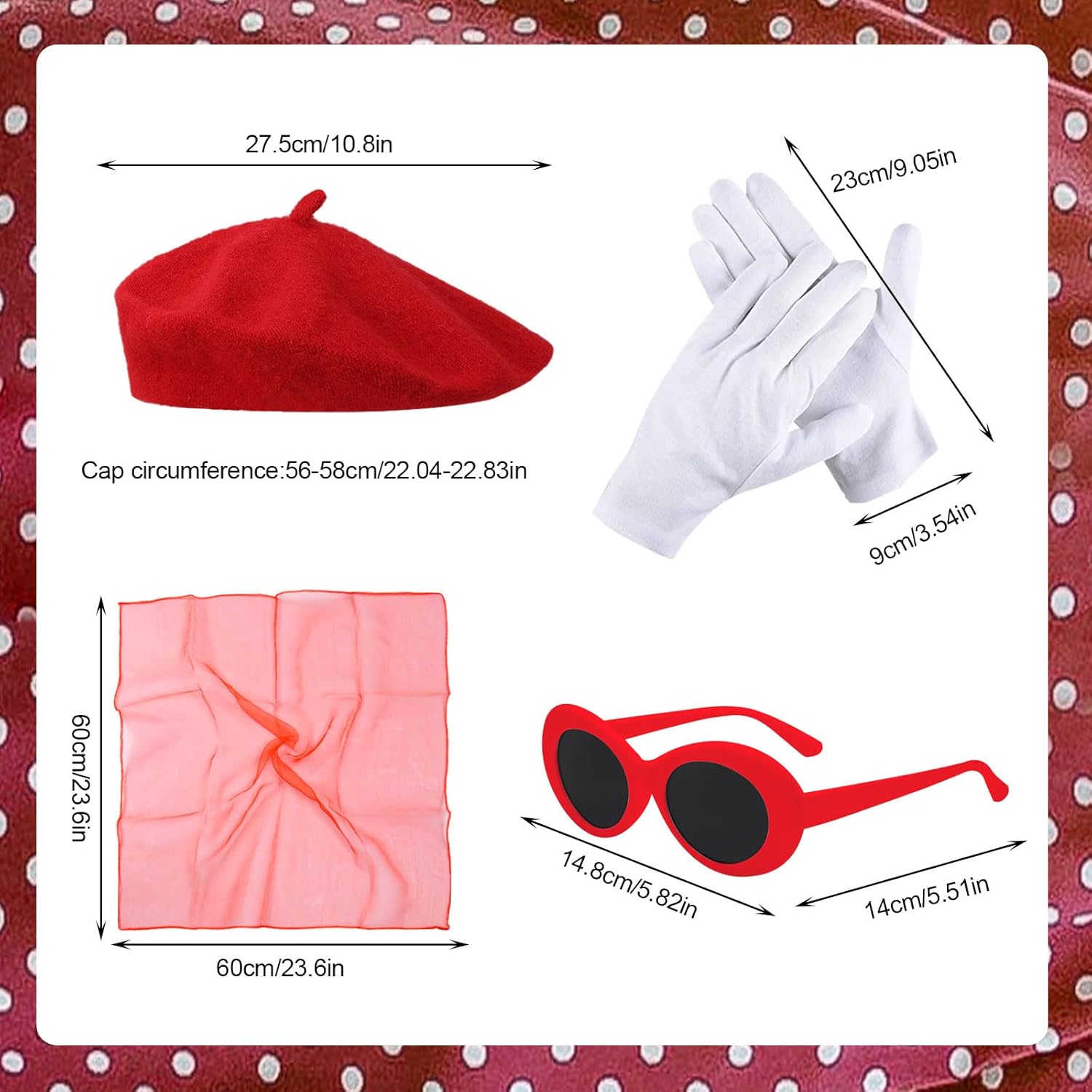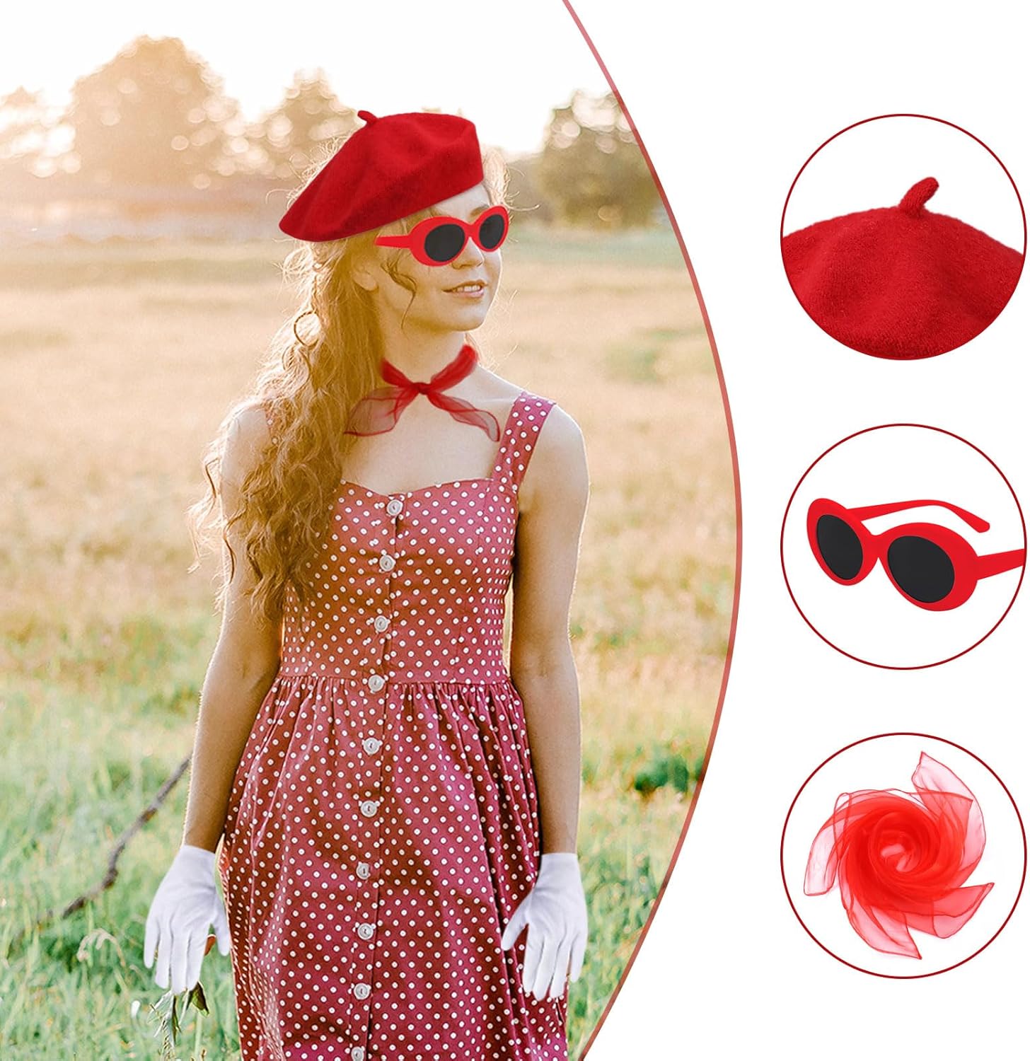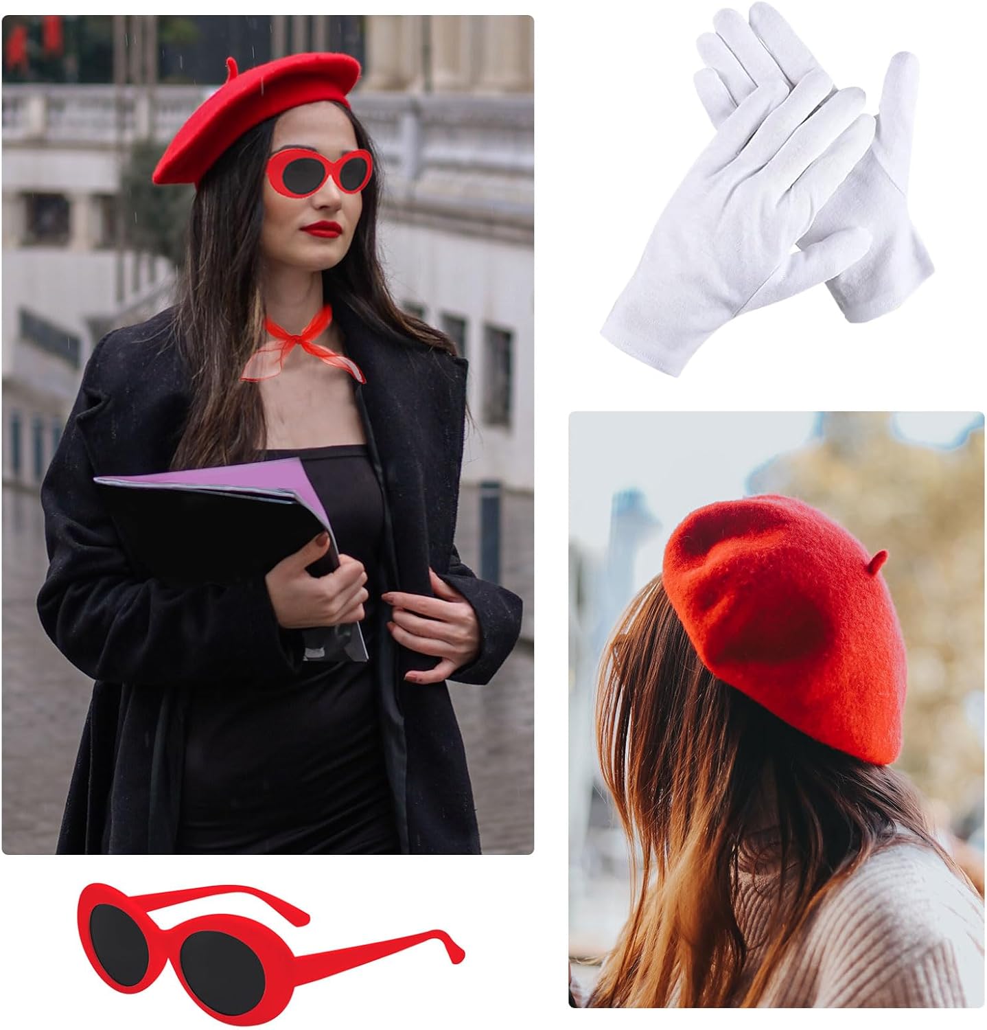 Il pacchetto include: riceverai un berretto rosso, occhiali da sole, una sciarpa e un paio di guanti. Questo set è squisitamente realizzato con accessori completi per soddisfare le tue esigenze di abbigliamento. Puoi combinarli tutti o singolarmente in base a diverse feste a tema o abbigliamento quotidiano. Alta qualità: sciarpa realizzata in tessuto chiffon, sensazione di seta e traspirante, il classico berretto rosso è realizzato in nylon, morbido, confortevole, elastico, molto adatto per l'uso quotidiano e per le occasioni importanti. Gli occhiali sono fatti di plastica, non facili da rompere e sbiadire. Non preoccuparti più delle dimensioni: il kit mimo dell'artista francese è adatto alla maggior parte delle persone da indossare comodamente. Il cappello ha elasticità e può espandersi da 21 pollici a 23 pollici. I guanti attaccati sono progettati per essere umanizzati, che possono adattarsi bene alla mano. Indossa un berretto rosso, una sciarpa e un paio di occhiali e diventa un'elegante mamma francese! Classico e personalità: set di costumi da donna francesi Progettato specificamente per gli appassionati di francese, non solo può essere indossato in feste a tema specifiche, ma può anche essere utilizzato in modo flessibile in abiti quotidiani, rendendo il tuo outfit più a strati. Adatto a varie occasioni: il set di costumi per feste a tema cosplay è adatto a varie occasioni. È un'ottima scelta di abbigliamento e oggetti di scena per partecipare a feste di trucco, feste a tema francese, spettacoli teatrali, feste di cosplay, carnevali e altre attività.
