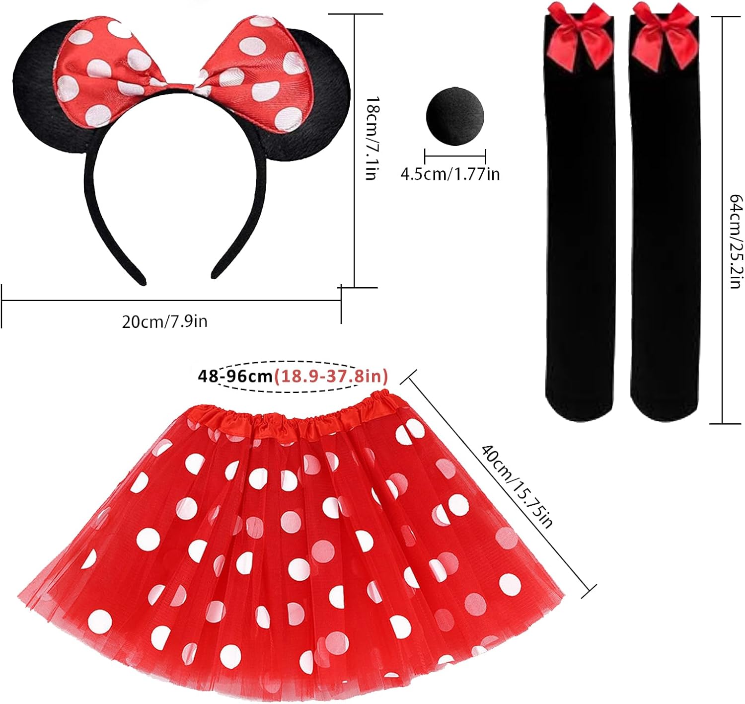 Descrizione prodotto Caratteristiche: 1.Il design delle orecchie e del naso del mouse è molto creativo e molto carino. 2.Il set di costumi da topo è adatto a varie feste ed è un supporto adatto per scattare foto. Specifiche del Prodotto: Materiale: Poliestere. Dimensioni: Come Mostrato Nell'Immagine. Colore: Come Mostrato Nell'Immagine. Pacchetto Incluso: 1 * Fascia per Orecchie da Topo. 1 * Naso di Topo. 1 * Tutù Rosso con Pois Bianchi. 1 * Calze con Fiocco Rosso. Nota: 1.Si prega di consentire una leggera differenza dimensionale dovuta alla diversa misurazione manuale. 2.Il colore del prodotto può variare leggermente dall'immagine a causa delle diverse impostazioni di illuminazione e schermo. 3.Se hai domande sulla qualità dei nostri prodotti, contatta il servizio clienti e saremo lieti di consigliarti. Avviso di sicurezza 1