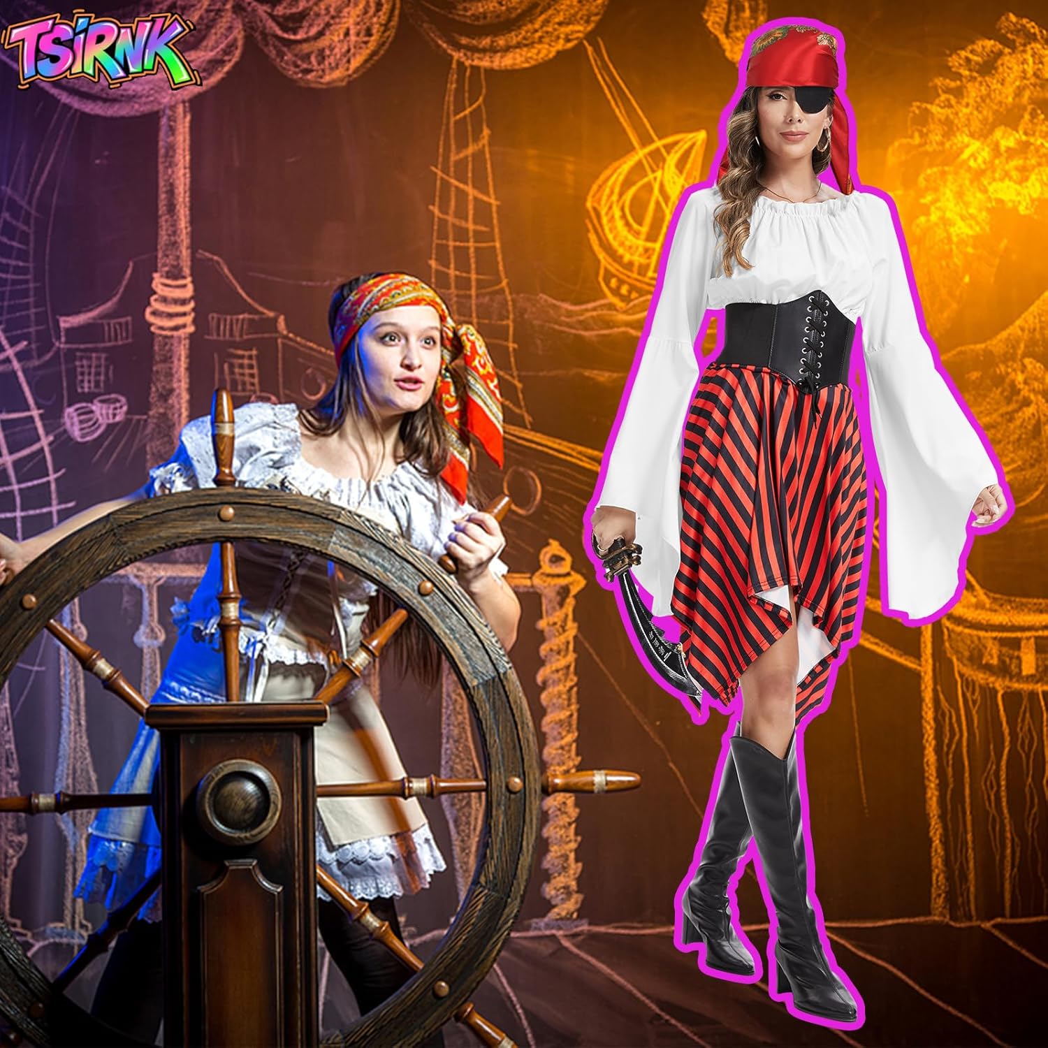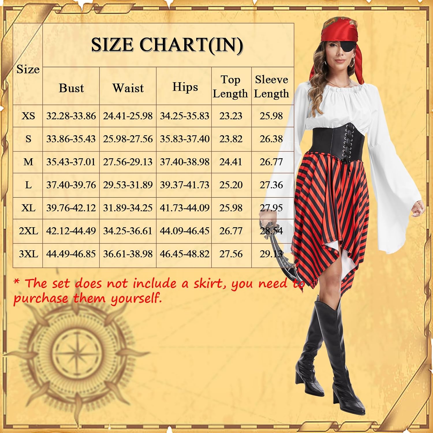 Descrizione prodotto TSIRNK 4 pezzi costume da pirata da donna - costume medievale vichingo da donna con spalle scoperte con accessori da pirata, per Halloween e Carnevale Avviso di sicurezza Non applicabile