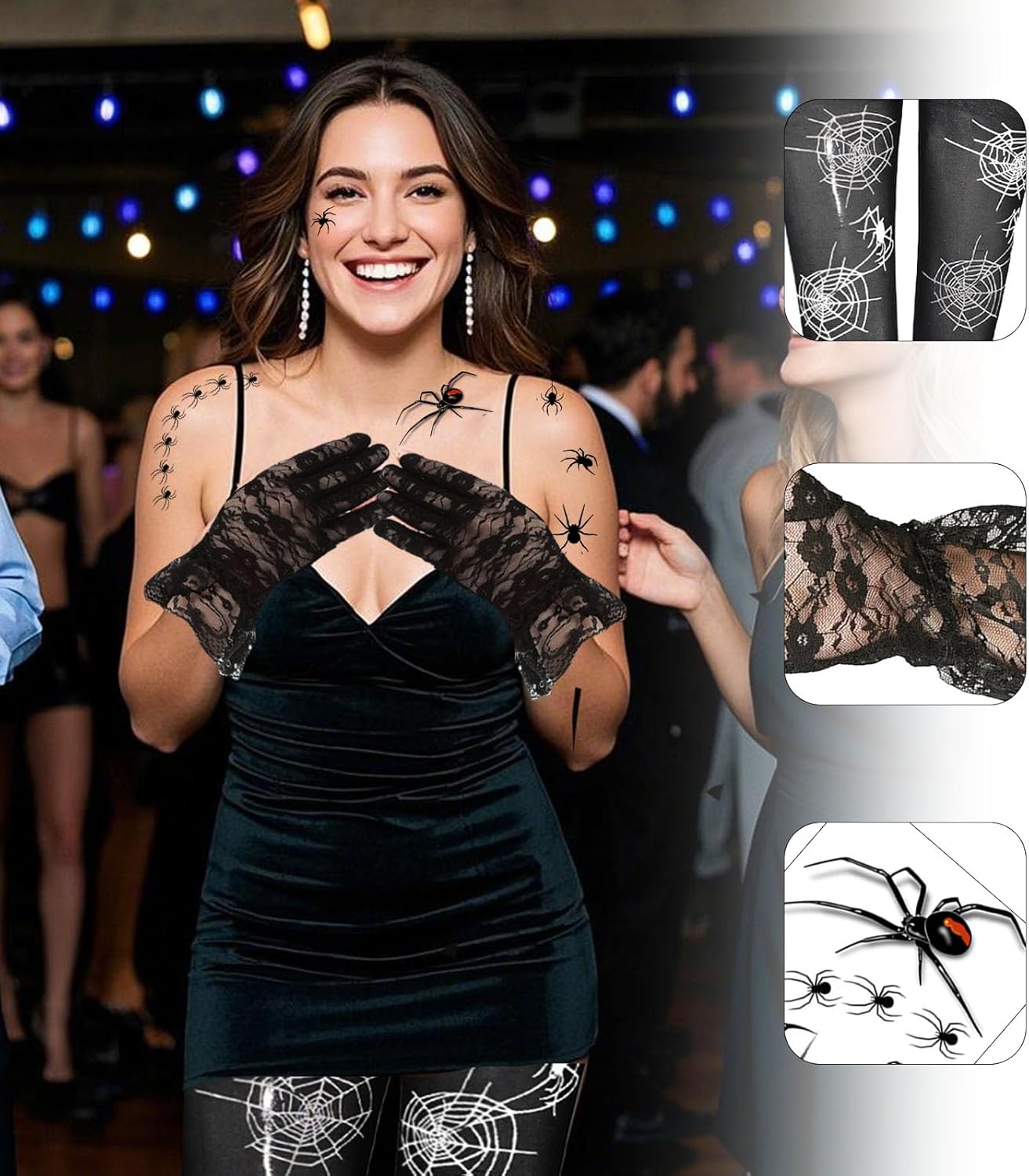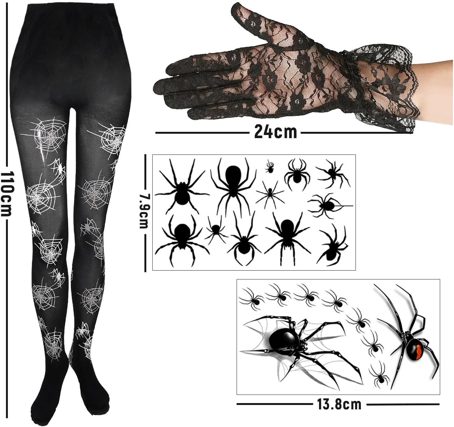 Costume da ragno unico per Halloween: il nostro set da 4 pezzi di costume da ragno da donna include collant, guanti in pizzo nero e tatuaggi facciali ragni, ideale per un accattivante outfit di Halloween o carnevale Eleganti collant a ragnatela: i collant appositamente progettati per ragnatele sono perfettamente stampati con ragnatele bianche e ragni, leggings a ragnatela con una lunghezza di 110 cm/43,3 pollici, per dare al tuo look un tocco spaventoso ma elegante Eleganti guanti in pizzo nero: i guanti in pizzo senza dita completano il vostro costume da ragno e garantiscono un elegante stile gotico. Sono comodi e allo stesso tempo offrono un tocco di raffinatezza Versatile per diverse occasioni: ideale per costumi di carnevale, cosplay e con il nostro costume da ragno farete sicuramente una dichiarazione a qualsiasi festa di Halloween o festività Dress Up perfetto per notti spaventose: questo set non è adatto solo per Halloween, ma anche per la caccia ai fantasmi, idee di trucco spaventose o semplicemente per entrare nel ruolo di streghe e vampiri