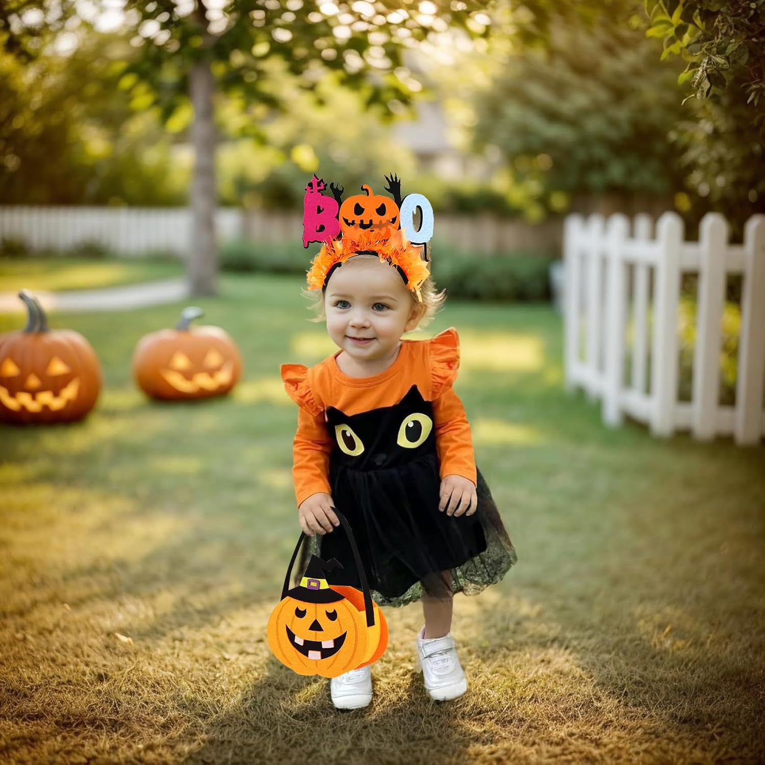 Descrizione prodotto Set di quattro costumi di Halloween per bambini: include un costume da zucca per bambini, una fascia per capelli di Halloween, una borsa per dolcetto o scherzetto e un paio di calzini antiscivolo. Trasforma il tuo bambino in un'adorabile zucca questo Halloween! Avviso di sicurezza No