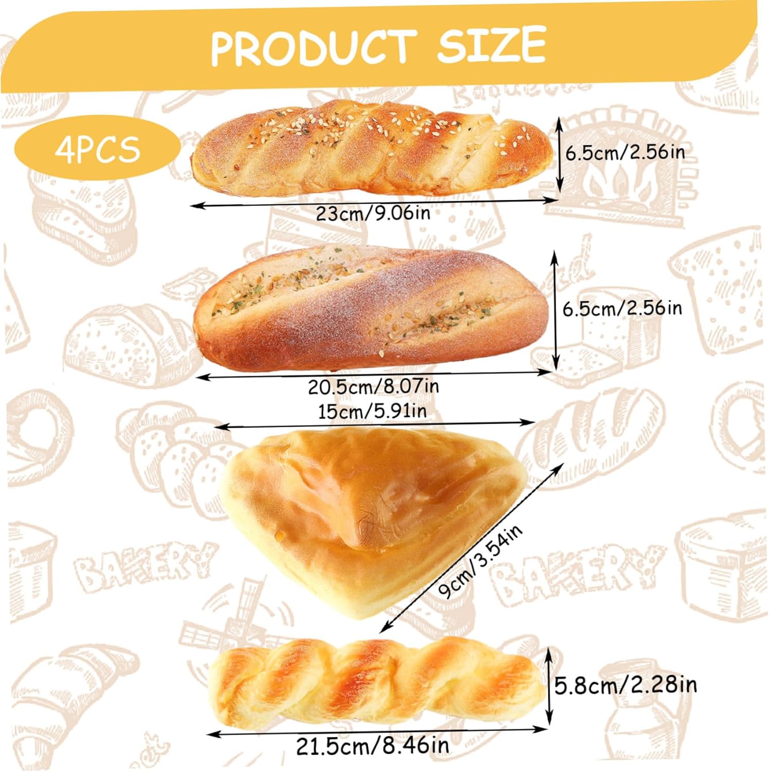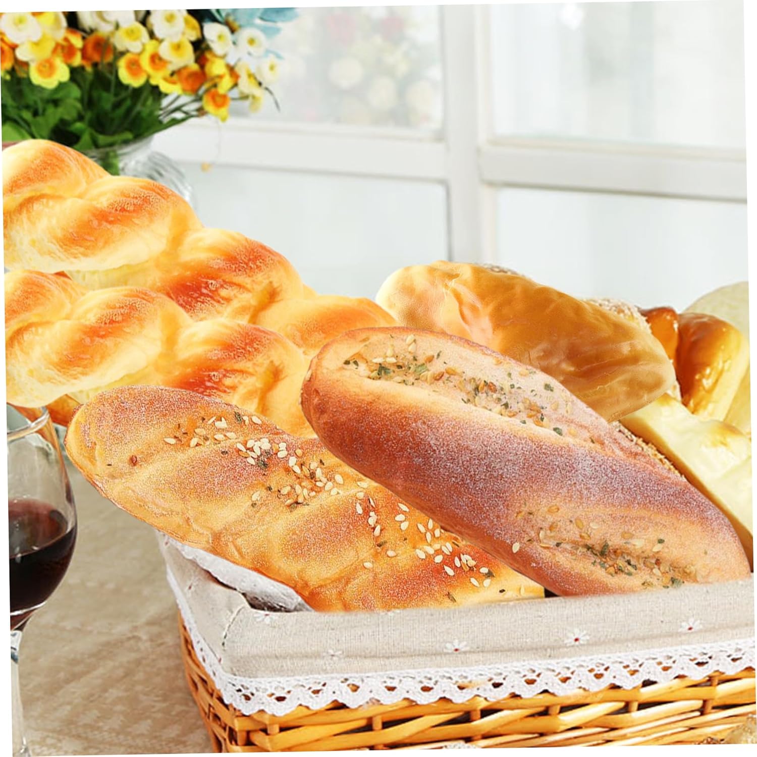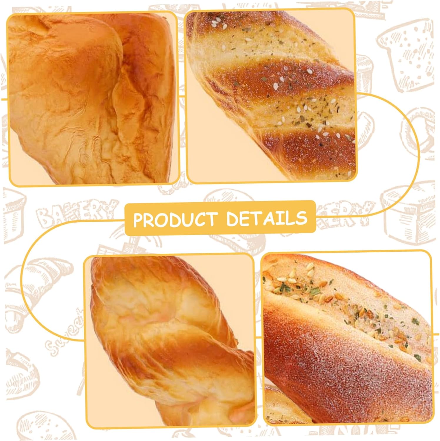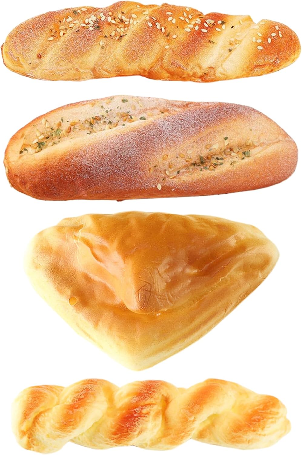 Materiale PU durevole: realizzati in schiuma PU, questi accessori per il pane sono morbidi, leggeri e resistenti..Sono progettati per mantenere la loro forma e avere un bell'aspetto nel tempo, rendendoli ideali per esposizioni a lungo termine o come oggetti di scena per eventi a tema. Perfetto come: questi modelli di pane da 4 pezzi sono unici e divertenti per chiunque ami l'arredamento eccentrico della casa, la fotografia o gli articoli a tema alimentare..Ideali per compleanni, inaugurazioni di case o come novità per i collezionisti, porteranno sicuramente un sorriso sul volto di chiunque. Perfetto per fotografie e oggetti di scena: che tu stia organizzando un servizio fotografico o creando una scena ispirata alla panetteria, questi pani sono perfetti per aggiungere un tocco affascinante e realistico..I loro colori vivaci e la consistenza realistica li rendono una scelta eccellente per i fotografi professionisti o dilettanti. Divertenti decorazioni per la casa e la cucina: usa questi accessori per il pane come decorazioni originali per la tua cucina o sala da pranzo..Aggiungono un tocco stravagante e affascinante all'arredamento della tua casa e il loro design realistico li rende uno spunto di conversazione per gli ospiti. Aspetto realistico: questi modelli di pane 4PCS sono progettati per assomigliare proprio al vero pane, offrendo dettagli incredibili e consistenza realistica..Perfetti per fotografie, esposizioni o per aggiungere un tocco divertente all'arredamento della cucina di casa, questi articoli di pane finto inganneranno chiunque con il loro aspetto realistico.